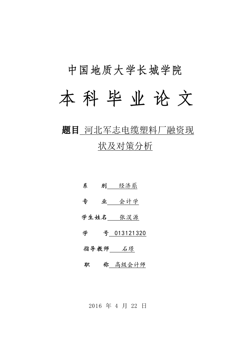 中国地质大学长城学院本科毕业论文题目河北军志电缆塑料厂融资现状及对策分析系别经济系专业会计学学生姓名学号013121320指导教师石璟职称高级会计师2016年4月22日中国地质大学长城学院本科毕业论文文献综述系经济系专业:会计学姓名:张淏源学号:0131213202016年4月22日尽管发达国家拥有相当成熟的金融市场,社会投资资金也很充裕,但也会面临中小企业融资困境的问题,而中小企业因为融资困难而倒闭已经成为了一种普遍的社会现象。发达国家的学者们对中小企业的融资困境的研究已经经历很长时间,在各方面的研究都己趋于成熟,而我国对中小企业的研究以及政策性扶持效果研究都相对落后。所以在研究国内中小企业融资困境问题的时候,国外相关的研究的成果和政策经验对国内研究有很好的借鉴意义,国外学者对中小企业融资理论的研究,可以为国内中小企业融资问题提供重要的理论支撑。但是,还要认清国外的市场环境与国内还是有很大差距的,国外的研究者是建立在成熟的市场条件下的,国内的市场并不成熟,政府参与、计划性的资源配置较强,因此借鉴的同时还要认清两者的差异。2012年4月初,美国总统奥巴马签署颁行的《创业企业扶助法》(J0 BS Act,以下简称“乔布斯法”)试图应对解决的是中小企业融资难题,这是全世界不论发达经济体还是新兴经济体普遍遭遇的难题。乔布斯法涉及到多项证券监管改革措施,整体基调是放松监管,这与2008年以来全球金融监管普遍加强的趋势有所不同。乔布斯法的颁行在美国乃至全球许多国家引发了巨大反响。英国、一些欧元区国家、日本等都相继表达了出台类似法律的呼声。联想到2002年美国颁布“萨班斯-奥克斯利法”后许多国家纷纷跟进的现象,乔布斯法确实值得追踪研究。乔布斯法的内容相当系统全面,但解决的核心问题只有一个,即企业(特别是中小企业)如何通过证券市场和民间资本等融资渠道,获得支持发展的充分资金来源。法律所赋予的手段包括:简化P0发行程序、降低信息披露义务、减轻审计成本、增加公众认知度等。如美国小企业发展中心1998年编著的《中小企业的困境与对策:美国55位专家的解决方案》一书中就提到了发展风险投资、建立资本市场体系、完善信贷担保体系、利用商业信用、应收账款和租赁融资等多种拓宽中小企业融资渠道的有效途径。相关的融资理论研究始于20世纪50年代,以戴维、杜兰德为代表的西方经济学家提出了净收益理论,营业净收益理论和传统理论,它们构成了早期资本结构理论。早期资本结构理论的三种观点的差异实质上是因为各种理论所基于的假设不同而引起的,而这些假设又只是对企业所有者行为的一种假设,并没有经过科学的推导和分析,缺乏一定的说服力。1958年,米勒(Mi11er)教授与莫迪格莱尼(Modigliani)教授在其论文《资本成本、公司理财和投资管理》中提出了M理论,这也是最早的企业融资结构理论。MM理论是在一定的假设基础上做出的资本结构模型,是现代资本结构理论的主要内容,标志着现代企业融资理论的形成。该理论所要解决的是企业市场价值与融资结构的关系问题,认为在某些给定的条件下,存在着使企业价值最大化的最优资本结构。最初的理论运用套利原理,证明了在资本市场完全信息,投资者一致预期和不考虑税收影响等假设条件下,企业的融资结构与其市场价值无关。其后二人又对理论进行了修正,引入了所得税的影响。对于解决我国中小企业的融资问题,国内的理论研究进入了个新的阶段。其中,以中国社会科学院中小企业研究中心陈乃醒教授写的《中国中小企业发展与预测》一书和中国小企业发展战略研究课题组组长俞建国教授主编的《中国中小企业融资》报告较为综合,前者对我国中小企业而临的融资问题做了详细的论述,重点提出了完善资本市场