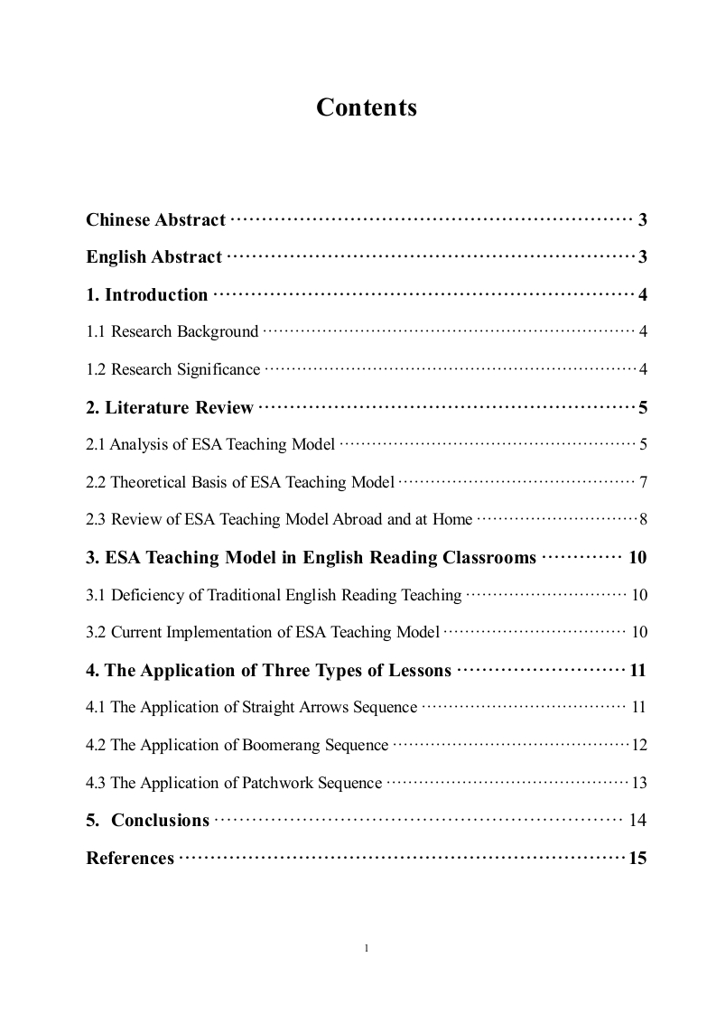 ContentsChinese Abstract............…3English Abstract.....…3l.Introduction……41.1 Research Background........…41.2 Research Significance................…42.Literature Review..............…52.1 Analysis of ESA Teaching Model..................................52.2 Theoretical Basis of ESA Teaching Model............................................72.3 Review of ESA Teaching Model Abroad and at Home..........................83.ESA Teaching Model in English Reading Classrooms............103.1 Deficiency of Traditional English Reading Teaching..103.2 Current Implementation of ESA Teaching Model........104.The Application of Three Types of Lessons..................114.1 The Application of Straight Arrows Sequence..........114.2 The Application of Boomerang Sequence....124.3 The Application of Patchwork Sequence............................…135.C0 nclusi0ns…14References…l51ESA教学模式在初中英语阅读教学中的应用摘要英语阅读是巩固英语语言知识的重要途径,也是获取信息的重要途经,学习者在阅读课中的参与情况对学习效果有着举足轻重的影响。然而在当前的初中英语阅读课的学习中,学生往往处于一种被动的学习状态:阅读兴趣不高、阅读效率低下。在这种情况下英国教育家杰里米·哈默提出了SA教学模式,即在英语教学中投入、学习和应用三种要素必不可少,根据此三种要素顺序变换和不同组合,创造三种不同的教学模式。本文把SA教学模式结合在初中英语阅读课教学中的具体应用加以阐述,探究SA理论在实际阅读教学中的可行性。关键词:英语阅读;SA教学模式;初中英语The Application of ESA Teaching Model inEnglish Reading of Junior Middle SchoolAbstractEnglish reading is an important way of getting information as well as consolidating Englishlanguage points.Besides,in the reading process learners'motivation,participation,andautonomy have a critical influence on learning effect.However,in the current English readingteaching of junior middle school,students are often in the passive learning state:low readingmotivation and reading efficiency.Therefore,in junior middle school,it is exceedingly necessaryto create efficient reading teaching model and methods.Then Harmer's ESA theory holds that inthe teaching of English language:Engage,Study,Activate are the three essential factors involved.This paper illustrates the practice of ESA theory in junior Middle English reading with particularexamples,which further proves that this is really an effective and practical approach in languageteaching.Key words:English reading teaching;ESA teaching model;English in junior middle school3