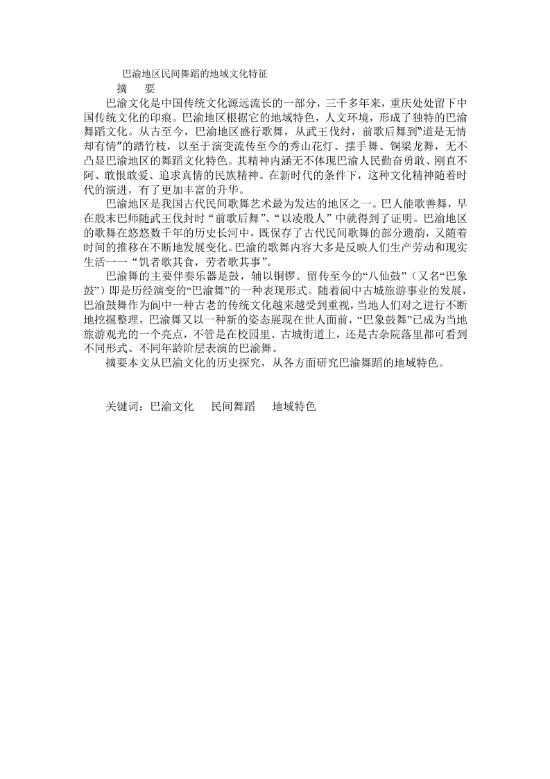 巴渝地区民间舞蹈的地域文化特征摘要巴渝文化是中国传统文化源远流长的一部分,三千多年来,重庆处处留下中国传统文化的印痕。巴渝地区根据它的地域特色,人文环境,形成了独特的巴渝舞蹈文化。从古至今,巴渝地区盛行歌舞,从武王伐纣,前歌后舞到道是无情却有情”的踏竹枝,以至于演变流传至今的秀山花灯、摆手舞、铜梁龙舞,无不凸显巴渝地区的舞蹈文化特色。其精神内涵无不体现巴渝人民勤奋勇敢、刚直不阿、敢恨敢爱、追求真情的民族精神。在新时代的条件下,这种文化精神随着时代的演进,有了更加丰富的升华。巴渝地区是我国古代民间歌舞艺术最为发达的地区之一。巴人能歌善舞,早在殷末巴师随武王伐封时“前歌后舞”、“以凌殷人”中就得到了证明。巴渝地区的歌舞在悠悠数千年的历史长河中,既保存了古代民间歌舞的部分遗韵,又随着时间的推移在不断地发展变化。巴渝的歌舞内容大多是反映人们生产劳动和现实生活一一“饥者歌其食,劳者歌其事”。巴渝舞的主要伴奏乐器是鼓,辅以铜锣。留传至今的“八仙鼓”(又名“巴象鼓”)即是历经演变的“巴渝舞的一种表现形式。随着阆中古城旅游事业的发展,巴渝鼓舞作为阆中一种古老的传统文化越来越受到重视,当地人们对之进行不断地挖掘整理,巴渝舞又以一种新的姿态展现在世人面前,“巴象鼓舞”已成为当地旅游观光的一个亮点,不管是在校园里、古城街道上,还是古杂院落里都可看到不同形式、不同年龄阶层表演的巴渝舞。摘要本文从巴渝文化的历史探究,从各方面研究巴渝舞蹈的地域特色。关键词:巴渝文化民间舞蹈地域特色
