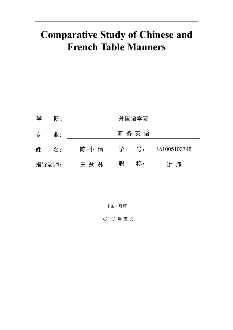 Comparative Study of Chinese andFrench Table Manners学院:外国语学院专业:商务英语姓名:陈小倩学161005103748指导老师:王劫苏职称:讲师中国·珠海北京理工大学珠海学院2020届本科生毕业论文毕业论文诚信承诺书本人郑重承诺:我所呈交的毕业论文Comparative Study ofChinese and French Table Manners是在指导教师的指导下,独立开展研究或调查所取得的成果,文中引用他人的观点和材料,均在文后按顺序列出其参考文献,文中所使用的数据真实可靠。承诺人签名:日期:年月日北京理工大学珠海学院2020届本科生毕业论文Comparative Study of Chinese and French Table MannersAbstractWith the development of the society and globalization,China has more frequentcommunications with France.Table manner is an essential part of cross-culturalcommunication.However,table manners are different in China and France because ofdifferent cultures and backgrounds.If people don't clearly know about differences ofChinese and French table manners,it's easy for two sides to lead to cultural conflictsand misunderstandings when they do business with each other.Although now thereare many studies for differences between Chinese and Western table manners,thereare few studies of differences of table manners between China and France.This paper attempts to have a comparative study for differences between Chineseand French table manners.The thesis introduces the origin and development of tablemanners between China and France,and compares the differences of table mannersfrom two aspects of pre dinner manners and dining manners,including choices ofdining tables,seating arrangements,order of meals,placements of tableware,diningmodes and dining atmosphere.What's more,the thesis exposes the reasons for thedifferences and shows some taboos of Chinese and French table manners.The paperwill use literature study and logical analysis to provide evidence and references forthis study's findings.People can have a more particular knowledge of differencesbetween Chinese and French table manners through this article.Keywords:China and France,table manners,differences