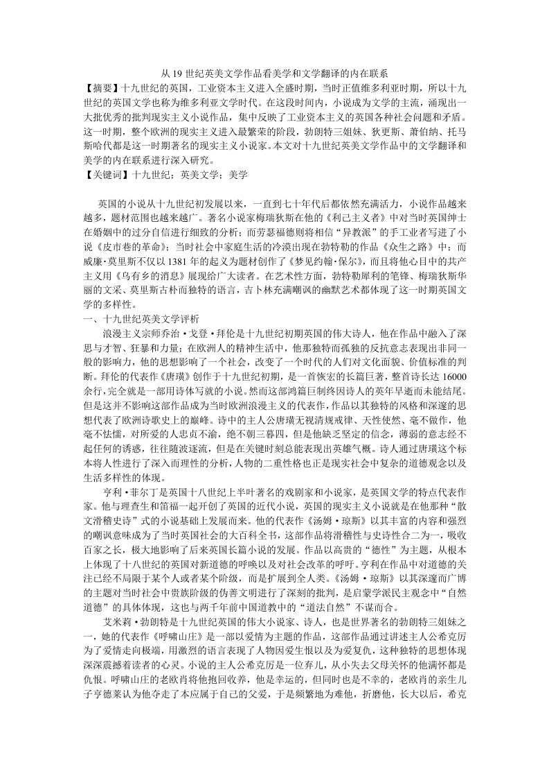 从19世纪英美文学作品看美学和文学翻译的内在联系【摘要】十九世纪的英国,工业资本主义进入全盛时期,当时正值维多利亚时期,所以十九世纪的英国文学也称为维多利亚文学时代。在这段时间内,小说成为文学的主流,涌现出一大批优秀的批判现实主义小说作品,集中反映了工业资本主义的英国各种社会问题和矛盾。这一时期,整个欧洲的现实主义进入最繁荣的阶段,勃朗特三姐妹、狄更斯、萧伯纳、托马斯哈代都是这一时期著名的现实主义小说家。本文对十九世纪英美文学作品中的文学翻译和美学的内在联系进行深入研究。【关键词】十九世纪:英美文学:美学英国的小说从十九世纪初发展以来,一直到七十年代后都依然充满活力,小说作品越来越多,题材范围也越来越广。著名小说家梅瑞狄斯在他的《利己主义者》中对当时英国绅士在婚姻中的过分自信进行细致的分析:而劳瑟福德则将相信“异教派”的手工业者写进了小说《皮市巷的革命》:当时社会中家庭生活的冷漠出现在勃特勒的作品《众生之路》中:而威廉·莫里斯不仅以1381年的起义为题材创作了《梦见约静·保尔》,而且将他心目中的共产主义用《乌有乡的消总》展现给广大读者。在艺术性方面,勃特勒犀利的笔锋、梅瑞狄斯华丽的文采、莫里斯古朴而独特的语言,吉卜林充满嘲讽的幽默艺术都体现了这一时期英国文学的多样性。一、十九世纪英美文学评析浪漫主义宗师乔治·戈登·拜伦是十九世纪初期英国的伟大诗人,他在作品中融入了深思与才智、狂暴和力量:在欧洲人的精神生活中,他那独特而孤独的反抗意志表现出非同一般的影响力,他的思想影响了一个社会,改变了一个时代的人们对文化面貌、价值标准的判断。拜伦的代表作《唐璜》创作于十九世纪初期,是一首恢宏的长篇巨著,整首诗长达16000余行,完全就是一部用诗体写就的小说。然而这部鸿篇巨制终因诗人的英年早逝而未能结尾。但是这并不影响这部作品成为当时欧洲浪漫主义的代表作,作品以其独特的风格和深邃的思想代表了欧洲诗歌史上的巅峰。诗中的主人公唐璜无视清规戒律、天性使然、毫不做作,他毫不怯懦,对所爱的人忠贞不渝,绝不朝三暮四,但是他缺乏坚定的信念,薄弱的意志经不起任何的诱惑,往往随波逐流,但是在关键时刻总能表现出英雄气概。诗人通过唐璜这个标本将人性进行了深入而理性的分析,人物的二重性格也正是现实社会中复杂的道德观念以及生活多样性的体现。亨利·菲尔丁是英国十八世纪上半叶著名的戏剧家和小说家,是英国文学的特点代表作家。他与理查生和笛福一起开创了英国的近代小说,英国的现实主义小说就是在他那种“散文滑稽史诗”式的小说基础上发展而来。他的代表作《汤姆·琼斯》以其丰富的内容和强烈的嘲讽意味成为了当时英国社会的大百科全书,这部作品将滑稽性与史诗性合二为一,吸收百家之长,极大地影响了后来英国长篇小说的发展。作品以高贵的“德性”为主题,从根本上体现了十八世纪的英国对新道德的呼唤以及对社会改革的呼吁。亨利在作品中对道德的关注己经不局限于某个人或者某个阶级,而是扩展到全人类。《汤姆·琼斯》以其深邃而广博的主题对当时社会中贵族阶级的伪善文明进行了深刻的批判,是启蒙学派民主观念中“自然道德”的具体体现,这也与两千年前中国道教中的“道法自然”不谋而合。艾米莉·勃朗特是十九世纪英国的伟大小说家、诗人,也是世界著名的勃朗特三姐妹之一,她的代表作《呼啸山庄》是一部以爱情为主题的作品,这部作品通过讲述主人公希克厉为了爱情走向极端,用激烈的语言表现了人物因爱生恨以及为爱复仇,这种独特的思想体现深深震撼着读者的心灵。小说的主人公希克厉是一位弃儿,从小失去父母关怀的他满怀都是仇恨。呼啸山庄的老欧肖将他抱回收养,他是幸运的,但同时也是不幸的,老欧肖的亲生儿子亨德莱认为他夺走了本应属于自己的父爱,于是频繁地为难他,折磨他,长大以后,希克厉爱上了老欧肖的女儿卡瑟琳,但是亨德莱对其百般阻挠,希克厉内心深处的仇恨开始逐渐萌发。因为希克厉的社会地位低下,深爱着他的卡瑟琳最终与上流社会的埃德加结婚,希克厉得知以后万念俱灰,过度的伤心和长期的忍耐让他再也无法安心,于是在一个风雨之夜他从呼啸山庄不辞而别。时过境迁,当年的穷鬼希克厉再返呼啸山庄,此刻他已经成为一个富人。他对卡瑟琳深爱不悔,但是他对卡瑟琳的背叛去不能容忍,所以,所有与卡瑟琳有关的人都遭到了希克厉的报复,他好像被魔鬼撒且附身,就如同撒且无法对上帝报复而迁怒于人类,亨德莱以及他的儿子哈里顿、埃德加的妹妹伊莎蓓拉以及埃德加,自己与伊莎蓓拉的儿子小林顿、埃德加与卡瑟琳的女儿都被他当做是工具或者是报复对象。正如他对卡瑟琳所说:奴仆无法反抗暴君的折磨,但是他可以在比他更下贱的奴隶身上发泄。二、文学翻译和美学的内在联系文学翻译和美学的内在联系是翻译十九世纪英美文学作品时应当重视的问题。十九世纪的欧洲是一个辉煌的时代,无论是思想文化、政治经济还是文学艺术都取得了丰硕的成就。这一时期,现实主义、浪漫主义、唯美主义、自然主义和象征主义文学流派相继出现,欧洲文学出现了“百家争鸣”的局面,欧洲文学在这种多流