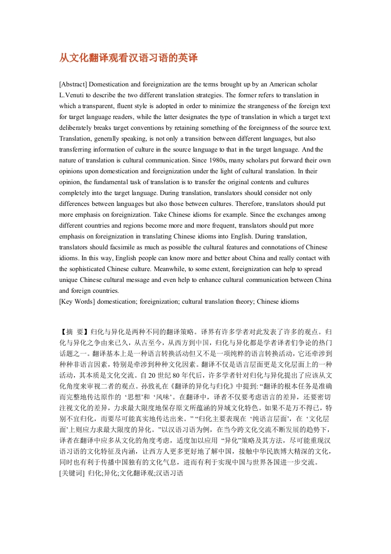 从文化翻译观看汉语习语的英译[Abstract]Domestication and foreignization are the terms brought up by an American scholarL.Venuti to describe the two different translation strategies.The former refers to translation inwhich a transparent,fluent style is adopted in order to minimize the strangeness of the foreign textfor target language readers,while the latter designates the type of translation in which a target textdeliberately breaks target conventions by retaining something of the foreignness of the source text.Translation,generally speaking,is not only a transition between different languages,but alsotransferring information of culture in the source language to that in the target language.And thenature of translation is cultural communication.Since 1980s,many scholars put forward their ownopinions upon domestication and foreignization under the light of cultural translation.In theiropinion,the fundamental task of translation is to transfer the original contents and culturescompletely into the target language.During translation,translators should consider not onlydifferences between languages but also those between cultures.Therefore,translators should putmore emphasis on foreignization.Take Chinese idioms for example.Since the exchanges amongdifferent countries and regions become more and more frequent,translators should put moreemphasis on foreignization in translating Chinese idioms into English.During translation,translators should facsimile as much as possible the cultural features and connotations of Chineseidioms.In this way,English people can know more and better about China and really contact withthe sophisticated Chinese culture.Meanwhile,to some extent,foreignization can help to spreadunique Chinese cultural message and even help to enhance cultural communication between Chinaand foreign countries.[Key Words]domestication;foreignization;cultural translation theory;Chinese idioms【摘要】归化与异化是两种不同的翻译策略。译界有许多学者对此发表了许多的观点。归化与异化之争由来己久,从古至今,从西方到中国,归化与异化都是学者译者们争论的热门话题之一。翻译基本上是一种语言转换活动但又不是一项纯粹的语言转换活动,它还牵涉到种种非语言因素,特别是牵涉到种种文化因素。翻译不仅是语言层面更是文化层面上的一种活动,其本质是文化交流。自20世纪80年代后,许多学者针对归化与异化提出了应该从文化角度来审视二者的观点。孙致礼在《翻译的异化与归化》中提到:“翻译的根本任务是准确而完整地传达原作的‘思想和‘风味'。在翻译中,译者不仅要考虑语言的差异,还要密切注视文化的差异,力求最大限度地保存原文所蕴涵的异域文化特色。如果不是万不得已,特别不宜归化,而要尽可能真实地传达出来。”“归化主要表现在‘纯语言层面',在‘文化层面'上则应力求最大限度的异化。”以汉语习语为例,在当今跨文化交流不断发展的趋势下,译者在翻译中应多从文化的角度考虑,适度加以应用“异化”策略及其方法,尽可能重现汉语习语的文化特征及内涵,让西方人更多更好地了解中国,接触中华民族博大精深的文化,同时也有利于传播中国独有的文化气息,进而有利于实现中国与世界各国进一步交流。「关键词]归化:异化:文化翻译观:汉语习语1.On cultural translation theoryCultural translation is discussed in the broad context of culture.It includes an analysis of thesurface and deep structures of culture and language,and the examination of the internal contextbetween culture and translation as well as the objective laws pertaining to their interaction.In late1980s,many scholars began to give their own opinions on translation from the perspective ofculture.Umberto Eco considered that translation equals to culture,that is to say,the translationactivity is a kind of cultural transportation."Lambert and Robyns held that translation should betreated as not only an activity between two languages but also a communicative activity betweentwo cultures.Nida pointed out:for a truly successful translation,bicultural ability is much moreimportant than bilingual ability"[1]p70.Some scholars suggested that culture but not text shouldbe regarded as the translation unit and translators should pay more attention to culture duringtranslation.To some extent,those views became symbols of formation of cultural translationDifferent cultures have different features.Culture indicates a nation,region or a race's feature.And the communication of different cultures needs translation.Translation is the production andintermedium of cultural communication."Translation reflects the features of both cultures whenone language and culture is translated into another.And the aim of translation is to transfer thesource culture into the target culture"[2]p24."Wang Zuoliang pointed out:The differencebetween two cultures is the most difficult thing in translation,so translators should have a goodknowledge of both the foreign culture and the native culture.The more translators understand thecultural information,the more possibly they can master the language and reproduce the originalculture.Han Ziman viewed that the features of culture have an effect on the whole translationactivities and the vise versa is also true"[3]pl16.Therefore,the transference of culturalinformation should play a key role in translation.In the broad context of culture,translation means not only one language being transferred intoanother but also a communication between two cultures.And the purpose of translation is topromote cultural communication.Translation is a kind of cultural activity that translatorsreproduce the original culture in the target text.Cultural information but not language is the objectof translation."During translation,translators should transl