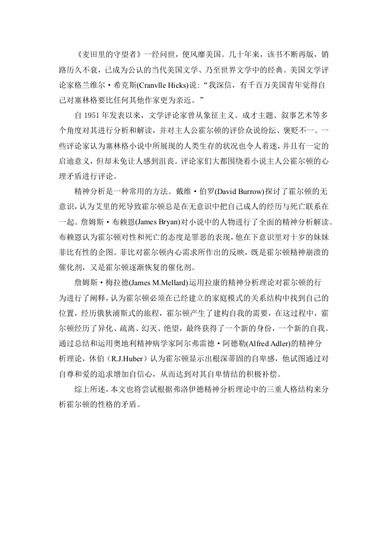 《麦田里的守望者》一经问世,便风靡美国。几十年来,该书不断再版,销路历久不衰,已成为公认的当代美国文学、乃至世界文学中的经典。美国文学评论家格兰维尔·希克斯(Cranvlle Hicks)说:“我深信,有千百万美国青年觉得自己对塞林格要比任何其他作家更为亲近。”自1951年发表以来,文学评论家曾从象征主义、成才主题、叙事艺术等多个角度对其进行分析和解读,并对主人公霍尔顿的评价众说纷纭、褒贬不一。一些评论家认为塞林格小说中所展现的人类生存的状况也令人着迷,并且有一定的启迪意义,但却未免让人感到沮丧。评论家们大都围绕着小说主人公霍尔顿的心理矛盾进行评论。精神分析是一种常用的方法。戴维·伯罗(David Burrow)探讨了霍尔顿的无意识,认为艾里的死导致霍尔顿总是在无意识中把自己成人的经历与死亡联系在一起。詹姆斯·布赖恩(James Bryan)对小说中的人物进行了全面的精神分析解读。布赖恩认为霍尔顿对性和死亡的态度是罪恶的表现,他在下意识里对十岁的妹妹菲比有性的企图。菲比对霍尔顿内心需求所作出的反映,既是霍尔顿精神崩溃的催化剂,又是霍尔顿逐渐恢复的催化剂。詹姆斯·梅拉德(James M.Mellard)运用拉康的精神分析理论对霍尔顿的行为进行了阐释,认为霍尔顿必须在已经建立的家庭模式的关系结构中找到自己的位置,经历俄狄浦斯式的旅程,霍尔顿产生了建构自我的需要,在这过程中,霍尔顿经历了异化、疏离、幻灭、绝望,最终获得了一个新的身份,一个新的自我。通总和运用利神学家德・(Alfred Adler)的精神分析理论,休伯(RJ.Huber)认为霍尔顿显示出根深蒂固的自卑感,他试图通过对自尊和爱的追求增加自信心,从而达到对其自卑情结的积极补偿。综上所述,本文也将尝试根据弗洛伊德精神分析理论中的三重人格结构来分析霍尔顿的性格的矛盾。