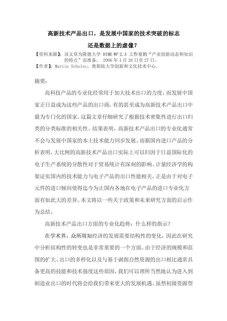 高新技术产品出口,是发展中国家的技术突破的标志还是数据上的虚像?【资料来源】:该文章为隆德大学DIME WP2.3工作室的“产业创新动态和知识的特点”而准备,2006年4月26日至27日。【作者】:Martin Srholec,奥斯陆大学创新和文化技术中心。摘要:高科技产品的专业化经常用于加大技术出口的力度,而发展中国家正日益成为这些产品的出口商,有的甚至成为高新技术产品出口中最为专门化的国家。这篇文章仔细研究了根据技术密集性进行出口归类的分类标准的相关性。结果表明,高新技术产品出口的专业化通常不会与发展中国家的本土技术能力同步发展。而据国内进口产品的分析表明,大比例的高新技术产品出口实际上可以归因于日益国际化的电子生产系统的分散性对于贸易统计有深刻的影响。计量经济学的构架证实国内的技术能力与电子产品的出口性能相关,正是由于对电子元件的进口倾向使得迄今为止国内各地在电子产品的进口专业化方面有如此大的差异。本文将以一些关于政策和未来研究方面的启示作为总结。高新技术产品出口方面的专业化趋势:什么样的指示?在学术界,众所周知经济的发展需要结构性的变化,因此在研究中分析结构性的转变也是非常重要的一个方面。由于经济的规模和范围的扩大、出口的多样化以及与基于剥削自然资源的出口相比通常具备更高的技能和技术强度这些原因,我们可以理所当然地认为进入到制造业出口的时代将会给我们带来更大的发展机遇。虽然初级资源型贸易和加工贸易之间的区别相对容易辨别,但是加工贸易的技术强度之间的区分却变得复杂得多。如上所述,习惯上来说,通过比较各个国家的高科技产品专业化之间的比较,我们就可以捕捉到技术的出口力度。图一提供了一个关于各个国家相关的可用数据之间的比较(在2003年的108个国家的样本)。图中垂直轴绘制的是商品出口中的高科技产品比例,而水平先则表示电子产品出口中的专业化。虚线则表示样本的平均数,它把整个图表分为四个象限,即沿着两个方向分为以下以上的平均系数,以此表明这些国家的产品在出口中的专业化程度。75R-0851530575图一2003年高新技术产品与电子产品的专业化高新技术产品出口的数据是以世界发展指标数据集(世界银行,2005)为基础的,它指高研发强度的产品,诸如航空航天,计算机,医药,科学仪器和电气机械等。这与经合组织的分类定义是一致的,而且与基于Pavitt的分类科学并得到普遍认可的出口行业相当接近。电子产品出口可以COMTRADE数据库(联合国2005年)中获得,它并覆盖了以下产品的相关贸易:办公、会计和计算机械(75):电台、电视和通讯设备(76):电气机械(77):以及医疗、精密和光学仪器(87,881,884和885)。所有的代码都是根据STC,rev.3而来。大多数国家在高科技产品出口的份额上一直保持低于平均水平,而大部分的低收入国家的高新技术产品出口报告甚至可以忽略不计,即使高新技术产品出口的专业化绝不是最先进的国家的特权。然而,最引人注目的事实是专门从事高科技产品出口的国家是菲律宾。在那里,几乎有三分之二的出口都属于高科技类。其他高新技术产品出口专业化的国家还包括马耳他、新加坡、马来西亚和台湾,其中超过三分之一的出口都是高新技术产品。此外还有几个随手可得的关于发展中国家或新兴国家的典型例子,如中国、泰国、哥斯达黎加、墨西哥、匈牙利、韩国等在高科技领域也表现的相当出色。在仔细观察其结构之后就可发现,在大多数国家的高新技术产品出口中,电子产品占大部分的比重,且这种匹配关系在专业化程度高的国家表现的尤其明显。这些国家通常以有限范围内的电子产品为主要的高新技术出口产品。高科技产品出口的专业化与电子产品出口的整体相关性非常高。图1显示,这些指标在全国各地的差异超过了