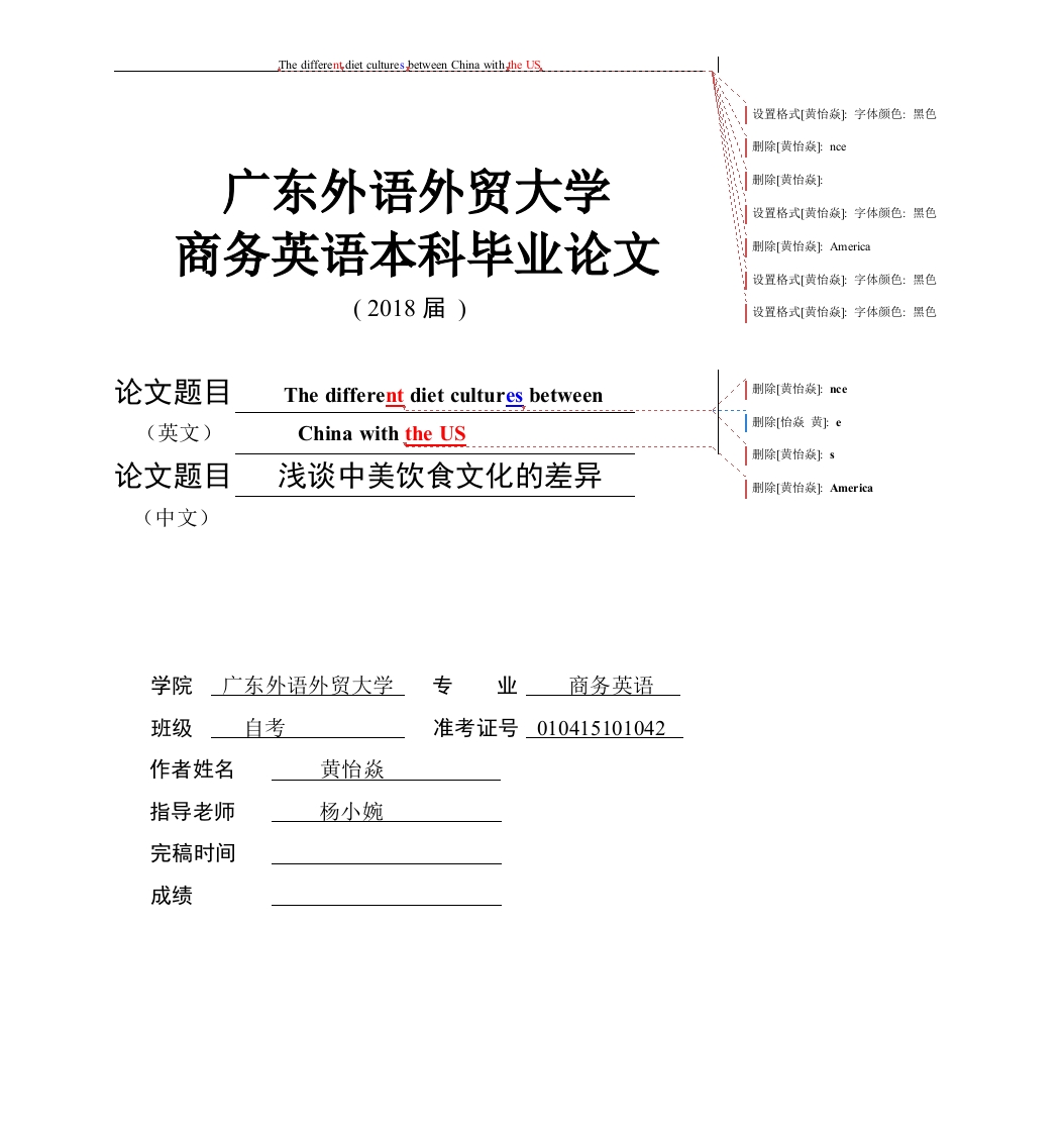 设置格式黄怡焱)字体颜色:黑色广东外语外贸大学设置格式黄怡焱)字体颜色:黑色商务英语本科毕业论文删除黄怡焱America设置格式[黄怡焱:字体颜色:黑色(2018届)设置格式黄怡焱)字体颜色:黑色论文题目The different diet cultures between(英文)China with the US论文题目浅谈中美饮食文化的差异删除黄怡焱America(中文)学院广东外语外贸大学专业商务英语班级自考准考证号010415101042作者姓名黄怡焱指导老师杨小婉完稿时间成绩设置格式[黄怡焱:字体颜色:黑色设置格式[黄怡焱)字体颜色:黑色The different diet cultures between China with the US刑除[黄怡焱:AmericaHuang Yiyan设置格式黄怡焱)字体颜色:黑色Abstract:Nowadays,more and more foreigners are learning Chinese cultures,This设置格式[黄怡焱字体颜色:黑色phenomenon is becoming a tidal current.In Chinese culture,diet culture is animporting part.As we all know,they have great difference in diet cultures between刑除[黄怡焱:Westernthe east and the west,.They all have their own characteristics.,This article can give you a thorough understanding of diet cultures删除黄怡焱:Chinese andbetween China with the US.This,article will select China and the US that the most删除怡焱黄,representative economic countries,as examples,It is mainly divided into four partsThe first part introduces,their own characteristics and connotations of dietcultures.The second part introduces manifestations what can show the specific删除黄怡焱recultural difference of diet,like types of foods,use of tableware,seat arrangement,serving order,and the concept of diet,The third part analyzes the reasons from删除黄怡焱sgeographical and traditional factors why produce this difference.The last_partanalyzes the effects and functions of different diet cultures in the two countries'cross-culture communication.The article hopes to help people to learn more knowledge of diet cultureswhich can help us to avoid some unnecessary misunderstandings in cross-culture删除怡焱黄上erncommunication...刑除[怡焱黄):For example,in many western countri:回设置格式黄怡焱)缩进:首行缩进:13.1毫米删除xiaowan yang}:e别除xiaowan yang]:y别除xiaowan yang:in east and west删除xiaowan yang]:to analyze删除xiaowan yang:The paper删除xiaowan yang:,删除xiaowan yang:t删除xiaowan yang:isto删除xiaowan yang:e删除xiaowan yang]:;删除xiaowan yang]:t删除xiaowan yang]:is through toThe different diet cultures between China with the US设置格式黄怡焱:字体颜色:黑色删除黄怡焱浅谈中美饮食文化的差异设置格式[黄怡焱):字体颜色:黑色黄怡焱删除黄怡焱America摘要:如今越来越多的国外友人学习中国文化,这种现象逐渐成为了一种潮流。在中设置格式黄怡焱上字体颜色:黑色国文化中,饮食文化是最具代表性的一部分。众所周知,东西方在饮食文化上各有设置格式黄怡焱)字体颜色:黑色不同,各具特色。为了让更多的东西方朋友了解东西方饮食文化的差异,本文选取了东西方最具删除xiaowan yang]:代表性的经济大国一中国和美国作为分析对比对象文章主要分为四部分介绍两国设置格式xiaowan yang]:行距:单倍行距的饮食文化差异,第一部分主要介绍中美两国饮食文化的各自内涵和特点;第二部删除怡焱黄:比如,东方国家大部分以米饭为主食,西分从两国日常食用的食物种类、使用的餐具、上菜的顺序、座席的安排、饮食的观方国家则以土豆为主食,而土豆在东方国家通常被当作菜念五个方面的具体现象,来表现他们具体的饮食文化差异现象:第三部分从两国的肴食用,为什么会有这种差异呢?地理位置因素和传统习俗因素,简要分析了造成这种饮食文化差异的主要原因;最后删除怡焱黄,部分简单介绍了中美饮食差异在两国跨文化交流中所起的作用与影响。本文希望让更多的朋友了解饮食文化差异,避免在跨文化交流中产生不必要的删除怡焱黄。误会。关键词:饮食文化,差异,交流删除怡焱黄章删除怡焱黄:间交流和融合中删除黄怡焱如今越来越多的国外友人学习汉语并了解中国文化,成为了一种潮流。饮食,是文化一部分。东西方在饮食文化上存在较大差异,各具特色。了解东西方饮食文化的差异,有助于我们更清楚地知道这种差异的具体表现以及所形成的原因。中美两国是东西方最具代表性的经济大国,本文以中美两国为例,分为四个部分简单介绍了两国间的饮食文化差异。第一部分主要介绍中美两国饮食文化的各自内涵和特点:第二部分主要从两国的饮食食材、饮食餐具、座席安排、上菜顺序、饮食观念五个方面来介绍差异性的具体表现:第三部分从地理位置、自然环境、宗教信仰、传统习俗四个方面来介绍所形成差异性的原因:最后一部分简单介绍了中美饮食差异在两国间的交流和融合。本文以中美两国的饮食文化差异,希望被更多的中西方朋友所了解,避免在跨文化交际中,产生不必要的误解。
