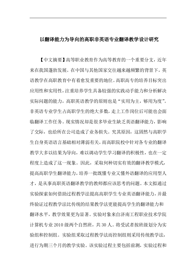 以翻译能力为导向的高职非英语专业翻译教学设计研究【中文摘要】高等职业教育作为高等教育的一个重要分支,近年来在我国蓬勃发展。在中国与其他国家交往越来越频繁的背景下,英语教学在高职教育中有着愈发重要的地位。高职高专的培养目标突出应用性和实用性,注重培养学生具备较强的实践动手能力和分析解决实际问题的能力,高职英语教学的原则也是“实用为主,够用为度”。非英语专业学生占高职学生的绝大多数,走上工作岗位后可能也会面临翻译工作任务。现实情况却是很多毕业生缺乏英语翻译能力,影响了交际,也给所在公司造成了业务损失。究其原因,这固然与高职学生自身英语语言基础相对薄弱有关,而高职院校中针对各专业的翻译教学大多以结果为导向,难以调动学生学习翻译的积极性,也在一定程度上造成了这一现象。因此,采取何种切实有效的翻译教学模式,提高高职学生翻译能力,培养一批既懂专业又懂外语翻译的应用型人才,是从事高职英语翻译教学的教师都应该思考的问题。本文拟通过实验探索如何借助过程教学法提高高职学生专业英语翻译能力,并最终验证过程教学法比传统的结果教学法更能提高学生的翻译能力和翻译水平,教学效果更为显著。实验对象来自济南工程职业技术学院计算机专业2010级两个自然班,共30人。将受试者按班级划分为实验组和控制组。实验组采取过程教学法而控制组则采用传统教学法,进行为期三个月的教学实验。该实验过程主要包括前测,实验过程和后测三个阶段。实验过程以问卷,测试以及访谈为辅助实验工具。通过对实验过程数据的收集以及分析,本研究得出以下结果:实验后几乎所有受试者解决实际翻译问题的能力都有了不同程度的提高。实验组学生的提高幅度普遍比控制组明显,用人单位对实验组译文质量评价更高。实验组学生对过程教学法持普遍肯定态度,表明借助过程教学法这一教学模式在高职院校开展专业英语翻译教学能更好地调动学生学习翻译的积极性,也能好地拓展学生的思维,有效地指导学生的翻译实践。本研究有助于提高各高职院校对高职学生专业英语翻译能力的重视,为教师改进翻译教学方法和课堂设置提供有益参考。【英文摘要】Recent years have witnessed a rapid developmentof higher vocational education.Against the background ofChina's more frequent communication with foreigncountries,English teaching is in a superior position in Higher VocationalTechnicalCollege (HVTC).According to the basic requirementsfor Higher VocationalTechnical Education English Course issuedby Ministry of Education,Englishteaching in HVTC should layemphasis on educating practical talents,and it isimportant topromote the judicious blend of English teaching and socialdemands.Non-English major students account for the majority inHVTC,they will inevitablyencounter some translation tasksafter graduation.Unfortunately,a large number ofHVTCgraduates show a complete lack of translation competence,whichwillnegatively influence the communication and cause losses ontheir employers.Thereason may lie in the HVTC students'relatively poor English competence,while thefact that most ofthe translation courses designed for non-English majors werecarriedout with product-oriented approach,which cannotmotivate the students to study,mayattribute to such asituation.So,English teachers in HVTC should ponder on howtoimprove the non-English major students'English translationcompetence with a moreeffective approach,and foster thetechnical talents with English-applying ability intheir futurejob.An empirical research was conducted in the present studyon 30 subjects,aiming tofind out how to improve HVTC students'specialty English translation competence onthe basis ofprocess-oriented method,and to test the effectiveness of themethod.The subjects majoring in computer science were fromJinan EngineeringVocational and Technical College.In theexperiment,they were divided into twogroups according to classdivision.One is the experimental group who participated inaprocess-oriented class,while the other is the control groupthat studied in atraditional product-oriented class.The wholeexperiment lasted for three months.Theexperiment includedsuch steps as the pre-test,the process of developing
