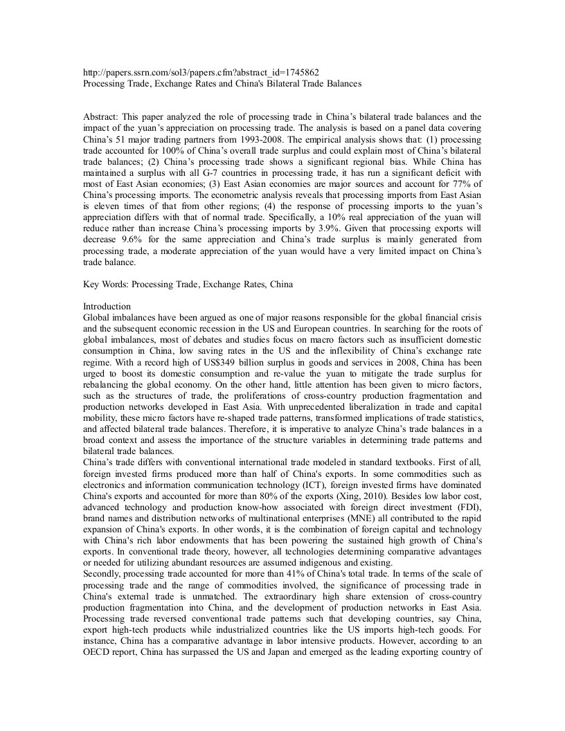 http://papers.ssrn.com/sol3/papers.cfm?abstract_id=1745862Processing Trade,Exchange Rates and China's Bilateral Trade BalancesAbstract:This paper analyzed the role of processing trade in China's bilateral trade balances and theimpact of the yuan's appreciation on processing trade.The analysis is based on a panel data coveringChina's 51 major trading partners from 1993-2008.The empirical analysis shows that:(1)processingtrade accounted for 100%of China's overall trade surplus and could explain most of China's bilateraltrade balances;(2)China's processing trade shows a significant regional bias.While China hasmaintained a surplus with all G-7 countries in processing trade,it has run a significant deficit withmost of East Asian economies;(3)East Asian economies are major sources and account for 77%ofChina's processing imports.The econometric analysis reveals that processing imports from East Asianis eleven times of that from other regions;(4)the response of processing imports to the yuan'sappreciation differs with that of normal trade.Specifically,a 10%real appreciation of the yuan willreduce rather than increase China's processing imports by 3.9%.Given that processing exports willdecrease 9.6%for the same appreciation and China's trade surplus is mainly generated fromprocessing trade,a moderate appreciation of the yuan would have a very limited impact on China'strade balance.Key Words:Processing Trade,Exchange Rates,ChinaIntroductionGlobal imbalances have been argued as one of major reasons responsible for the global financial crisisand the subsequent economic recession in the US and European countries.In searching for the roots ofglobal imbalances,most of debates and studies focus on macro factors such as insufficient domesticconsumption in China,low saving rates in the US and the inflexibility of China's exchange rateregime.With a record high of US$349 billion surplus in goods and services in 2008,China has beenurged to boost its domestic consumption and re-value the yuan to mitigate the trade surplus forrebalancing the global economy.On the other hand,little attention has been given to micro factors,such as the structures of trade,the proliferations of cross-country production fragmentation andproduction networks developed in East Asia.With unprecedented liberalization in trade and capitalmobility,these micro factors have re-shaped trade patterns,transformed implications of trade statistics,and affected bilateral trade balances.Therefore,it is imperative to analyze China's trade balances in abroad context and assess the importance of the structure variables in determining trade pattems andbilateral trade balances.China's trade differs with conventional international trade modeled in standard textbooks.First of all,foreign invested firms produced more than half of China's exports.In some commodities such aselectronics and information communication technology (ICT),foreign invested firms have dominatedChina's exports and accounted for more than 80%of the exports (Xing,2010).Besides low labor cost,advanced technology and production know-how associated with foreign direct investment (FDI).brand names and distribution networks of multinational enterprises (MNE)all contributed to the rapidexpansion of China's exports.In other words,it is the combination of foreign capital and technologywith China's rich labor endowments that has been powering the sustained high growth of China'sexports.In conventional trade theory,however,all technologies determining comparative advantagesor needed for utilizing abundant resources are assumed indigenous and existing.Secondly,processing trade accounted for more than 41%of China's total trade.In terms of the scale ofprocessing trade and the range of commodities involved,the significance of processing trade inChina's extemal trade is unmatched.The extraordinary high share extension of cross-countryproduction fragmentation into China,and the development of production networks in East Asia.Processing trade reversed conventional trade pattems such that developing countries,say China,export high-tech products while industrialized countries like the US imports high-tech goods.Forinstance,China has a comparative advantage in labor intensive products.However,according to anOECD report,China has surpassed the US and Japan and emerged as the leading exporting country ofICT(2005,OECD).Moreover,with processing trade,bilateral trade balances between a country usedas an export-platform and destination markets of final products are inflated,as the former needs toimport a large amount of intermediate inputs from third countries for processed exports.A typical example of processing trade is the trade of iPhones between China and the US.iPhones,themost trendy and advanced mobile,are exclusively assembled in China.All parts and components usedfor iPhones are produced in Germany,Japan,Korea,Taiwan and the US,then shipped to China forassembling the ready to use final products,which are exported to the US and other markets.In termsof conventional trade statistics,the production fragmentation and networks involved in manufacturingiPhones have created a non-traditional trade pattem:iPhones invented by the US company Apple areexported to the US from China,which does not have a comparative advantage in producing smartphones at all.It is estimated that iPhone trade contributed US$1.9 billion to the trade deficit of the USwith China in 2009.Measured in value-added created by Chinese workers assembling iPhones,however,the US would have US$48 million surplus from the iPhone trade with China.This meansthat the deficit was simply a transfer from the third countries,which supply parts and components toFoxconn,an exclusive iPhone assembler located in Shenzhen,China (Xing and Deter,2010).There is a plethora of studies on China's processing trade (e.g,Aziz and Li,2007;Koopma,Wang,andWei,2008;Thorbecke,2010;Thorbecke and Smith,2010;Ahmed,2009).All of these studiesprimarily concentrated on the rela