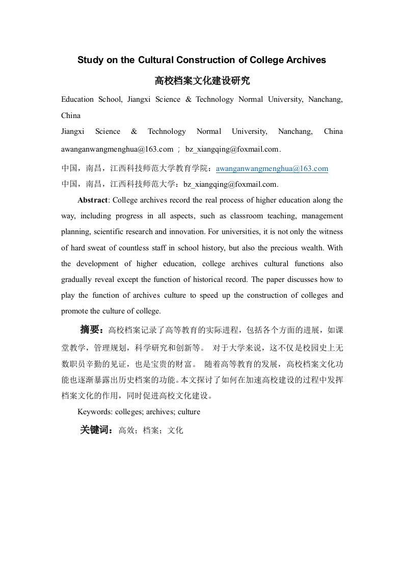 Study on the Cultural Construction of College Archives高校档案文化建设研究Education School,Jiangxi Science Technology Normal University,Nanchang,ChinaJiangxi Science Technology Normal University,Nanchang,Chinaawanganwangmenghua@163.com bz xiangqing@foxmail.com.中国,南昌,江西科技师范大学教育学院:awanganwangmenghua(@l63.com中国,南昌,江西科技师范大学:bz xiangqing@foxmail..com.Abstract:College archives record the real process of higher education along theway,including progress in all aspects,such as classroom teaching,managementplanning,scientific research and innovation.For universities,it is not only the witnessof hard sweat of countless staff in school history,but also the precious wealth.Withthe development of higher education,college archives cultural functions alsogradually reveal except the function of historical record.The paper discusses how toplay the function of archives culture to speed up the construction of colleges andpromote the culture of college.摘要:高校档案记录了高等教育的实际进程,包括各个方面的进展,如课堂教学,管理规划,科学研究和创新等。对于大学来说,这不仅是校园史上无数职员辛勤的见证,也是宝贵的财富。随着高等教育的发展,高校档案文化功能也逐渐暴露出历史档案的功能。本文探讨了如何在加速高校建设的过程中发挥档案文化的作用,同时促进高校文化建设。Keywords:colleges;archives;cultureIntroduction引言As the original record of college history,college archives have the inherentcultural connotation and character and are an important part of college culturalheritage and development.College archives culture,is the whole life way collegeteachers and students create around the archives.In the new period,furtherunderstanding the cultural function of archives in colleges,and giving full play to thepositive role of archives culture in the construction of campus culture,undoubtedlyplays an important role in carrying forward college culture,and accelerating thedevelopment of college.作为大学历史的原始记录,高校档案具有内在独特的文化内涵和特征,是高校文化的主要载体之一,同时也是高校文化传承与发展的重要组成部分。高校档案文化是高校教师和学生围绕档案创造的全生命方式。在新时期,进一步认识高校档案文化功能,充分发挥档案文化在校园文化建设中的积极作用,是现阶段高效发展的必然趋势,同时无疑对弘扬高校文化,加快高校发展起到重要作用。Importance of the construction of college archives culture高校档案文化建设的重要性First,college archives are the important basis of the development of collegematerial culture.The construction of material culture,first of all needs to improvethe campus humanities landscape and establish campus environment with its owncharacteristic.As wisdom palace cultivating high-level talents,colleges have theirown cultural background and development history,and a number of experts withprofound knowledge.Those contents are recorded in the file,so these contents offiles can be applied in the construction of campus integrated environment.Theunique campus landscape or architecture can be used to show the spirit and culturalconnotation,so archives can be turned to living campus physical culture and giverich cultural connotation to campus environment and construction to outstandcampus culture attribute.The connection of college archives and material culturaldevelopment shows college history beauty,traditional beauty,ideological andcultural beauty very well,effectively inspires the aesthetic ability of teachers andstudents,purifies the hearts of teachers and students,and helps them establish acorrect outlook on life and values.首先,高校档案是高校物质文化发展的重要基础。物质文化建设首先需要改善校园人文景观,建立具有自身特色的校园环境。作为智慧圣地培养高层次人才的主要基地,学院有自己的文化背景和发展历史,并拥有一批知识渊博的专家。这些内容被记录在文件中,因此这些文件的内容可以应用于校园集成环境的构建中。独特的校园景观或建筑可以用来展现校园相对应的精神文化内涵,在此基础上将档案转化为校园生活体育文化,为校园环境和建设提供丰富的文化内涵,突出校园文化属性。高校档案与物质文化的发展相互衔接,充分展示了大学历史美、传统美和思想文化美,有效激发了师生的审美能力,净化了师生的心,帮助他们树立了正确的人生观、生活观和价值观。Second,college archives construction is an important basis of school system cultureconstruction.The system is a kind of specification,and its core is to standardize thepeople.Rules and regulations,as important content of university culture,represent the