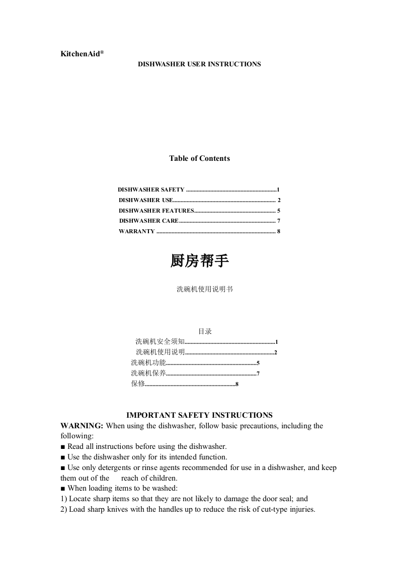 KitchenAidDISHWASHER USER INSTRUCTIONSTable of ContentsDISHWASHER SAFETYDISHWASHER USE.....DISHWASHER FEATURES.DISHWASHER CARE......7WARRANTY8厨房帮手洗碗机使用说明书目录洗碗机安全须知l洗碗机功能5洗碗机保养保修8IMPORTANT SAFETY INSTRUCTIONSWARNING:When using the dishwasher,follow basic precautions,including thefollowing:Read all instructions before using the dishwasher.Use the dishwasher only for its intended function.Use only detergents or rinse agents recommended for use in a dishwasher,and keepthem out of the reach of children.When loading items to be washed:1)Locate sharp items so that they are not likely to damage the door seal;and2)Load sharp knives with the handles up to reduce the risk of cut-type injuries.安全须知警告:请遵照以下基本安全措施使用洗碗机·使用前阅读所有说明。■仅使用洗碗机的预期功能仅使用推荐的洗涤剂或漂洗剂清洁洗碗机,并请放在小孩够不着的地方。■装载需清洗器皿时:1)放好尖锐物品,使之不损坏门封。2)刀柄朝上放置以防止割伤。.Do not wash plastic items unless they are marked "dishwasher safe"or theequivalent.For plastic items not so marked,check the manufacturer'srecommendationsDo not touch the heating element during or immediately after use.Do not operate the dishwasher unless all enclosure panels are properly in place.Do not tamper with controls.·只清洗标明“可用于洗碗机”或其他类似内容的塑料器皿,如若无标注,请参照生产商建议。在使用中或者使用后短时间内请勿触碰发热器。■在所有机箱面板准备就绪后方可启动洗腕机。■请勿篡改控件。Do not abuse,sit on,or stand on the door,lid,or dish racks of the dishwasher.To reduce the risk of injury,do not allow children to play in or on the dishwasher.Under certain conditions,hydrogen gas may be produced in a hot water system thathas not been used for two weeks or more.HYDROGEN GAS IS EXPLOSIVE.If thehot water system has not been used for such a period,before using the dishwasherturn on all hot water faucets and let the water flow from each for several minutes.This will release any accumulated hydrogen gas.As the gas is flammable,do notsmoke or use an open flame during this time.Remove the door or lid to the washing compartment when removing an olddishwasher from service or discarding it.·请勿滥用,坐立,站立于洗腕机门,机盖,叠架上。·为了避免受伤,请勿让小孩在洗碗机内部或上方玩耍。超过两周或两周以上不使用的热水系统在一定条件下可能会产生氢气。氢气是易爆性气体。如有一段时间未使用热水系统,请在使用洗腕机前打开所有热水龙头,使每个水龙头流水几分钟。这可以释放所有积压的氢气。由于氢气易燃,在这期间禁止吸烟、使用明火。拆卸旧洗碗机或丢弃旧洗碗机时,拆下清洗室的门或盖子。WARNINGDo not use dishwasher until completely installed.Do not push down on open door.Doing so can result in serious injury or cuts.警告请在洗碗机安装完成后使用请勿向下推开门,这样做可能导致严重伤害或割伤Dishwasher UseSTEP 1Prepare and Load the DishwasherIMPORTANT:Remove leftover food,bones,toothpicks and other hard items fromthe dishes.Remove labels from containers before washing.Be sure that items in the rack do not block the upper or lower spray arms.Make sure that when the dishwasher door is closed no items are blocking thedetergent dispenser.Items should be loaded with soiled surfaces facing down and inward to the spray asshown.This will improve cleaning and drying results.Avoid overlapping items like bowls or plates that may trap food.Place plastics,small plates and glasses in the upper rack.Wash only plastic itemsmarked“dishwasher safe.”洗碗机使用说明第一步准备和装载洗碗机重点:清除盘中残留食物、骨头、牙签或者其他硬物。洗涤前拆下容器标签。·确保碟架中的器皿不阻塞上下喷臂。·确保洗碗机门关闭时器皿不阻塞清洁剂压出器为了提高清洁和干燥效果,将器皿污面正面向内朝下对着喷雾臂。避免类似碗或盘子这样会嵌塞食物的器皿重叠。将塑料制品,小盘和玻璃器皿放置上洗涤篮中。只能清洗标明“可用于洗碗机”字样的塑料制品。To avoid thumping/clattering noises during operation,load dishes so they do nottouch one another.Make sure lightweight load items are secured in the racks.Improper loading can cause dishes to be chipped or damaged.When loading glassesor mugs,it is best to load these items in between rows of tines instead of loading themover tines.If you do not want to use the covers you can remove them.Load the silverware withsharp items pointed down and avoid "nesting"of spoons and forks by alternatingsome up and some down.·为了避免清洗过程中出现碰撞的噪音,请将器皿彼此分离装载。确保轻质器皿在碟架中不被损坏。装载不当将导致器皿破裂或损坏。装载玻璃器皿或杯具时,最好把它们置于叉齿上行间而不是上方。如不想使用盖子,可以移开。将镀银餐具的尖锐部分朝下装载,通过上下交替放置汤匙和餐叉避免嵌入。STEP2Add DetergentNOTE:If you do not plan to run a wash cycle soon,run a rinsecycle.Do not usedetergent.Use automatic dishwasher detergent only.Add powder,liquid or tablet detergentjust before starting a cycle.Fresh automatic dishwasher detergent results in better cleaning.Store tightly closeddetergent container in a cool,dry place.We recommend tablets and packs forconvenience and improved performance.