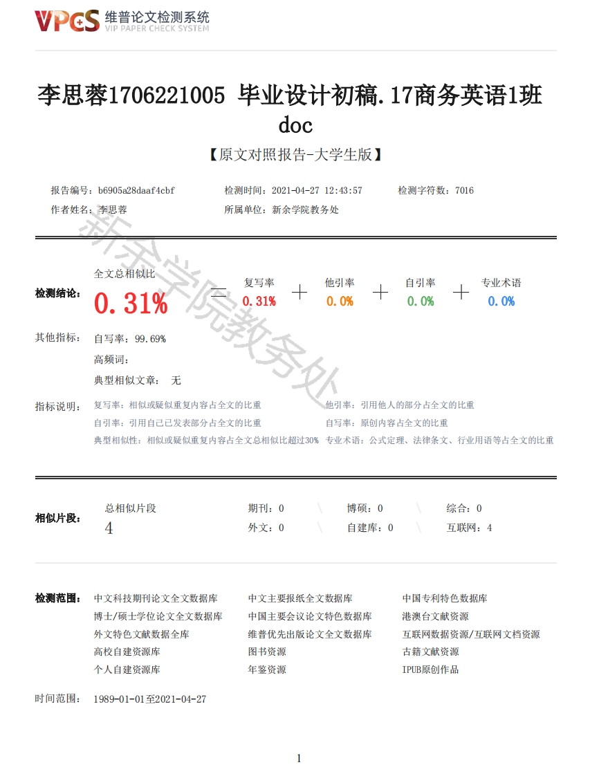 维普论文检测系统/IP PAPER CHECK SYSTEM李思蓉1706221005毕业设计初稿.17商务英语1班doc【原文对照报告-大学生版】报告编号:b6905a28daaf4cbf检测时间:2021-04-2712:43:57检测字符数:7016作者姓名:李思蓉所属单位:新余学院教务处全文总相似比自引率专业术语检测结论:0.31%其他指标:自写率:99.69%高频词:典型相似文章:无院教务处复写率他引率0.31%0.0%0.0%0.0%指标说明:复写率:相似或疑似重复内容占全文的比重引率:引用他人的部分占全文的比重自引率:引用自己已发表部分占全文的比重自写率:原创内容占全文的比重典型相似性:相似或疑似重复内容占全文总相似比超过30%专业术语:公式定理、法律条文、行业用语等占全文的比重总相似片段期刊:0博硕:0综合:0相似片段:4外文:0自建库:0互联网:4检测范围:中文科技期刊论文全文数据库中文主要报纸全文数据库中国专利特色数据库博士/硕士学位论文全文数据库中国主要会议论文特色数据库港澳台文献资源外文特色文献数据全库维普优先出版论文全文数据库互联网数据资源/互联网文档资源高校自建资源库图书资源古籍文献资源个人自建资源库年鉴资源IPUB原创作品时间范围:1989-01-01至2021-04-27维普论文检测系统VIP PAPER CHECK SYSTEM原文对照颜色标注说明:■自写片段■复写片段(相似或疑似重复)口引用片段(引用)■专业术语(公式定理、法律条文、行业用语等)学Xinyu University毕业设计(论文)Marketing plan of textiles under the background of cross border E-commerce ---TakeMESOROCK's Green Dinosaur Box as an example学生姓名:李思蓉学号:1706221005专业:商务英语指导教师:田丽讲师学院:外国语学院江西·新余独创性声明本人郑重声明:所呈交的毕业设计(论文)是本人在指导教师指导下进行的研究工作及取得的研究成果。其中除加以标注和致谢的地方,以及法律规定允许的之外,不包含其他人已经发表或撰写完成并以某种方式公开过的研究成果,也不包含为获得其他教育机构的学位或证书而作的材料。其他同志对本研究所做的任何贡献均已在文中作了明确的说明并表示谢意。本毕业设计(论文)成果是本人在新余学院期间在指导教师指导下取得的,成果归新余学院所有。特此声明。作者签名(手写):签名日期:年月日版权使用授权书2维普论文检测系统VIP PAPER CHECK SYSTEM本毕业设计(论文)作者及指导教师完全了解新余学院有关保留、使用毕业设计(论文)的规定,有权保留并向国家有关部门或机构送交毕业设计(论文)的复印件和磁盘,允许毕业设计(论文)被查阅和借阅。作者签名(手写):指导教师签名(手写):日期:年月日日期:年月日Title:Marketing plan of textiles under the background of cross border E-commerce ---TakeMESOROCK's Green Dinosaur Box as an exampleSpecialty:Business EnglishApplicant:SiRong LiSupervisor:Prof.Li TianAbstractWith the development of the Internet,product trading has changed from offline to online,andglobal trade is becoming more and more mature and stable,and the development space of trade is alsodiversified.At the same time,under the advocacy of China's socialist core values,let us furthergrasp the Internet as a trading platform,which enables us to have a deeper understanding of theworld,and the world needs us more to promote the spread of China's textiles products and realizecivilized and friendly trade.On the basis of professional business English,let me better use my professional knowledge,andcombined with my work practice.And in the life that we can touch,our requirements for the qualityof fabric products are also increasing.We will base the high quality of textile products in ourlife,and further better integrate into people's lives around the world.According to differentdemands,we should provide more reasonable supply and improve people's living standards.Based onthe most indispensable part of textiles in real life,let me learn more enthusiasm,put intorelevant textiles,and then I can better participate in product design and development.For fabricsmade of different materials for foreign customers in China,we need to achieve a better supply andtrade.It can promote the development of China's hand-made fabric products,facing the world and theworld.Keywords:global trade:textiles:living standards:supply and trade论文题目:跨境电商背景下的纺织品营销策划一以MESOROCK的绿色恐龙收纳盒为例专业:商务英语学生姓名:李思蓉指导教师:田丽讲师摘要[1]随着互联网的发展,产品交易由线下更多转为线上交易,全球贸易也随之越来越趋于成熟稳定,贸易的发展空间也是呈多元化。同时在我国的社会主义核心价值观的倡导下,让我们更进一步把握互联网这个交易平台,更好的为国家富强提供一己之力。更有利的推广面向现代化,面向世界,面向未来的社会主义文化。积极改进我国的手工纺织品,宣扬我国人民智慧的结晶。这使我们更加深入了解世界,让世界也更加需要我们,推动我国手工面料制品传播到世界,达成文明友好的贸易交易。在专业为商务英语的辅助之下,可以更好的利用所学专业知识能与工作实践相结合。以及在我们所能感触的生活里,我们对于面料制品的品质要求也是日益提升,促使纺织品高质量立足于我们的生活以及进一步更好的融入全世界人民生活中。能基于不同需求,所能给到更合理的供给,以达到提升人民生活水平为目标。是基于我们在现实生活中最不可缺少的一部分,所以让我更加有热情投入到相关纺织品的学习,进而推动我对各种材质面料的认知,进而更好的参与到产品研发以便国外客户对我国不同
