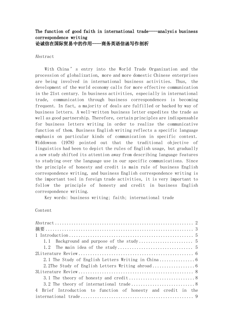 The function of good faith in international trade-analysis businesscorrespondence writing论诚信在国际贸易中的作用一—商务英语信函写作剖析AbstractWith China's entry into the World Trade Organization and theprocession of globalization,more and more domestic Chinese enterprisesare being involved in international business activities.Thus,thedevelopment of the world economy calls for more effective communicationin the 21st century.In business activities,especially in internationaltrade,communication through business correspondences is becomingfrequent.In fact,a majority of deals are fulfilled or backed by way ofbusiness letters.A well-written business letter expedites the trade aswell as good partnership.Therefore,certain principles are indispensablefor business letters writing in order to realize the communicativefunction of them.Business English writing reflects a specific languageemphasis on particular kinds of communication in specific context.Widdowson (1978)pointed out that the traditional objective oflinguistics had been to depict the rules of English usage,but graduallya new study shifted its attention away from describing language featuresto studying over the language use in our specific communications.Sincethe principle of honesty and credit is main rule of business Englishcorrespondence writing,and business English correspondence writing isthe important tool in foreign trade activities,it is very important tofollow the principle of honesty and credit in business Englishcorrespondence writing.Key words:business writing;faith;international tradeContent2摘要.351.1 Background and purpose of the study ......................51.2 The main idea of the study................................2Literature Review.................................................62.1 The Study of English Letters Writing in China...............62.2The Study of English Letters Writing abroad..................63Literature Review.................................................83.1 The theory of honesty and credit............................83.2 The theory of international trade...........................84 Brief Introduction to function of honesty and credit in theinternational trade................................................94.1 The position of honesty and credit in the international trade4.2 The problem about honesty and credit in the international trade4.3 The function of honesty and credit in the international trade5 Case study-Business English Correspondence Writing.............105.1 The formal application of faith in business English correspondencewriting in the international trade.............................105.2 The application of accuracy and specialty in the business Englishcorrespondence writing.........................................105.3 The function of polite formulas in honesty and credit principlesin the business English correspondence writing to the internationaltrade..........................................................1O11121 Introduction1.1 Background and purpose of the studyThe late 1960s and early 1970s witnessed the dramatic research intothe usage of English.Pragmatic researchers have investigated thecharacters of business letter from their specific angles in their ownresearch field.Addressers and addressees who are involved in a businessletter are supposed to cooperate with each other by complying with therule called Cooperative Principles put forward by Grice to provideadequate information.But only cooperation is not enough to accomplishthe communicative aims in business letters.Politeness is anotherimportant accelerating mode in deciding the needed kind of language andapproaches that could be adopted to write an effective letter.At times,if the writers are uncertain about the information,then Vague Languageis adoptable for him to express his opinions.And Relevance Theoryprovides guiding rules to better understand underlying meaning betweenthe lines in business letters.In this thesis,Cooperative Principle,Politeness Principle,Vague Language and Relevance Theory are therepresenting pragmatic principles the author is going to employ.They arethe basis of the ensuing explanation and analysis.Since the principle of honesty and credit is main rule of businessEnglish correspondence writing,and business English correspondencewriting is the important tool in foreign trade activities,it is veryimportant to follow the principle of honesty and credit in businessEnglish correspondence writing.This paper is aiming at the research offaith in business correspondence writing and the application in businesscorrespondence writing.1.2 The main idea of the studyThe intension of this study is to explore the function of honesty andcredit in the international trade,especially placing extra emphasis onbusiness correspondence writing.The principle of honesty and credit is the traditional virtue ofChinese nation and the core of Chinese moral culture.There are manyexpositions in ancient times,such as "From of old,death has been thelot of all men;but if people have no faith in a person,there is no standingfor that person”,“If a man does not keep his word,what is he good for?”and so on.As an all-pervading moral and standard of conduct,the principleof honesty and credit is the moral bridge of setting up a relationshipof being mutual trust and mutual benefit between trade and trade,companyand company,and people and people in modern economic society.Up to the present day,the economic trade between China and othercountries is more and more frequent.Business English is thegeneral-purpose language and the important tool in international businessactivity.As we all know,business English correspondence is now becomingan important way to communicate with each others,by the medium of whichdifferent countries start a new business,conclude a transaction andestablish friendly relationship of cooperation.It plays an importantrole in the international business activity.Literature Review2.1 The St