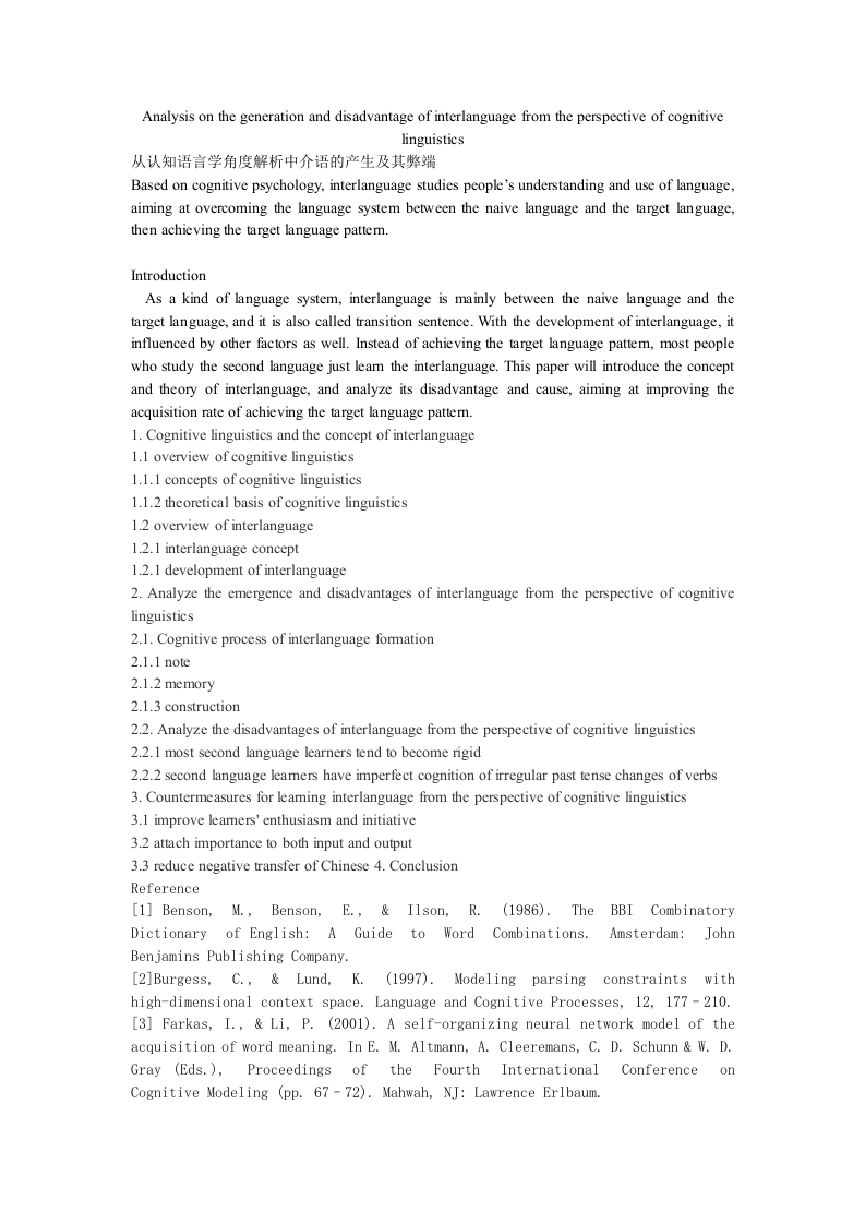 Analysis on the generation and disadvantage of interlanguage from the perspective of cognitivelinguistics从认知语言学角度解析中介语的产生及其弊端Based on cognitive psychology,interlanguage studies people's understanding and use of language,aiming at overcoming the language system between the naive language and the target language,then achieving the target language pattem.IntroductionAs a kind of language system,interlanguage is mainly between the naive language and thetarget language,and it is also called transition sentence.With the development of interlanguage,itinfluenced by other factors as well.Instead of achieving the target language pattem,most peoplewho study the second language just leam the interlanguage.This paper will introduce the conceptand theory of interlanguage,and analyze its disadvantage and cause,aiming at improving theacquisition rate of achieving the target language pattem.1.Cognitive linguistics and the concept of interlanguage1.1 overview of cognitive linguistics1.1.1 concepts of cognitive linguistics1.1.2 theoretical basis of cognitive linguistics1.2 overview of interlanguage1.2.1 interlanguage concept1.2.1 development of interlanguage2.Analyze the emergence and disadvantages of interlanguage from the perspective of cognitivelinguistics2.1.Cognitive process of interlanguage formation2.1.1 note2.1.2 memory2.1.3 construction2.2.Analyze the disadvantages of interlanguage from the perspective of cognitive linguistics2.2.1 most second language learners tend to become rigid2.2.2 second language leamers have imperfect cognition of irregular past tense changes of verbs3.Countermeasures for leaming interlanguage from the perspective of cognitive linguistics3.1 improve leamers'enthusiasm and initiative3.2 attach importance to both input and output3.3 reduce negative transfer of Chinese 4.ConclusionReference[1]Benson,M.,Benson,E.,Ilson,R.(1986).The BBI CombinatoryDictionary of English:A Guide to Word Combinations.Amsterdam:JohnBenjamins Publishing Company.[2]Burgess,C.,Lund,K.(1997).Modeling parsing constraints withhigh-dimensional context space.Language and Cognitive Processes,12,177-210.[3]Farkas,I.,Li,P.(2001).A self-organizing neural network model of theacquisition of word meaning.In E.M.Altmann,A.Cleeremans,C.D.Schunn W.D.Gray (Eds.)Proceedings of the Fourth International Conference onCognitive Modeling (pp.67-72).Mahwah,NJ:Lawrence Erlbaum.[4]Farkas,I.,Li,P.(2002).Modeling the development of lexiconwith a growing self-organizing map.In H.J.Caulfield et al.(Eds.),Proceedings of the Sixth Joint Conference on Information Science (pp.553-556).Durham,NC:Association for Intelligent Machinery.[5]Granger,S.(1998).Learner English on Computer.London New York:Longman.[6]Granger,S.,Hung,J.,Petch-Tyson,S.(2002).Computer Learner Corpora,SecondLanguage Acquisition and Foreign LanguageTeaching.Amsterdam/Philadelphia:John Benjamins Publishing Company.[7]Griffiths,T.L.,Steyvers,M.,Tenenbaum,J.B.(2007).Topicsin semantic representation.Psychological Review,114,211-244.[8]Jiang,N.(2000).Lexical representation and development in asecond language.Applied Linguistics,21,47-77.[9]Jones,M.N.,Mewhort,D.J.K.(2007).Representing word meaning and orderinformation in a composite holographic lexicon.Psychological Review,114,1-37.[10]Landauer,T.K.,Dumais,S.T.(1997).A solution to Plato's problem:Thelatent semantic analysis theory of the acquisition,induction,and representationof knowledge.Psychological Review,104,211-240.[11]程琪龙.认知语言学概论一一语言的神经认知基础[]·2003.8.[12]胡壮鳞.语言学教程(修订版)[]·北京大学出版社,2003.8.[13]胡坚.”错误”研究的理论与方法及错误纠正策略[J刀.山东外语教学,2004,(5):57-60.[14]胡月月,梁端俊.微课在大学英语教学中的应用探究[J].滁州学院报,2015(12).8992[15]林莉兰.大学英语口语纠错认识的调查与分析[J刀.合肥工业大学学报,2006.(3):138-145.[16]斯琴,赵玲玲.中介语理论研究与第二语言教学[J刀.内蒙古财经学院学报,2007(4):77-79.[17]文秋芳.“一带一路”语言人才的培养[J刀.语言战略研究,2016(2):26-32.[18]钟晓流,宋述强,胡敏,杨现民,李海霞.第四次教育革命视域中的智慧教育生态建构[J刀小.远程教育杂志,2015(4):34-40.[19]祝智庭,贺斌.智慧教育:教育信化息的新境界[J].电化教育研究,2012(12).43-44.[20]周楠,赵巍.外语环境下中介语石化现象探讨及其对国内外语教学的启示[J].沈阳工程学院学报2008(1):76-78.