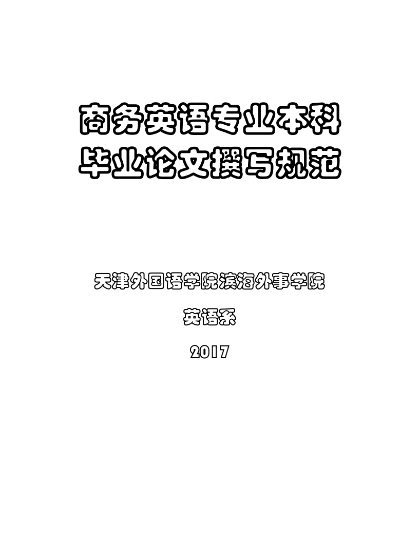 商务英语专业本科天津外国语学院滨海外事学院英语系商务英语专业本科毕业论文撰写规范一、商务英语专业本科毕业论文指导思想商务英语专业本科毕业论文是《高等学校商务英语专业英语教学大纲》规定的商务英语专业教学内容的一个重要组成部分,是考察学生综合能力、评估学业成绩的一个重要方式。毕业论文属于学术论文的范畴,具有学术论文所共有的一般属性,应按照学术论文的规范写作。为更好地规范本科毕业论文,提高论文的总体质量,特制定商务英语专业本科毕业论文撰写规范。本撰写规范可随学年度更新。二、商务英语专业本科毕业论文的程序及相关要求商务英语专业本科毕业论文一律使用英语撰写,论文正文长度在4500个英语单词左右。写作过程一般包括以下几个步骤:论文选题、收集资料、编写论文提纲、撰写初稿、反复修改、提交定稿、论文答辩等。(一)论文选题论文选题采用匿名方式,具体步骤为:1)指导教师根据个人的科研背景和教学兴趣报批选题范围,并同时提供本人的联系信息,如电话号码和电子邮件地址等。学生得到指导教师的联系信息后,即可与指导教师联系、会面,确定毕业论文的具体题目,并填写开题报告。所报选题范围经院、系审核后方可进行论文撰写工作。2)毕业论文题目应符合本专业培养目标的要求,并与所授学位一致或相关。需要特别指出的是:论文除需要采用英语撰写外,其内容也必须与语言对象国相关。同时,商务英语专业的学生不宜撰写某位中国作家的作品分析、不宜撰写中国的高考问题研究,不宜撰写中国某行业改革问题研究等题目。3)论文题目不要出现任何错误,应将有关该选题的现有资料、信息来源、技术条件等因素考虑在内。4)论文选题要有新意,尽可能联系实际,探讨如何解决实践中存在的问题。(二)收集资料学生应了解与自己所选论文题目相关的学术研究基本现状,了解学校图书馆的相关馆藏资源,了解相关资料、信息的其他来源,广泛搜集与论文题目有关的材料,及时向指导教师请教有关问题。(三)编写论文提纲论文提纲应反映论文的主要内容和写作思路。学生应在指导教师规定的时间内提交论文提纲。(四)撰写初稿和反复修改学生应在规定时间内提交论文初稿和修改稿,并与指导教师共同填写《天津外国语学院滨海外事学院毕业论文手册》。如学生不能按时完成初稿或修改稿,指导教师有权拒绝指导、评分。(五)论文定稿的文本结构及排版具体要求1)封面:由学校教务处统一提供。除有特别提示外,一律用汉语填写所有内容。2)论文首页:使用英语填写,内容包括:题目、毕业论文的性质和目的以及使用该论文申请的学位名称(具体格式参见范例:论文首页)。3)目录:标明论文各章节及主要部分的标题及页码(参见范例:论文目录)。4)论文摘要、关键词(汉语):汉语摘要应说明论文的基本思路、主要观点,语言力求简练、准确。关键词应列出3到5个,各关键词之间用分号隔开,最后一个关键词后不加标点(参见范例:论文摘要、关键词[汉语])。中文摘要独立成文,字数在100-150之间。5)论文摘要、关键词(英语):英语摘要应说明论文的基本思路、主要观点,语言力求简练、准确,长度一般不超过150字。关键词应列出3到5个,各关键词之间用分号隔开,最后一个关键词后不加标点(参见范例:论文摘要[英语])。英文摘要字数在100-150之间。6)论文正文:依照范例撰写、排版。7)注释:参见范例。8)参考文献:参见范例。9)排版格式及装订要求:论文统一使用A4复印纸打印。页边距要求:上边距2.54厘米,下边距2.54厘米,左边距4.17厘米,右边距3.17厘米。英文字体采用Times New Roman,小四号字,汉字用小四号字。1.5倍行距。答辩后上交装订好的一式两份定稿存档。(六)商务英语专业本科毕业论文答辩要求1)答辩人将于答辩前获悉答辩安排。2)答辩人根据答辩安排在指定时间到达答辩场,如提前到场将由学院安排在候答辩教室等候,然后按照指定时间进入答辩场。