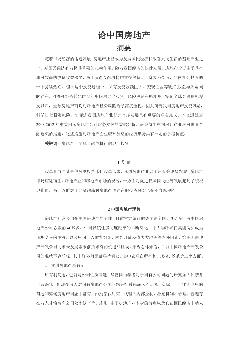 论中国房地产摘要随着市场经济的迅速发展,房地产业己成为发展国民经济和改善人民生活的基础产业之一,对国民经济有着极其重要的拉动作用。随着我国经济的快速发展,房地产投资由于具有相对较高的投资收益水平、易于获得金融机构的支持等优点,将成为今后几年内社会投资的一个持续热点。但在这个投资过程中,又有投资数额巨大、变现性差等缺点,收益与风险同时存在,对处在经济转轨时期的中国房地产投资,风险更是在所难免。特别全球金融危机爆发以后,全球房地产商均对房地产投资风险给予高度重视。因此研究我国房地产投资风险,科学防范投资风险,对促进我国房地产业健康有序发展具有重要的现实意义。本文通过对20082012年中美四家房地产公司财务实例的数据分析,最终得出中国房地产业应对世界金融危机的措施,这些措施对房地产企业应对波动的经济形势具有一定的参考价值。关键词:房地产:全球金融危机:房地产投资1引言改革开放尤其是住房制度货币化改革以来,我国房地产业如雨后春笋迅猛发展,房地产市场应运而生。房地产业和房地产市场的发展,一方面对促进我国国民经济发展起到了积极地作用,另一方面对于经济动荡时房地产也存在的投资风险也是不容忽视的。2中国房地产形势房地产开发公司是中国房地产的主体,目前官方统计的数字是全国近3万家,占中国房地产公司总数的80%多。中国城镇住房制度改革的不断深化,个人购房取代集团购买成为市场交易的主流,以及中国加入世贸组织,对外开放步伐大大迈进等内外因素,给中国房地产开发公司的未来发展带来前所未有的机遇和挑战。宏观总体来看,目前中国房地产开发公司的现状不容乐观,其中许多问题都亟待解决,集中表现在所有制、规模、效益等三个方面。2.1我国房地产所有制所有制问题,也就是公司性质问题。尽管国内学者对于国有公司问题的研究如火如茶并日益深化,但却少有人对国有房地产公司问题进行系统深入的研究。实际上,工业国企中的问题和弊端房地产国企中都有,如预算软约束。代理人内部控制,激励机制不合理、普遍存在着人才浪费和公司效率低下等。并且,由于房地产业本身的特点以及它在国民经济中越来越重要的地位而对宏观经济的增长和波动造成的影向更大,如在经济增长中房地产业的重大贡献及其对宏观经济的拉动作用,以及在历次大的经济波动中房地产业所起的推波助澜的作用甚至是决定性的破坏作用,都正在为越来越多的经济学家所重视房地产国企退出房地产业的速度较之工业国企也许更快一些。上个世纪80年代末90年代初是中国房地产公司发展的初期,国有房地产公司占了绝大多数:随着改革的深入和市场的发展,国有房地产公司的比例逐渐缩小,90年代中期下降至不到50%:到90年代末本世纪初,房地产国企的比例已然降至20%多。然而,即使是只占总数的20%,由于其占有的土地、人才、资本等社会稀缺资源的数量巨大,国有房地产公司对市场的影响仍然举足轻重。此外,如果加上大部分的集体公司、一部分并不规范的股份制公司一一这些公司在性质上其实与房地产国有公司类似,即产权不清晰,公司与政府的边界模糊,此外,其数量在统计资料中无法明确显示一一那么由于所有制问题给中国房地产公司发展带来的不利影响从而对中国房地产业的发展的制约效果就更加显著了。2.2我国房地产规模目前中国房地产开发公司“散、小、差”的特点己是有目共睹。据有关的统计资料显示,全国房地产开发公司平均净资产不足1000万元,具有一级资质的1%多一点,二级资质的不到10%,大多数是小公司或者项目公司。缺少大型房地产公司集团,即使是规模较大的开发公司也是资本少、市场份额小,如上海最大的房地产开发公司一一陆家嘴金融贸易区开发股份有限公司,也只有不到15亿美元的资本市值。据统计,全国房地产开发公司平均每家年开发量只有1.6万平方米,即使最大的房地产开发公司所占的市场份额也不足0.5%。然而,从理论上讲,房地产业所需资金量大、高投入、高回报、高风险的特性,以及房地产开发公司属于资金密集型。管理技术密集型、人才密集型公司等特点,决定了房地产开发行业的进入门槛应该较高。从国际经验看,一般大型房地产开发公司或房企集团是市场舞台的主角,占据市场的绝大份额,如香港“五大”地产商,公司资产市值都在百亿美元以上,占据了香港楼市的半壁江山。与国际经验相比,大陆房地产业进入门槛过低、房地产开发公司规模过小等问题亟待改进。2.3我国房地产效益从《中国统计年鉴》中的数据看,与“经营总收入”、“商品房屋销售收入”等指标的稳步增长相比,我国房地产开发行业的“营业利润”以及“平均利润率”等指标波动剧烈,不容乐观。我们简单地用“营业利润”除以“经营总收入”得到房地产“行业平均利润率”,可以明显地看出,1992、1993、1994年是中国房地产业发展的高峰,表现在行业利润率上是12%左右:而从1994年开始房地产公司经营利润和行业平均利润率都迅速下降,1996年行业平均利润率仅为0.91%,1997、1998、1999三年更是出现“全行业亏损”,1999年我国房地产行业平均利润率为-1.16%:2000年才开始“扭亏”为1.62%。3分析方法介绍3.1财务分析3.1.1财务分析定义财务分析是以会计核算和报表资料及其