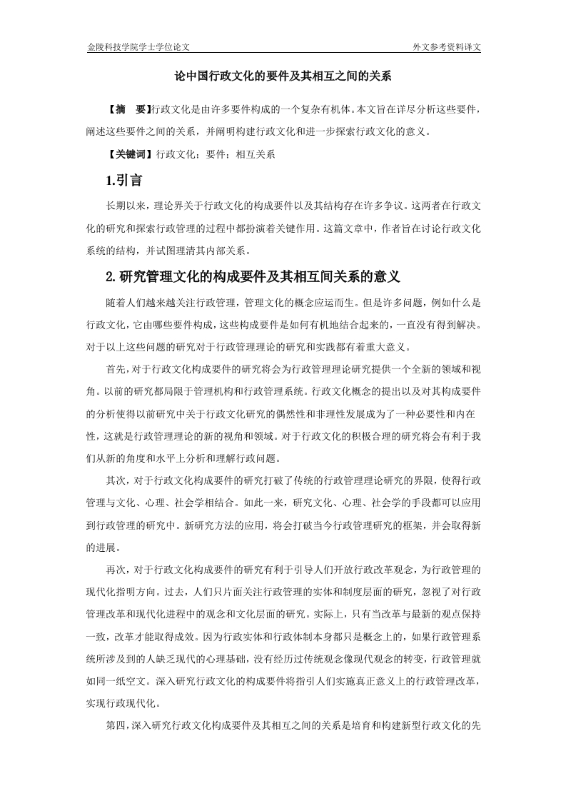 金陵科技学院学士学位论文外文参考资料译文论中国行政文化的要件及其相互之间的关系【摘要】行政文化是由许多要件构成的一个复杂有机体。本文旨在详尽分析这些要件,阐述这些要件之间的关系,并阐明构建行政文化和进一步探索行政文化的意义。【关键词】行政文化:要件:相互关系1.引言长期以来,理论界关于行政文化的构成要件以及其结构存在许多争议。这两者在行政文化的研究和探索行政管理的过程中都扮演着关键作用。这篇文章中,作者旨在讨论行政文化系统的结构,并试图理清其内部关系。2.研究管理文化的构成要件及其相互间关系的意义随着人们越来越关注行政管理,管理文化的概念应运而生。但是许多问题,例如什么是行政文化,它由哪些要件构成,这些构成要件是如何有机地结合起来的,一直没有得到解决。对于以上这些问题的研究对于行政管理理论的研究和实践都有着重大意义。首先,对于行政文化构成要件的研究将会为行政管理理论研究提供一个全新的领域和视角。以前的研究都局限于管理机构和行政管理系统。行政文化概念的提出以及对其构成要件的分析使得以前研究中关于行政文化研究的偶然性和非理性发展成为了一种必要性和内在性,这就是行政管理理论的新的视角和领域。对于行政文化的积极合理的研究将会有利于我们从新的角度和水平上分析和理解行政问题。其次,对于行政文化构成要件的研究打破了传统的行政管理理论研究的界限,使得行政管理与文化、心理、社会学相结合。如此一来,研究文化、心理、社会学的手段都可以应用到行政管理的研究中。新研究方法的应用,将会打破当今行政管理研究的框架,并会取得新的进展。再次,对于行政文化构成要件的研究有利于引导人们开放行政改革观念,为行政管理的现代化指明方向。过去,人们只片面关注行政管理的实体和制度层面的研究,忽视了对行政管理改革和现代化进程中的观念和文化层面的研究。实际上,只有当改革与最新的观点保持一致,改革才能取得成效。因为行政实体和行政体制本身都只是概念上的,如果行政管理系统所涉及到的人缺乏现代的心理基础,没有经历过传统观念像现代观念的转变,行政管理就如同一纸空文。深入研究行政文化的构成要件将指引人们实施真正意义上的行政管理改革,实现行政现代化。第四,深入研究行政文化构成要件及其相互之间的关系是培育和构建新型行政文化的先金陵科技学院学士学位论文外文参考资料译文决条件。在市场经济的大背景下,培育和重构行政文化己经成为行政改革的当务之急。这就要求行政管理人员从整体上理解把握好行政文化,掌握行政文化的各个要件及其相互关系。3.行政文化的构成要件中山大学的夏淑章教授从宏观上将行政文化区分为主体行政文化和客体行政文化。主体行政文化指的是从主观上影响行政主体态度、情感和价值观等的因素。客体行政文化指的是在实施行政行为的过程中产生影响,以及行政主体的观念,包括行政系统、传统、习惯等因素。在这种区分下,作者根据在行政管理过程中在心理层面所起到的作用的不同进一步将主体行政管理划分为行政观念和行政意志。行政心理主要包括行政形态、行政评价、行政感知、道德和其他因素。而行政意志则包括行政态度、动机、习惯等。3.1主体行政文化要件的含义3.1.1行政心理的构成行政心态。行政心态形成于行政活动的起始阶段,并随行政活动的展开而不断变化。行政心态是人们对具体行政活动所持的情绪、感知方式和态度的总和。行政心态有三个特征:一是产生的自发性、非理性:而是表现的不稳定性:三是影响的潜在性或内在性。行政评价。行政评价是特定意识形态下,人们对社会实际存在或可能发生的各种行政行为所作的价值判断,以达到去伪存真、扬善抑恶的目的。行政评价一般分为社会评价与自我评价两种形式。社会评价主要指社会舆论,期中包括一定社会集团和阶级有意识、有目的地通过舆论工具所传播的正式社会舆论,也包括人们自发产生并自然传播的民间舆论。社会舆论在性质上有进步与落后之分,在作用上有积极与消极之别。自我评价主要借助于内心信念或主观意志的作用,在评价中,个体自身既是评价者,又是被评价者。行政感知。行政感知是人们决心达到某种行政活动目的而产生的精神状态,是行政心态上升至理性的强化结果。行政感知的表现形式有行政观念与行政活动中的行为倾向两种形式,实质上是人做出某一行政行为时在对错之间实行的选择,是人的主观能动性的重要体现。3.1.2行政意志的构成行政态度。行政态度指的是行政工作人员在长期的行政管理过程中所形成的价值评价和行为倾向。行政态度的形成是行政人员在特定环境下的内心活动的结果,是他们对具体事件的观念上的一种映射。行政态度包括三个方面一一行政习惯,行政情感和行政动机。这三个要件大部分情形下都是和谐一体的。行政动机。行政动机是行政主体的主观意愿,意图等。动机是一起特定行为以达到相应金陵科技学院学士学位论文外文参考资料译文目的的心理上的过程。因此,它是激励行政主体为行政行为的动因。它可以被区分为积极的行政动机和消极的行政动机。行政情感。行政情感是行政工作人员在实施行