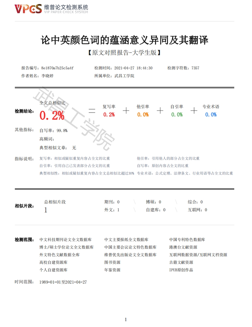 维普论文检测系统VIP PAPER CHECK SYSTEM论中英颜色词的蕴涵意义异同及其翻译【原文对照报告-大学生版】报告编号:8e1870a7b25c5a4f检测时间:2021-04-2718:44:30检测字符数:7357作者姓名:李晓婷所属单位:武昌工学院全文总相似比复写率他引率自引率专业术语检测结论:0.2%0.0%0.0%0.0%其他指标:自写率:99.8高频词:工学院0.2%典型相似文章:无指标说明:复写率:相似或疑似重复内容占全文的比重他引率:引用他人的部分占全文的比重自引率:引用自己已发表部分占全文的比重自写率:原创内容占全文的比重典型相似性:相似或疑似重复内容占全文总相似比超过30%专业术语:公式定理、法律条文、行业用语等占全文的比重总相似片段期刊:0博硕:0综合:0相似片段:外文:1自建库:0互联网:0检测范围:中文科技期刊论文全文数据库中文主要报纸全文数据库中国专利特色数据库博士/硕士学位论文全文数据库中国主要会议论文特色数据库港澳台文献资源外文特色文献数据全库维普优先出版论文全文数据库互联网数据资源/互联网文档资源高校自建资源库图书资源古籍文献资源个人自建资源库年鉴资源IPUB原创作品时间范围:1989-01-01至2021-04-27维普论文检测系统VIP PAPER CHECK SYSTEM原文对照颜色标注说明:■自写片段■复写片段(相似或疑似重复)口引用片段(引用)■专业术语(公式定理、法律条文、行业用语等)WUCHANG INSTITUTE OF TECHNOLOGY本科毕业论文(设计)论文题论中英颜色词的蕴涵意义异同及其翻译目On the Similarities and Differences in the Connotations of Chinese and English ColorWords and Their Translation李晓婷学号173009030104班级:翻译1701班2017级专业国际教育学院指导教师雷慧慧讲师李云霞译员完成时2021年5月3日间作者声明本毕业论文(设计)是在导师的指导下由本人独立撰写完成的,没有剽窃、抄袭、造假等违反道德、学术规范和其他侵权行为。对本论文(设计)的研究做出重要贡献的个人和集体,均已在文中以明确方式标明。因本毕业论文(设计)引起的法律结果完全由本人承担。2维普论文检测系统VIP PAPER CHECK SYSTEM毕业论文(设计)成果归武昌工学院所有。特此声明作者专业翻译作者学号173009030104作者签名年月日摘要语言和文化密不可分,语言是文化的载体,是文化最直接的、最重要的表达形式。而颜色词与我们的生活息息相关,人类通过对色彩的感知去了解世界。不少的四字成语中都含有颜色词,那么颜色词是怎么体现不同国家的特征和文化呢,本文将探讨在不同文化背景下,颜色词蕴涵意义的异同,以及分析颜色词的翻译,最终得出结论。其目的在于帮助翻译者在从事翻译工作时更准确形象地翻译颜色词,进一步达到跨文化交际的目的,同时也有助于人们在日常生活中更好的运用颜色词表意,有利于来自两个不同背景的人进行沟通,让人们对于两国文化有更深刻的了解,本篇论文对从事跨文化交际者研究颜色词的工作有一定的帮助。第一部分为绪论,介绍了本文的研究背景、意义和结构。第二部分回顾国内外关于颜色词的寓意和翻译的文献,总结研究成果。第三部分是对汉英基本颜色词含义的简要描述和比较。第四部分是颜色词翻译的研究。最后一部分是结论,总结了全文的主要发现,简述了本文的不足之处,以及后期研究研究提出建议。关键词:中英颜色词:蕴涵意义:差异:翻译AbstractLanguage and culture are inseparable.language is the carrier of culture,is the most direct andimportant expression of culture.Color words are closely related to our life,and human beingsunderstand the world through the perception of color.Many four-character idioms contain color words,so how do color words reflect thecharacteristics and cultures of different countries?This paper will discuss the similarities anddifferences of the connotative meanings of color words in different cultural backgrounds,andanalyze the translation of color words,and finally draw a conclusion.Its purpose is to helptranslators translate color words more accurately and vividly when they are engaged in translationwork,further achieve the purpose of cross-cultural commmunication,and also help people to betteruse color words in their daily life.It is helpful for people from two different backgrounds tocommunicate and let people have a deeper understanding of the two cultures.This paper is helpfulfor people engaged in cross-cultural communication to study color words.The first part is the introduction,which introduces the research background,significance andstructure of this paper.The second part reviews the literature on the meaning and translation ofcolor words at home and abroad,and summarizes the research results.The third part is a briefdescription and comparison of the meanings of basic color words in Chinese and English.The fourthpart is about the translation of color words.The last part is the conclusion,summarize the mainfindings of the full text,briefly describe the deficiencies of this paper,as well as laterresearch recommendations.Key words:color words in Chinese and English;connotative meaning:differences;translationContents1.Introduction21.1 Background of the research21.2 Significance of the research21.3 Structure of this paper22.Literature Review33
