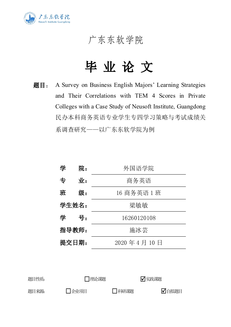 广东东软学院毕业论文题目:A Survey on Business English Majors'Learning Strategiesand Their Correlations with TEM 4 Scores in PrivateColleges with a Case Study of Neusoft Institute,Guangdong民办本科商务英语专业学生专四学习策略与考试成绩关系调查研究一一以广东东软学院为例学院:外国语学院专商务英语班级:16商务英语1班学生姓名:梁敏敏学号:16260120108指导教师:施冰芸提交日期:2020年4月10日题目性质:☐理论课题☑实践课题题目来源☐企业项目☐科研课题☑自拟题目A Survey on Business English Majors'Learning Strategies andTheir Correlations with TEM 4 Scores in Private Colleges with aCase Study of Neusoft Institute,GuangdongbyLiang MinminUnder the Supervision ofShi BingyunSubmitted in Partial Fulfillment of the RequirementsFor the Degree of Bachelor of Arts诚信宣言我,xxx,郑重宣布:除了参考文献所标明引用的资料和内容之外,本论文中不包含有任何已经被其他高等教育机构所接受的学位或学历论文资料,也不包含有其他任何人已经正式出版的资料内容。签字:日期:DeclarationI declare that this document embodies the results of my own work and that it hasbeen composed by myself.Following normal academic conventions,I have made dueacknowledgement of the work of others.I am fully aware of the legal consequencesof this statement.Signed:Date:已经在导师的指导下进行多次修改,导师已同意提交定稿。导师签名:日期: