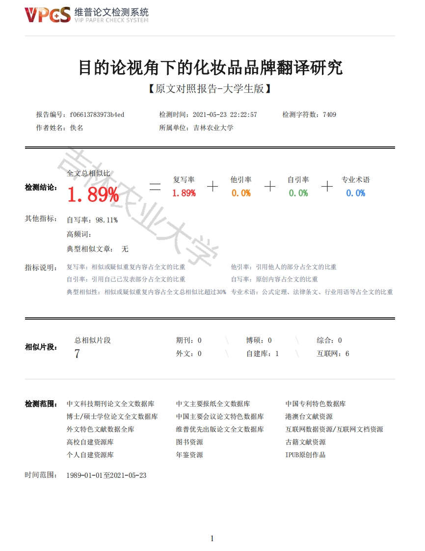 维普论文检测系统/IP PAPER CHECK SYSTEM目的论视角下的化妆品品牌翻译研究【原文对照报告-大学生版】报告编号:f06613783973b4ed检测时间:2021-05-2322:22:57检测字符数:7409作者姓名:佚名所属单位:吉林农业大学全文总相似比复写率他引率自引率专业术语检测结论:1.89%1.89%0.0%0.0%0.0%其他指标:自写率:98.11%高频词:典型相似文章:无指标说明:复写率:相似或疑似重复内容占全文的比重他引率:引用他人的部分占全文的比重自引率:引用自己已发表部分占全文的比重自写率:原创内容占全文的比重典型相似性:相似或疑似重复内容占全文总相似比超过30%专业术语:公式定理、法律条文、行业用语等占全文的比重总相似片段期刊:0博硕:0综合:0相似片段:外文:0自建库:1互联网:6检测范围:中文科技期刊论文全文数据库中文主要报纸全文数据库中国专利特色数据库博士/硕士学位论文全文数据库中国主要会议论文特色数据库港澳台文献资源外文特色文献数据全库维普优先出版论文全文数据库互联网数据资源/互联网文档资源高校自建资源库图书资源古籍文献资源个人自建资源库年鉴资源IPUB原创作品时间范围:1989-01-01至2021-05-23维普论文检测系统VIP PAPER CHECK SYSTEM原文对照颜色标注说明:■自写片段■复写片段(相似或疑似重复)口引用片段(引用)■专业术语(公式定理、法律条文、行业用语等)吉林农业大学学士学位论文论文题目:目的论视角下的化妆品品牌翻译研究学生姓名:杜敏专业年级:英语专业2017级2班指导教师:郭继鹏职称讲师2021年5月25日ContentsTitle.…Abstract andKeywords..............I.Introduction 1II.Literature Review 32.1Background Information of Cosmetics Brand 32.1.1 The Definition on Brand Name 42.1.2 Functions and Characteristics of Brand Name 42.2 The Previous Studies on Brand Names 52.2.1 Studies on Brand Names Abroad 62.2.2 Studies on Brand Names at Home 7III.Theoretical Framework 73.1Introduction of Skopos Theory 83.2The Definition of Skopos Theory 93.3The Rules of Skopos Theory 9IV.Application of Skopos Theory in Cosmetic Brand Name Translation 94.1 The Skopos Theory in Cosmetic Brand Name 104.1.1 The Realization of Impressive Function 112维普论文检测系统VIP PAPER CHECK SYSTEM4.1.2 The Realization of Informative Function 124.1.3 The Realization of Aesthetic Function 124.1.4 The Realization of Vocative Function 134.2 Strategies Used in Cosmetic Brand Name Translation 134.2.1 Transliteration 144.2.2 Literal Translation 154.2.3 Combination of Transliteration and Liberation and Literal Translation 164.2.4 Coinage 164.3 Factors Considered in Cosmetic Brand Name Translation 174.3.1 Guidance in Translation Process 184.3.2 Evaluation on Translation Outcome 19V.Conclusion 20References 21Acknowledgements 22A Study of Translation of Cosmetic Brands from the Perspective of Skopos TheoryName:Du MinMajor:EnglishTutor:Guo JipengAbstract:With the rapid development of China's economy and the acceleration of the process ofglobalization,China's exchanges with the rest of the world are increasingly frequent and in-depth,and the scope of trade with the rest of the world is also expanding.Brand has always been comparedto the golden name card of products,it is not only a symbol of the name of a product,but also theconcentrated embodiment of product quality and enterprise reputation,is the carrier of enterprisespirit,culture and personality.Therefore,in cross-cultural economic communication,thetranslation level of brand name directly affects the recognition degree of the product among thetarget consumers,affects the economic benefit and corporate image of the enterprise,and evenaffects the cross-cultural communication.Therefore,from both academic and economic perspectives,brand translation should have a place in the field of translation.Keywords:Cosmetic brand:Skopos theory:translation目的论视角下的化妆品品牌翻译研究学生:杜敏专业:英语指导教师:郭继鹏摘要:随着我国经济的快速发展和全球化进程的加快,我国与世界各国的交流日益频繁和深入,与世界各国的贸易范围也日益扩大。品牌总是被喻为产品的黄金名片,它除了是一个产品名字的符号象征之外,更是产品质量和企业信誉的集中体现,是企业精神、文化和个性的载体。因此,在跨文化经济交流中,品牌名称的翻译水平直接影响到产品在目标消费者中的认可程度,影响到企业的经济效益和企业形象,甚至影响到跨文化交际。因此,无论是从学术的角度还是从经济的角度来说,品牌翻译都应该在翻译领域中拥有一席之地。关键词:化妆品品牌:目的论;翻译I.Introduction1.1 Background of the StudyWith the intensification of economic globalization and the rapid development of my country'seconomy,China has expanded its international trade with more countries in more fields.More andmore foreign products are pouring into the Chinese market.At the same time,many Chinese productsare also entering foreign markets.But how to make products win fierce competition,how to make themaccept consumers in the market,so that how the goal of making profit can be achieved is a problem,all enterprises must face.It is undeniable that good product quality and reasonable price are both3