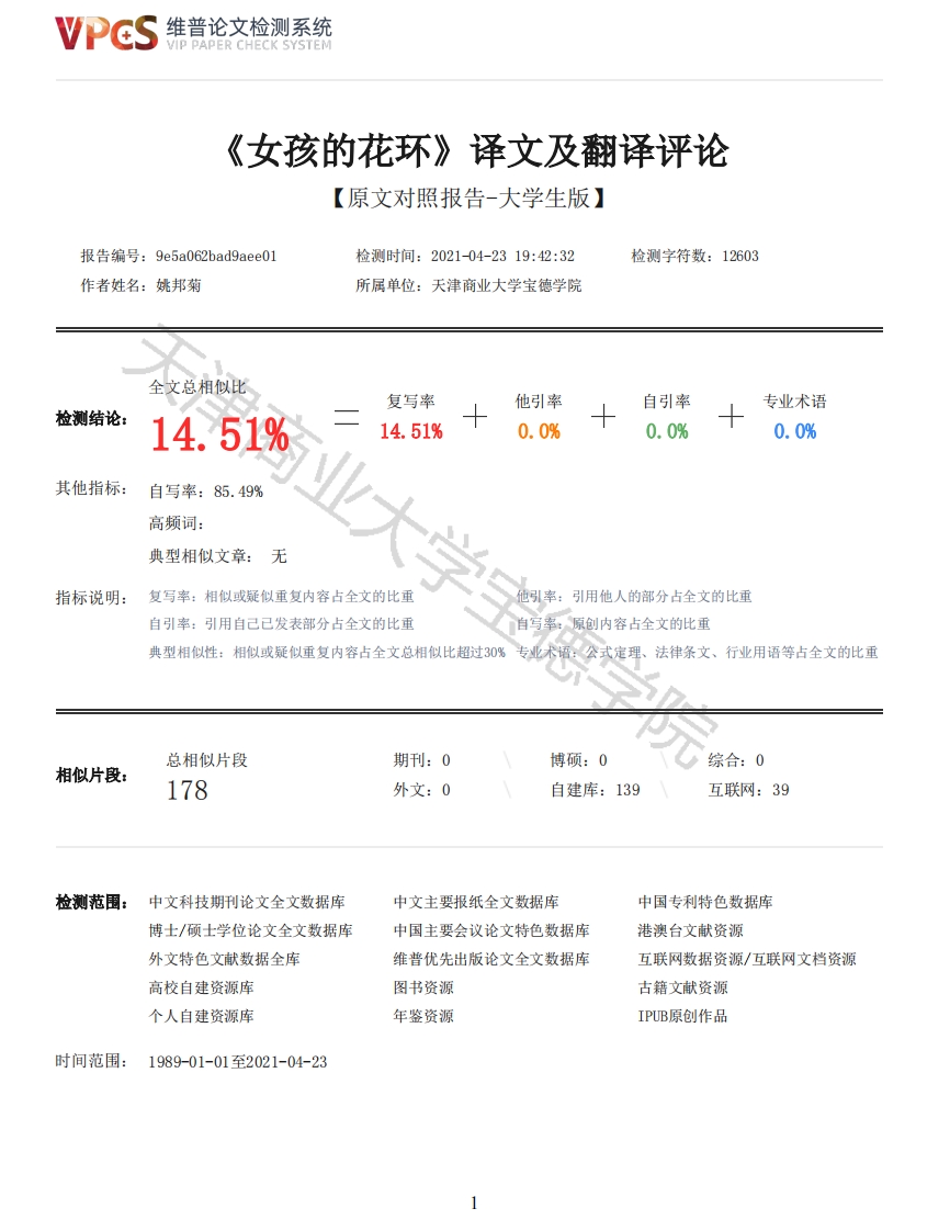 维普论文检测系统VIP PAPER CHECK SYSTEM《女孩的花环》译文及翻译评论【原文对照报告-大学生版】报告编号:9e5a062bad9aee01检测时间:2021-04-2319:42:32检测字符数:12603作者姓名:姚邦菊所属单位:天津商业大学宝德学院全文总相似比复写率他引率自引率专业术语检测结论:14.51%14.51%0.0%0.0%0.0%其他指标:自写率:85.49%高频词:典型相似文章:无指标说明:复写率:相似或疑似重复内容占全文的比重他引率:引用他人的部分占全文的比重自引率:引用自己已发表部分占全文的比重自写率:原创内容占全文的比重典型相似性:相似或疑似重复内容占全文总相似比超过30%专业术语:公式定理、法律条文、行业用语等占全文的比重总相似片段期刊:0博硕:0综合:0相似片段:178外文:0自建库:139互联网:39检测范围:中文科技期刊论文全文数据库中文主要报纸全文数据库中国专利特色数据库博士/硕士学位论文全文数据库中国主要会议论文特色数据库港澳台文献资源外文特色文献数据全库维普优先出版论文全文数据库互联网数据资源/互联网文档资源高校自建资源库图书资源古籍文献资源个人自建资源库年鉴资源IPUB原创作品时间范围:1989-01-01至2021-04-23维普论文检测系统VIP PAPER CHECK SYSTEM原文对照颜色标注说明:■自写片段■复写片段(相似或疑似重复)口引用片段(引用)■专业术语(公式定理、法律条文、行业用语等)AbstractThis report is an English-Chinese translation practice.A Garland for Girls was originallywritten as a short story by Louisa May Alcott.The story was an excerpt from a short story in the AGarland for Girls,which was written for her own amusement during a period of enforced seclusion.Asthe flower gives the author inspiration and comfort,she uses the name of the flower to set thetitle for each short story,and each kind of flower has its own unique meaning.It is aninspirational short story with vivid images and the succinct clear language.The excerpt of thisshort story is mainly about a group of lovely girls who try their best to help others,and finallyshare their own gains and reap the joy of success in an appropriate way.In this report,A Garland for Girls is translated from the perspective of translator'ssubjectivity.The author also discusses the difficulties in the process of the translation,and thenmakes some solutions and summarize the strategies of translation.As for construction of the paper,it is divided into four parts:source language text with 3600 words,target language text with 6000words,translation analysis and conclusion.Background of the original text,translation theory andcase analysis are composed of the translation analysis.Key Words:literary translation;translator's subjectivity:case analysis摘要这篇报道是英汉翻译实践,《女孩的花环》最初是由路易莎·梅·奥尔科特以短篇小说的形式写成的。这个故事摘录自《女孩的花环》中的一篇短故事,这是在作者在一段被迫与世隔绝的时期自娱自乐而写的。因为花给了作者灵感和慰藉,因此用花的名字给每个小故事定了标题,每一种花都有其独特的意义。作者以生动形象的人物,简洁明了的语言描写了一个个励志的小故事。节选的这个小故事主要讲述一群可爱的女孩,尽自己所能去帮助别人,并且是以恰当的方式,最后分享自己所得,收获成功的喜悦的心情。译文是由译者是从译者主体性视角出发翻译而成的。根据翻译过程中遇到的问题,译者分别做出了相应的具体措施,从而总结出了小说英译的策略。本篇实践报告主要有四部分:三千六百字的源语言文本,六千字的目标语言文本,翻译分析和本次翻译实践的总结。其中,翻译分析包括文章背景、所用翻译理论和在译者主体性视角下的具体翻译案例分析。本篇报告的核心内容在于翻译理论和具体案例分析。关键词:文学翻译:译者主体性:案例分析ContentsIntroduction4Source Language Text5Target Language Text162维普论文检测系统VIP PAPER CHECK SYSTEMTranslation Analysis251 Background of the Source Text251.1 Introduction of the Author251.2 Main Content of the Source Text252 Translation Theory262.1 Stylistic Analysis of the Source Text262.2 Translator's Subjectivity263 Case Analysis from the Perspective of Translator's Subjectivity273.1 The Translation of Culture-Loaded Words273.1.1 Domestication293.1.2 Free Translation303.1.3 Addition 313.2 The Translation of the Sentence323.2.1 Division323.2.2 Logic Relationship343.2.3 Conversion of the Voice 353.3 Parallelism36Conclusion38References41IntroductionWith the continuous exchange of Chinese and foreign cultures,translation plays a more and moreimportant role to connect Chinese and foreign cultures.Nowadays,high-quality translation works cannot only let our people see the cultural essence of other nationalities,but also present ourexcellent culture and viewpoints to other countries better.The high-level translators are themedium of cultural communication,which can promote social development and cultural exchanges.The novel is a kind of medium to communicate culture.It reflects the customs and consciousnessin different cultures.It is the most direct and interesting way for people to understand a culture.Therefore,many novels have been translated into foreign languages.Also,you can see many novels inall languages are translated in Chinese.A Garland for Girls is one of Louisa May Alcott's novels.Louisa May Alcott is an Americanwriter and professor.Her masterpiece Little Women is a classic of American literature.After itspublication,Little Women has been a great success and has become a recognized American masterpiece.In the novel of A Garland for Girls,flowers are the main element of the novel.This article shouldbe used as a transl