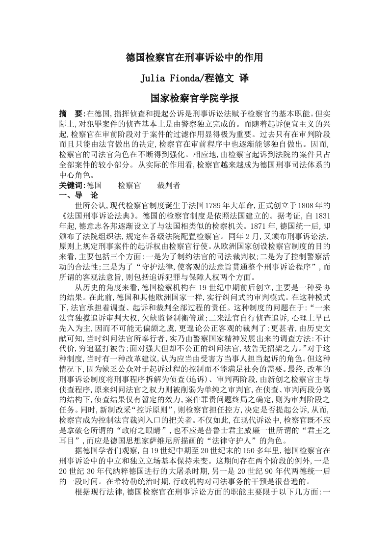德国检察官在刑事诉讼中的作用Julia Fionda/,程德文译国家检察官学院学报摘要:在德国,指挥侦查和提起公诉是刑事诉讼法赋予检察官的基本职能。但实际上,对犯罪案件的侦查基本上是由警察独立完成的。而随着起诉便宜主义的兴起,检察官在审前阶段对于案件的过滤作用显得极为重要。过去只有在审判阶段而且只能由法官做出的决定,检察官在审前程序中也逐渐能够独自做出。因而,检察官的司法官角色在不断得到强化。相应地,由检察官起诉到法院的案件只占全部案件的较小部分。从实际的作用看,检察官越来越成为德国刑事司法体系的中心角色。关键词:德国检察官裁判者一、导论世所公认,现代检察官制度诞生于法国1789年大革命,正式创立于1808年的《法国刑事诉讼法典》。德国的检察官制度是依照法国建立的。据考证,自1831年起,德意志各邦逐渐设立了与法国相类似的检察机关。1871年,德国统一后,即颁布了法院组织法,规定在各级法院配置检察官。同年2月,又颁布刑事诉讼法,原则上规定刑事案件的起诉权由检察官行使。从欧洲国家创设检察官制度的目的来看,主要包括三个方面:一是为了制约法官的司法裁判权:二是为了控制警察活动的合法性:三是为了“守护法律,使客观的法意旨贯通整个刑事诉讼程序”,而所谓的客观法意旨,则包括追诉犯罪与保障人权两个方面。从历史的角度来看,德国检察机构在19世纪中期前后创立,主要是一种妥协的结果。在此前,德国和其他欧洲国家一样,实行纠问式的审判模式。在这种模式下,法官承担着调查、起诉和裁判全部过程的责任。这种制度的问题在于:“一来法官独揽追诉审判大权,欠缺监督制衡管道:二来法官自行侦查追诉,心理上早已先入为主,因而不可能无偏颇之虞,更遑论公正客观的裁判了:更甚者,由历史文献可知,当时纠问法官所奉行者,实乃由警察国家精神发展出来的调查方法:不计代价,穷追猛打被告:面对强大但却不公正的纠问法官,被告无招架之力。”对于这种制度,当时有一种改革建议,认为应当由受害方当事人担当起诉的角色。但这种情况下,因为缺乏公众对于起诉过程的控制而不能满足社会的需要。最终,改革的刑事诉讼制度将刑事程序拆解为侦查(追诉)、审判两阶段,由新创之检察官主导侦查程序,原来纠问法官之权力则被削弱为单纯之审判官,在侦查、审判两段分离的结构下,侦查结果仅有暂定的效力,案件罪责问题终局之确定,则为审判阶段之任务。同时,新制改采“控诉原则”,则检察官担任控方,决定是否提起公诉,从而,检察官成为控制法官裁判入口的把关者。不仅如此,在现代诉讼中,检察官既不应是拿破仑所谓的“政府之眼睛”,也不应是普鲁士君主威廉一世所谓的“君王之耳目”,而应是德国思想家萨维尼所描画的“法律守护人”的角色。据德国学者们观察,自19世纪中期至20世纪末的150多年里,德国检察官在刑事诉讼中的中立和独立立场基本保持未变。这期间存在两个阶段的例外,一是20世纪30年代纳粹德国进行的大屠杀时期,另一是20世纪90年代两德统一后的一段时间。在希特勒统治时期,行政机构对司法事务的干预是很普遍的。根据现行法律,德国检察官在刑事诉讼方面的职能主要限于以下几方面:一是负责对刑事犯罪和违法行为进行侦查,有权指挥司法警察:二是提起公诉:三是对刑罚的执行进行监督。具体来说,包括:(1)受理对犯罪的检举:(2)领导和指挥警察进行侦查:(3)可以暂时采取拘留、逮捕、搜查、扣押等强制措施:(4)决定是否提起公诉:(⑤)在法庭审理阶段,担任国家公诉人,同时监督审判程序是否合法:(6)在认为必要时提起上诉、抗诉和要求复审:(7)对已经生效的判决,检察官有权提出缓期执行或者监外执行的要求:(8)此外,检察机关同时还是刑罚执行机关。根据州的法律,也可以是赦免机关,因此检察机关享有这方面的相应的职责及权力。从制度和理论层次上来说,德国检察官的作用具有以下几方面的特点:其一德国检察官在刑事诉讼中参与范围广,具有多方面的权力,而且它还具有保证刑事诉讼程序的正确性和合法性的责任,因而,从一般意义上,德国检察官在刑事诉讼中也具有十分重要的地位和作用。其二,从诉讼构造和诉讼职能的角度来说,德国检察官在刑事诉讼中具有控诉方的地位,承担着控诉犯罪的职能。因为德国实行起诉法定主义,只有检察院才有权提起诉讼。因而,检察官对刑事起诉占有垄断的地位。其三,从诉讼程序的关系来说,固然公诉行为具有拘束审判活动的效力,但总体上来说,法官对于检察官具有优越地位。从刑事诉讼程序全过程来看,法官是整个诉讼程序的中心人物。这是现代辩论式诉讼的基本特征。但纸面上的法律固然在一国的法律文化中具有不可忽视的地位,但实际上,没有哪一个国家能够完全按照法律所描画的图景去进行社会治理。二、德国检察官在刑事侦查中的作用根据德国刑事诉讼法的规定,检察官领导和指挥警察进行侦查。因而,从理论上,检察官是德国刑事侦查的主人。因而,侦查权由检察官行使是德国刑事侦查程序的十分显著的特点。在德国,司法警察或刑事警察只是检察官的助手,在检察官的领导和指挥下实施具体的侦查活动。检察官的这一主导地位是在1974年的刑事司法改革法中确立的。此前,德国侦查的领导权和起诉决定权由预审法官负