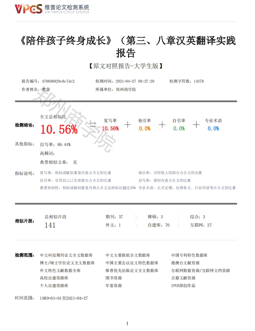 维普论文检测系统VIP PAPER CHECK SYSTEM《陪伴孩子终身成长》((第三、八章汉英翻译实践报告【原文对照报告-大学生版】报告编号:470606929c8c7dc2检测时间:2021-04-2709:27:20检测字符数:14378作者姓名:樊登所属单位:郑州商学院全文总相似比复写率他引率自引率专业术语检测结论:10.56%学院0.56%0.0%0.0%0.0%其他指标:自写率:89.44%高频词:典型相似文章:无指标说明:复写率:相似或疑似重复内容占全文的比重他引率:引用他人的部分占全文的比重自引率:引用自己已发表部分占全文的比重自写率:原创内容占全文的比重典型相似性:相似或疑似重复内容占全文总相似比超过30%专业术语:公式定理、法律条文、行业用语等占全文的比重总相似片段期刊:37博硕:3综合:3相似片段:141外文:1自建库:70互联网:27检测范围:中文科技期刊论文全文数据库中文主要报纸全文数据库中国专利特色数据库博士/硕士学位论文全文数据库中国主要会议论文特色数据库港澳台文献资源外文特色文献数据全库维普优先出版论文全文数据库互联网数据资源/互联网文档资源高校自建资源库图书资源古籍文献资源个人自建资源库年鉴资源IPUB原创作品时间范围:1989-01-01至2021-04-27维普论文检测系统VIP PAPER CHECK SYSTEM原文对照颜色标注说明:■自写片段■复写片段(相似或疑似重复)口引用片段(引用)■专业术语(公式定理、法律条文、行业用语等)学号20190221235郑州商学院本科毕业论文(设计)◆"Accompanying children to grow up for life "(Chapters 3 and 8)Chinese-English TranslationPractice Report《陪孩子终身成长》(第三、八章)汉英翻译实践报告院部名称:外国语学院专业名称:英语学生姓名:朱焕指导教师:彭艳华(副教授)王莉莉(助教)2021年4月31日"Accompanying children to grow up for life "(Chapters 3 and 8)Chinese-English TranslationPractice ReportA thesis submitted toZhengzhou Business Universityin partial fulfillment of the requirementsforthe Degree of Bachelor of ArtsByZhu HuanSupervisor:Peng Yanhua,Wang LiliApr 31th,2021AbstractWith the demands of education in western countries,the current situation of the parenting trackhas left countless parents feeling confused and helpless.This translation practice report is basedon Accompanying Children to Grow Up for Life.The third and eighth chapters are translated.Sourcetext is an argumentative text,have important practical value.This translation report is guided by Newmark's semantic translation and communicativetranslation theory.It mainly includes four parts:translation task description,translation processdescription,translation case analysis and summary.The first part is the source material,theauthor introduction and the work introduction;the second part is the description of the translation2维普论文检测系统VIP PAPER CHECK SYSTEMprocess,which introduces in detail the prepretranslation preparation,translation process andposttranslation matters;the third part is a case analysis,in the translation practice.Translationpractice,analyze vocabulary,grammar,and text translation from semantic translation andcommunicative translation,and explore translation techniques and methods.In the translationprocess,the translator mainly uses domestication and foreignization translation methods for theword translation of the text.For the translation with Chinese habit,the translation withoutsubject sentence is used.For the translation of classical Chinese,the translation of augmentationand translation is used.For incisive and short sentences,used substitution and omission.The fourthpart is a summary of translation practice.It should be loyal to the original author's ideologicalcontent and the original author's language style.Semantic translation reproduces the accuratecontextual meaning of the original author in syntax and semantics.Commmunicative translation focuseson readability,accurately conveys the original communicative information to readers.The translatorhas learned that it is necessary to consider the contextual meaning of the text,communicationneeds.Key Words Argumentative Text;Accompanying Children to Grow Up for Life:Semantic Translation摘要西方国家教育的需求,亲子教育逐渐进入大众视野,亲子教育赛道的现状令无数家长感到迷茫无助。本翻译实践报告是以《陪伴孩子终身成长》为文本,对第三章和第八章进行翻译,源文本为议论型文本,具有重要的实践价值。本翻译报告以纽马克的语义翻译与交际翻译理论为指导,主要包括翻译任务描述,翻译过程描述,翻译案例分析和总结四部分。第一部分为材料来源、作者简介和作品简介:第二部分为翻译过程描述,详细介绍译前准备、翻译过程和译后事项:第三部分案例分析,在翻译实践中,通过《陪孩子终身成长》翻译实践,从语义翻译和交际翻译中分析词汇,语法,文本贴切程度的翻译,探讨翻译的技巧和方法。在翻译过程中,词汇的翻译,译者主要运用归化和异化翻译方法,句法层面主要分析无主句的翻译,文言文的翻译,使用增译和减译的方法,精辟而简短的句子,使用替代法和省略法。第四部分为翻译实践总结,议论文本,应以原作者为核心,既要忠于原作者表达的思想内容,又要忠实原作者的语言风格。语义翻译,在句法和语义中,再现原作者的准确语境意义,交际翻译以可读性为主,向读者准确地传递原文的交际信息。译者学习到了需要考虑文本的语境意义和交际需要。关键词:议论型文本:《陪孩子终身成长》;语义翻译与交际翻译理论AcknowledgementsFirst of all,the two-year undergraduate course is about to end.In two years,I have gainedknowledge,friendship and friendship and growth.Secondly,in the guidance of the 