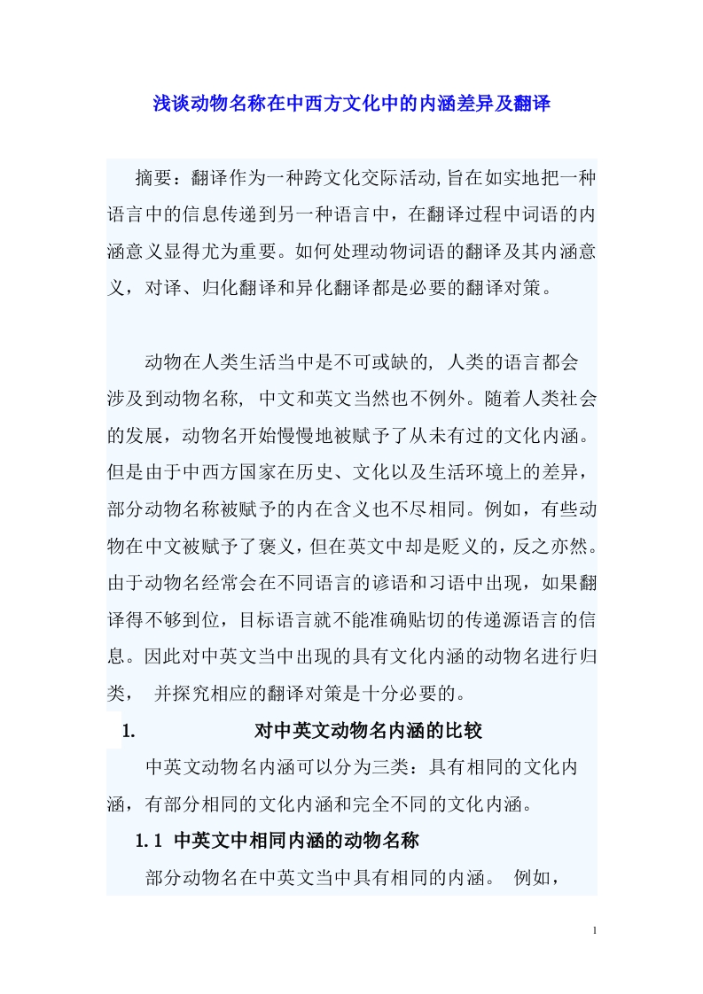 浅谈动物名称在中西方文化中的内涵差异及翻译摘要:翻译作为一种跨文化交际活动,旨在如实地把一种语言中的信息传递到另一种语言中,在翻译过程中词语的内涵意义显得尤为重要。如何处理动物词语的翻译及其内涵意义,对译、归化翻译和异化翻译都是必要的翻译对策。动物在人类生活当中是不可或缺的,人类的语言都会涉及到动物名称,中文和英文当然也不例外。随着人类社会的发展,动物名开始慢慢地被赋予了从未有过的文化内涵。但是由于中西方国家在历史、文化以及生活环境上的差异,部分动物名称被赋予的内在含义也不尽相同。例如,有些动物在中文被赋予了褒义,但在英文中却是贬义的,反之亦然。由于动物名经常会在不同语言的谚语和习语中出现,如果翻译得不够到位,目标语言就不能准确贴切的传递源语言的信息。因此对中英文当中出现的具有文化内涵的动物名进行归类,并探究相应的翻译对策是十分必要的。1.对中英文动物名内涵的比较中英文动物名内涵可以分为三类:具有相同的文化内涵,有部分相同的文化内涵和完全不同的文化内涵。1.1中英文中相同内涵的动物名称部分动物名在中英文当中具有相同的内涵。例如,驴(donkey):驴在中文和英文中都被认为是不讨人喜爱的动物。在英文中如果要说某人愚蠢或固执就会说“heisan absolute donkey”。中文相同的表达方法是“他倔得像头驴,蠢驴”。狐狸(fox):在中文和英文的寓言故事中狐狸的形象总是奸诈狡猾的。在中文中经常提到“一只狡猾的狐狸”,在英文中会说“a cunning fox”。鹦鹉(parrot):中西方国家的人都认为鹦鹉能够代表那些只会模仿别人而没有自己见解的人。因此英文中的短语“talk like a parrot”对应于中文的“鹦鹉学舌”。当然,在纷繁复杂的语言中还有很多动物在中英文中具有相同的内涵。例如,百灵(1ark)可以指代高兴的人。绵羊(sheep)指代胆小怯懦的人。猴子(monkey)指代淘气的人。蛇(snake)指代圆滑且对其他人构成威胁的人。以上所述的动物在中英文中具有相同的含义,其原因大致可以分为两个:第一,中西方人们的生活环境存在着相似之处。人们通过在实际生活当中的观察,总结了相似的动物天性,从而自然而然的对这些动物赋予了对应的含义。例如在上文中提到的狐狸(fox)、蛇(snake))、驴(donkey)等等。第二,随着中西方国家的交流日益增加,文化方面的相互渗透,就逐渐接纳了对方的观点。比如,英文里“to buryone’s head in the sand”(把头埋在沙堆里),这种表达2方法是因为在西方文化中,人们经常把鸵鸟和那些不敢面对现实的人联系在一起。随着中西方交流的增加,东方人也接受了这种观点,也学会了用鸵鸟做文章,产生了“采取鸵鸟政策”这一表达方法。1.2中英文中部分内涵相同的动物名称在中英文中,有些动物的内涵仅仅是部分相同,这类词汇在翻译中处理起来比较棘手。有时他们的含义在中英文中完全相同,有时却刚好相反。狗(dog)就是个典型的例子。在西方文化中,狗不但是人类的宠物还是人类最好的伙伴,所以在英文中和狗有关的词汇或习语有一部分具有褒义。例如,“Every dog has its day”。(凡人皆有得意时);“a top dog”(有优势,胜人一筹的人);“a luckydog”(走运的人)。但是,与狗相关的词汇或习语有时也有贬义,例如,“a dog in the manger”(狗占马槽);”treat somebody like a dog”(视人命为草芥);“and dog eat dog“(残酷争夺)。在东方文化中,很多时候,狗经常与反面形象联系在一起。因此与狗相关的词汇或习语贬义占了很大一部分。譬如,狗腿子(lackey);狗急(a cornered beast will do something desperate);狗嘴里吐不出象牙(a filthy mouth can not utter decentlanguage);狗仗人势(a dog counts on its master'sbacking)等等。3