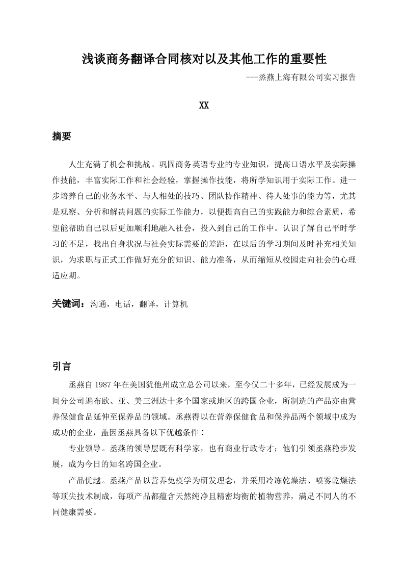 浅谈商务翻译合同核对以及其他工作的重要性--一烝燕上海有限公司实习报告XX摘要人生充满了机会和挑战。巩固商务英语专业的专业知识,提高口语水平及实际操作技能,丰富实际工作和社会经验,掌握操作技能,将所学知识用于实际工作。进一步培养自己的业务水平、与人相处的技巧、团队协作精神、待人处事的能力等,尤其是观察、分析和解决问题的实际工作能力,以便提高自己的实践能力和综合素质,希望能帮助自己以后更加顺利地融入社会,投入到自己的工作中。认识了解自己平时学习的不足,找出自身状况与社会实际需要的差距,在以后的学习期间及时补充相关知识,为求职与正式工作做好充分的知识、能力准备,从而缩短从校园走向社会的心理适应期。关键词:沟通,电话,翻译,计算机引言丞燕自1987年在美国犹他州成立总公司以来,至今仅二十多年,已经发展成为一间分公司遍布欧、亚、美三洲达十多个国家或地区的跨国企业,所制造的产品亦由营养保健食品延伸至保养品的领域。丞燕得以在营养保健食品和保养品两个领域中成为成功的企业,盖因丞燕具备以下优越条件:专业领导。丞燕的领导层既有科学家,也有商业行政专才:他们引领丞燕稳步发展,成为今日的知名跨国企业。产品优越。丞燕产品以营养免疫学为研发理念,并采用冷冻乾燥法、喷雾乾燥法等顶尖技术制成,每项产品都蕴含天然纯净且精密均衡的植物营养,满足不同人的不同健康需要。严格监控。秉持「坚持完美」(Committed to Excellence)的信念,丞燕拥有一套健全的生产制度,从原料种植与采收、处理、浓缩、配方、检测以至包装等,每个环节均一丝不苟,确保产品优质、安全卫生且符合标准,令人用得安心并乐於重复消费。勇於开拓。自1987年美国总公司成立至今,丞燕已伸展至全球十多个国家或地区,包括亚太区的香港、新加坡、台湾、马来西亚、菲律宾、韩国、中国、泰国、印度,以至欧洲的英国、南斯拉夫等地。凭藉这股开拓精神,丞燕在十多年间便创造了辉煌的成绩,在将来亦会持续发展,一代一代延续下去。产品质优安全。跟其他成功的商品一样,丞燕产品以优质取胜。任何成功的产品行销事业,都建基於优良的产品。丞燕(上海)有限公司位于上海浦明路198号,坐落在上海财富广场最南端的七号楼。财富广场位于上海市浦东新区最繁华的陆家嘴金融贸易区内,由7栋独立式的现代化办公别墅楼组成,与东方明珠、金茂大厦相咫尺,紧邻滨江大道。丞燕上海工厂坐落于上海松江区新桥镇,工厂拥有全套的浓缩设备、全自动电脑控制设备等一系列全球最先进的生产设备。目前,大部分丞燕产品已陆续在上海工厂投入生产分装。岗位概况专业是商务英语的我抱着学习和锻炼的精神来到烝燕上海有限公司,经过两个月的实习,使我对工作,生活都有了一个全新的体验。以后就是社会上的一份子了,责任也将越来越重。我在公司主要从事的工作是从事网上电话联系客户、核对翻译的合同、写报表以及查报表等这些工作从事网上电话联系客户主要是通过网络和电话与客户进行沟通,向这些客户介绍我们公司的产品,同时还有客户对我们这工作的人员进行评论、投诉。核对翻译的合同,一句话就是要把书本的知识转变成为我们谋生的工具。这是一项需要耐心和精力的工作,虽然是核对,但是要也对其先自己进行翻译,谈后在加以核对。它是以商务方面的资料为依据,要求翻译者对其进行全面,准确,快速的翻译,语言要表达准确,意思清晰。由于商务英语笔译的翻译材料大部分都是非文学的,核对这些翻译合同中,对于客户资料、商业等专业性文件,要求就很严格,很苛刻,同时又必须符合“信,达,雅”的原则,难度相当的大,其中要用到大量的专业术语,范围不仅仅包括我们平时上课时所认识的,更多的需要我们通过各种可行的渠道去查阅,具有很强的专业性。写报表的主要是对每天的业务来往,以及有关销量统计数据之类的都需要使用OFFICE软件做表格形式的报表,而且在每天下班之前都要把今天做好的报表交给上级。查报表就是核对一下做的报表数据之类的是否都准确无误。正文虽然是作为一名商务英语毕业生,但是来到丞燕不仅使自己在自己的专业上有了实践机会,而且还使我对国际贸易的业务流程及操作有了一定的了解和感触。起初,来到这我什么都不会,加上心里又没有底,也不自信,几乎无从下手,总是害怕自己做不好,更怕被公司给炒鱿鱼。从事网上电话联系客户的工作中自己心里没有底气,说话都扭扭捏捏,没有经验。并且遇到了很多我自己难以克服和解决的问题。例如自己总是很难以落下脸面去给客户沟通,一接通就会脸红,虽然客户并没有与我面对面,而且话语总是做不到那么专业。很多时候与客户联系和沟通时总是出现说完一句就不知道下一句要怎么回到,要怎么说了,很多次客户都挂断,觉得我是在浪费他们的时间,而且对我表现出很不信任。对于写报表工作,查报表。我虽然考到了上海计算机V℉P二级证书,但是由于不经常使用OF℉ICE软件,操作很不熟练,尤其是制作表格,有些基本操作都不会,更是无从下手。真不知道自己这四年来到底真正学到可以实践应用的是什么。更让我头疼的是核对翻译的合同,因为我的专业是商务英语,所以说核对翻译合同应该是我的强项,应该做的很顺手才可以