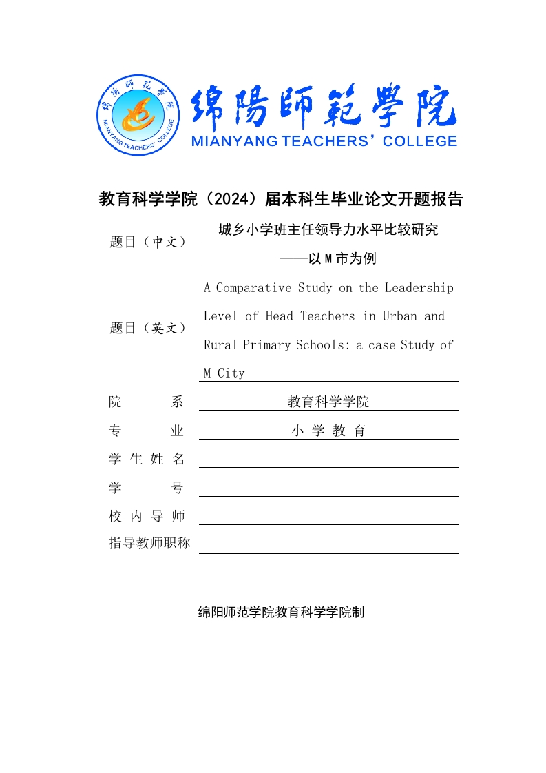 COLMIANYANG TEACHERS'COLLEGE教育科学学院(2024)届本科生毕业论文开题报告城乡小学班主任领导力水平比较研究题目(中文)一以M市为例A Comparative Study on the LeadershipLevel of Head Teachers in Urban and题目(英文)Rural Primary Schools:a case Study ofM City院系教育科学学院专业小学教育学生姓名学号校内导师指导教师职称绵阳师范学院教育科学学院制绵阳师范学院教育科学学院(2024)届本科生毕业论文开题报告教育科学学院(2024)届本科生毕业论文开题报告题目:城乡小学班主任领导力水平比较研究一以M市为例指导教师:职学生姓名:学号:一、选题缘由(一)国家教育政策的倡导近年来,随着我国教育体制改革的发展进步,国家对小学教育的质量要求更加严格。以德育人为根本任务,加强教师队伍的基础作用,发展素质教育,培养德智体美全面发展的社会主义建设者和接班人。《国家中长期教育改革和发展规划纲要》(2010-2020年)以及《中小学班主任工作规定》等文件出台体现了国家强调国民教育中班主任的重要性。现在我国发展的新时代已经到来,一些传统的,相对老旧的班主任的班级管理方式已不再适用于现在。因此,小学班主任不仅要学习简单的学科知识和教学方法,更要提高自己的班级管理能力。且班主任角色具有多样性,在大教育环境中,不仅要求班主任老师可以教学生学习,带动学生的全面发展,还必须提高自己的管理领导能力。但仍有不少学校把管理重点放在班主任的教学能力上,对班主任在其他方面的能力,特别是领导能力的提高还不够关心。(二)农村教育事业发展的需要我国改革开放以来,基础教育不断发展进步,带动了我国教育领域的巨大发展。但是,也是随着教育进步,在教育领域内最突出问题城乡教育发展不平衡也开始显露出来,特别是在义务教育阶段中的小学教育里发展不平衡。推进城乡融合发展,促进义务教育均衡发展迫在眉睫,向农村义务教育倾斜,推动教育资源的合理配置,缩小教育差距。(三)教育教学实践的客观诉求2绵阳师范学院教育科学学院(2024)届本科生毕业论文开题报告身为一名公费师范生,毕业后就需要回到自己户籍所在地进行一线的教育教学工作,可能我们是一线乡村新手老师,也有可能是一线乡村新手班主任。本研究主要调查城乡小学班主任领导力现状,丰富班主任领导力学习培养的知识储备,有利于自身在教育教学过程中的提升。二、概念界定(一)班主任《辞海》中对于对班主任的定义为:“在学校里,对一个班级的学生思想,学习,卫生,生活负总责的老师。一个班级的组织者,领导者与教育者同时又是班级内所有任课教师在教学,教育工作上的协调者”。①教育部颁布的《中小学班主任工作规定》将班主任定义为:“它是对中小学学生进行日常思想道德教育与管理的主要执行者,同时也是引导中小学生健康发展的领航者,班主任应努力做到中小学生生活中的良师”。以上列不同文件材料对班主任的定义,本研究将班主任定义为:班主任是全面领导负责班级各种事物的专职教师,对内对外分别处理好班级秩序和学生身心健康、教授学生学习知识加强思想品德的建设,与学校、科任老师、家长三方建立联系,及时沟通交流,是对班级内外兼顾的领导者。三、研究目的与意义四、文献综述五、研究思路与研究方法六、主要研究内容七、研究计划八、主要参考文献①夏征农.辞海:1999年缩印本(音序)[门.上海:上海辞书出版社,2002:86.3