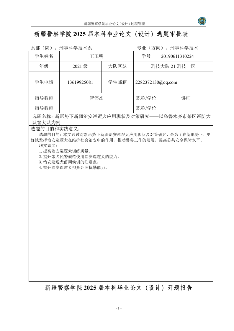 新疆警察学院毕业论文(设计)过程管理新疆警察学院2025届本科毕业论文(设计)选题审批表系部(院):刑事科学技术系专业(方向):刑事科学技术学生姓名王玉明学号20190611310224年级2021级大队区队刑技大队21刑技一区学生电话13619925081学生邮箱2282372130@qq.com指导教师智伟杰职称/学位讲师指导教师职称/学位选题名称:新形势下新疆治安巡逻犬应用现状及对策研究一一以乌鲁木齐市某区巡防大队警犬队为例选题的目的和实践意义:选题的目的:本文通过对新形势下新疆治安巡逻犬应用现状及对策研究,是为了在新形势下,更好地发挥治安巡逻犬在维护社会治安中的作用,推动警务工作的发展,提高公共安全保障水平。现实意义:1.提高治安巡逻犬训练质量。2.提升带犬民警规范使用治安巡逻犬的能力。3.治安巡逻犬前期幼训的注意点。4.提升治安巡逻犬担负处突执勤能力。新疆警察学院2025届本科毕业论文(设计)开题报告新疆警察学院毕业论文(设计)过程管理系部(院):刑事科学技术系专业(方向):刑事科学技术新形势下新疆治安巡逻犬应用现状及对策研究一一以乌鲁木齐市论文(设计)题目某区巡防大队警犬队为例学生姓名王玉明学号20190611310224指导教师智伟杰职称/学位讲师指导教师职称/学位一、研究目的(选题的背景和意义)首行缩进两字符,宋体五号,行间距固定值14磅在当前社会治安环境下,治安巡逻犬作为一种重要的辅助手段,在维护社会秩序、预防和打击违法犯罪活动方面发挥着不可或缺的作用。研究背景:1.社会治安形势复杂多样:随着城市化进程的加快和社会经济的快速发展,各类社会矛盾和犯罪形式呈现出多样化、复杂化的趋势。治安巡逻犬的应用有助于提高治安管理效率。2.公安全新战略需求:新时代公安工作提出了“四句话十六字”总要求,治安巡逻犬作为重要辅助力量,其应用与研究符合新时代公安工作的战略方向。3.科技强警战略的实施:随着科技的进步,治安巡逻犬作为高科技手段的一部分,其研发和管理模式需要与时俱进。研究目的:搞清楚治安巡逻犬现状,发现存在的问题,并提出解决的对策。研究意义:通过分析治安巡逻犬现状,解决存在的问题,从而提升治安巡逻犬整体的战斗力。新疆警察学院毕业论文(设计)过程管理研究的基本内容和拟解决的基本问题首行缩进两字符,宋体五号,行间保障距固定值14磅基本内容1.治安巡逻犬的现状分析巡逻犬的种类、训练水平以及配备情况。人员训练和使用治安巡逻犬的能力,以及日常执勤的情况。2.存在的问题民警训犬的素质不达标,平时忙于执勤,没有时间训犬。社会公众对巡逻犬的认知和接受程度。民警训犬的能力不达标,犬训练素质不达标等。在巡逻犬使用过程中,领导对警犬的恶性循环的不信任,导致不敢用犬问题。3.国内外经验借鉴他国在治安巡逻犬使用方面的成功案例与经验教训。适用于我国的巡逻犬管理与应用模式。4.未来发展方向如何加强巡逻犬的培训与选拔,提高其专业化水平。结合科技手段,增强巡逻犬的工作效率与精准度。拟解决的基本问题1.针对民警训犬的素质不达标,没有时间训犬等原因,制定更为科学的培训方案,提高治安巡逻犬训练质量。2.提升带犬民警规范使用治安巡逻犬的能力,从而提升治安巡逻犬整体的战斗力。3.归纳总结治安巡逻犬前期幼训需要注意的点,从一开始提升治安巡逻犬的素质。4.提升治安巡逻犬的素质,从而提升治安巡逻犬担负处突执勤能力。5.应对巡逻犬使用过程中可能出现的伦理与安全问题,设立相应的应急处置机制,确保巡逻犬的合理使用,不影向公众安全
