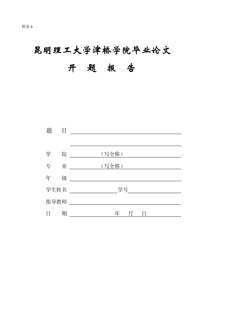 附录4昆明理工大学津桥学院毕业论文开题报告题学院(写全称)专业(写全称)年级学生姓名学号指导教师日期年月日课题研究目的、意义,该课题在国内外的研究现状及发展趋势:(填写内容格式:宋体五号,黑色字体,不加粗,单倍行距)课题主要内容、研究方案及预期目标:(填写内容格式:宋体五号,黑色字体,不加粗,单倍行距)课题进度计划(填写内容格式:宋体五号,黑色字体,不加粗,单倍行距)完成课题所需条件及落实措施:(填写内容格式:宋体五号,黑色字体,不加粗,单倍行距)主要参考文献、资料:(按照论文参考文献格式要求填写)(填写内容格式:宋体五号,黑色字体,不加粗,单倍行距)指导教师意见:指导教师(签字):年月日二级学院毕业设计(论文)工作领导小组意见:组长(签字):年月日