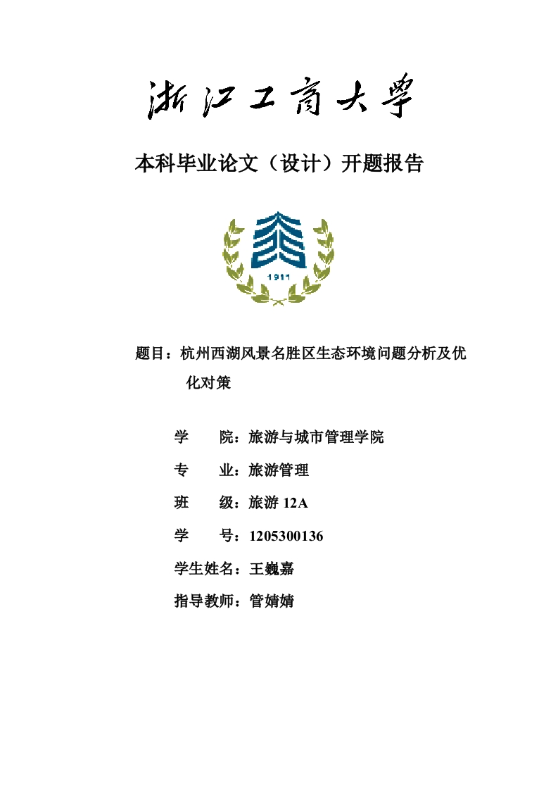 本科毕业论文(设计)开题报告题目:杭州西湖风景名胜区生态环境问题分析及优化对策学院:旅游与城市管理学院专旅游管理班级:旅游12A学号:1205300136学生姓名:王巍嘉指导教师:管婧婧毕业论文:开题报告ZHEJIANG GONGSHANG UNIVERSITY学生姓名:二O一四年六月毕业论文(设计)题目:杭州西湖风景名胜区生态环境问题分析及优化对策毕业论文(设计)研究的意义:改革开放以来我国的旅游业发展迅速,国内旅游发展尤为明显,且覆盖面广。2000年以来我国国内旅游人数年平均增长率在15%以上,旅游收入每年的增幅也能达到15%-20%,特别是“五一”“十一”黄金周。伴随着市场经济的深入发展,旅游人数在未来必然将继续增长,相应也会维持高速增长的局面。在旅游业的快速发展之下,也带动了众多周边产业的发展。在旅游业拉动当地经济发展的同时,也给当地人民和政府带来了各种各样的环境生态问题。这使得旅游生态安全渐渐成为了旅游业发展的关键因素。在旅游业的发展之下,许多景区都面临着生态安全的问题。以杭州西湖景区为例,对西湖景区存在的生态环境问题进行归纳分析。针对各个问题提出解决对策。如何把经济效益、社会效益与生态环境有机结合起来,开展生态旅游,是目前旅游景区发展所面临的重要问题。(一)、我国湖泊旅游资源概况我国的湖泊景区旅游资源十分丰富。湖泊景区水天一色,视野开阔,妩媚动人,给旅游者以心旷神怡之感。整个湖泊景区山清水秀,绿水环绕,湖光波影,岸边垂柳,风景更加绚丽多姿,生机盎然。湖泊通过其形、影、声、色、奇的变化多样性展示着特有的美感,吸引着游人前往观赏探索奥秘。同时,湖泊还可以开展垂钓、乘船、游泳、品尝水鲜等多种水上活动。湖泊旅游资源吸引着国内外众多旅游者,很多湖泊景区的旅游业都得到了迅速发展。我国现有国家重点风景名胜区中以湖泊为主体的很多,如湖南省的洞庭湖、黑龙江省的镜泊湖、吉林省的松花湖和五大连池、新疆省的天山天池、江苏省的瘦西湖和太湖、浙江省的杭州西湖和千岛湖、福建省的泰宁金湖、青海省的青海湖、湖北省的武汉东湖、贵州省的红枫湖、广东省的星湖、云南省的滇池和洱海等。截止到2006年为止,我国共有26个湖泊景区被纳入国家重点风景名胜区,12个湖泊景区被纳入国际重要湿地名录,16个湖泊景区被纳入国家级自然保护区。(二)、湖泊类旅游景区的生态研究现状1、水体污染日益严重,富营养化趋势明显我们有很多湖泊景区的水体都受到了严重污染。据统计,在我国28个国控重点湖(库)中,满足IⅡ类水质的2个,占7.1%:I类的6个,占21.4%:V类的4个,占14.3%:V类的5个,占17.9%:劣V类的11个,占39.3%。主要污染指标毕业论文:开趣报告ZHEJIANG GONGSHANG UNIVERSITY学生姓名:为总氮和总磷营养状态指数大于50小于60时,湖泊水质属于轻度富营养化:营养状态大于60小于70时,湖泊水质属于中度富营养化:营养状态大于70时,湖泊水质属于重度富营养。在监测的26个湖(库)中,重度富营养的2个,占7.7%:中度富营养的3个,占11.5%:轻度富营养的9个,占34.6%。2、湖泊面积菱缩及水土流失严重据研究统计表明,全国大于10平方公里的天然湖泊已经从《中国湖泊志》统计的656个减少到目前的581个,总面积从85256.94平方公里缩小到目前的68671。58平方公里。中国的湖泊在众多压力胁迫之下一直呈步步退让的萎缩态势。甚至一些曾经碧波浩荡的大湖及其承载的繁荣和文明,几乎是在“转瞬间”就灰飞烟灭,比如罗布泊。罗布泊曾是一个浩瀚大湖,最大时湖泊面积达5200平方公里,1931年测得面积为1900平方公里,1962年航测仍有660平方公里,1972年已完全干涸,成为广表的干盐滩,寸草不生,人迹罕至。3、建设泛滥,破坏景区原始景观当下湖泊景区建设泛滥,各种度假村、疗养院层出不穷,很多建筑不能与周围山水很好的融合,严重破坏了景区的原始景观。这些设施多数是单位各自为政,普遍缺乏科学规范的选址、设计和施工,造成建筑与周边环境极不和谐,严重破坏了湖畔景色的美学价值和景观生态格局。4、生境遭到破坏,生物多样性锐减我国现有湖泊景区的生物多样性都不同程度的遭到了破坏,生物多样性骤减。造成这种现象的原因很多,主要包括湖泊的菱缩或消失、污染、不合理开发及游客行为等等。二、研究意义:杭州西湖是世界文化遗产,江南三大名湖之一,首批国家重点风景名胜区,首批全国文明风景旅游区示范点,中国十大名胜古迹、中国主要的观赏性淡水湖泊之一,在中国的历史文化和风景名胜中占有重要地位。经过几十年的发展,杭州西湖风景名胜区己经形成一个稳定的旅游市场,然而景区的蓬勃发展对景区的生态环境产生了巨大的冲击,影响范围和强度也在不断加大,生态退化、环境污染等生态环境问题日益凸显。因此,本文在现场调研和大量资料收集分析的基础上,明晰景区生态环境存在的主要问题,通过生态敏感性分析揭示景区生态环境地域分异规律,为杭州西湖风景名胜区资源开发与生态保护指明方向,对进一步制定预防和治理生态环境问题对策提供借鉴,同时也对杭州西湖风景名胜区可持续发展乃至整个国民经济的发展都具有重要的战略意义。1、为杭州市乃至整个浙江湖泊旅游的环境问题预防治理实践发展提供理论支撑。湖泊旅游的实践发展离不开理论研究的支持,科学化的理论指导才能更好服