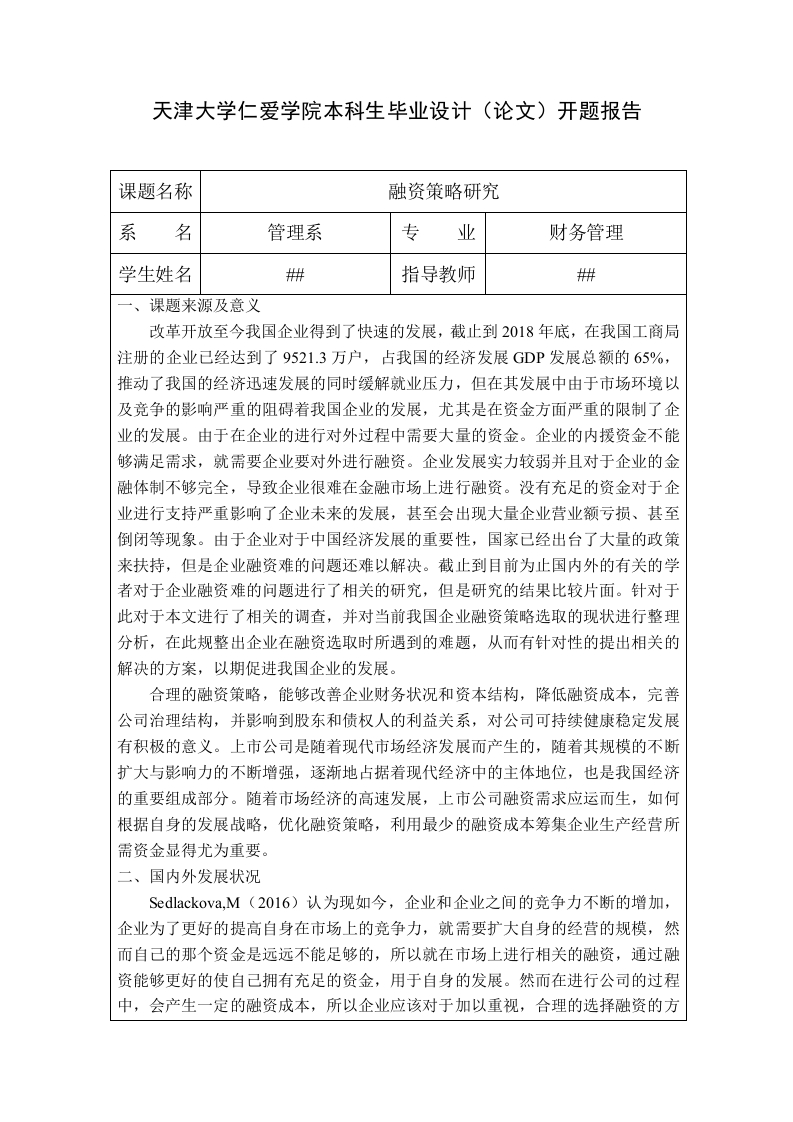 天津大学仁爱学院本科生毕业设计(论文)开题报告课题名称融资策略研究系名管理系专业财务管理学生姓名指导教师课题来源及意义改革开放至今我国企业得到了快速的发展,截止到2018年底,在我国工商局注册的企业已经达到了9521.3万户,占我国的经济发展GDP发展总额的65%,推动了我国的经济迅速发展的同时缓解就业压力,但在其发展中由于市场环境以及竞争的影响严重的阻碍着我国企业的发展,尤其是在资金方面严重的限制了企业的发展。由于在企业的进行对外过程中需要大量的资金。企业的内援资金不能够满足需求,就需要企业要对外进行融资。企业发展实力较弱并且对于企业的金融体制不够完全,导致企业很难在金融市场上进行融资。没有充足的资金对于企业进行支持严重影响了企业未来的发展,甚至会出现大量企业营业额亏损、甚至倒闭等现象。由于企业对于中国经济发展的重要性,国家已经出台了大量的政策来扶持,但是企业融资难的问题还难以解决。截止到目前为止国内外的有关的学者对于企业融资难的问题进行了相关的研究,但是研究的结果比较片面。针对于此对于本文进行了相关的调查,并对当前我国企业融资策略选取的现状进行整理分析,在此规整出企业在融资选取时所遇到的难题,从而有针对性的提出相关的解决的方案,以期促进我国企业的发展。合理的融资策略,能够改善企业财务状况和资本结构,降低融资成本,完善公司治理结构,并影响到股东和债权人的利益关系,对公司可持续健康稳定发展有积极的意义。上市公司是随着现代市场经济发展而产生的,随着其规模的不断扩大与影响力的不断增强,逐渐地占据着现代经济中的主体地位,也是我国经济的重要组成部分。随着市场经济的高速发展,上市公司融资需求应运而生,如何根据自身的发展战略,优化融资策略,利用最少的融资成本筹集企业生产经营所需资金显得尤为重要。二、国内外发展状况Sedlackova,M(2016)认为现如今,企业和企业之间的竞争力不断的增加,企业为了更好的提高自身在市场上的竞争力,就需要扩大自身的经营的规模,然而自己的那个资金是远远不能足够的,所以就在市场上进行相关的融资,通过融资能够更好的使自己拥有充足的资金,用于自身的发展。然而在进行公司的过程中,会产生一定的融资成本,所以企业应该对于加以重视,合理的选择融资的方式,能够降低企业的融资成本,更好的促进企业长久的发展。Mathieu Chatelain(2016)认为融资风险是在融资过程中产生的,是指公司在筹集资金过程中,可能遇到的因筹资引发的由收益变动产生的不利影响,主要原因是受财务风险和经营风险的双重影响。即公司在融资活动中的具体表现。其概念可以从两方面来说,一方面,从广义上看,融资主要是在金融市场上获得一定的资金,用于企业进行发展所需要的,所以合理的选择融资的方式是至关重要的,这样能够降低企业风险发生的概率,更好的促进企业长远的发展。另一方面,从狭义上看,体验根据自身的经营状况,合理的在金融市场上融资,这样有助于企业快速的占领市场,提高自身在市场上的竞争力,保证公司能够正常的经营以及生产,提高自身的盈利能力,所以融资对于企业来说是至关重要的。Sopitsuda Tongsopit(2016)认为融资风险存在时间性。时间也是引发融资风险的一个重要因素。决策者可以根据已经发生的事件进行分析,准确无误的规避风险。但是,在分析风险过程中,不仅要对过去的时件进行分析,也要对未来的事件加以预测,未来的事件存在太多不稳定因素,决策者有时也会受能力与知识方面的限制难以准确的识别信息。公司得不到准确有效的信息,就容易决策失误,就会产生风险,造成公司损失。因此,融资风险具有时间性,对未来事件的预测失误也会引发一系列风险出现。李浠(2017)认为:高新技术企业在进行融资时间接渠道分别有商业银行、政策性银行及其他非经营机构存款,其中商业银行为高新技术企业在间接融资时的主要渠道,但商业银行提供给我国高新技术企业的贷款项目并不是很多。由于高新技术企业信用体系差、贷款体量小、贷款风险大,很难从银行获得较大的贷款额度,现有的间接融资渠道并不顺畅。刘乙镟(2017)认为:企业筹资是为企业提供的筹资方式,企业可通过筹资的方式来获得当前企业需要的现金,经营者须在项目开始之前筹集到资金,而不能等到项目已经终止再开始筹集资金,这样的筹资方式是通过贷款来进行投资,或是通过其他的负债来进行筹资。在整个建设过程中都资金都依赖于负债公司,这样既可以保证公司现金的流通也可以降低偿还的风险。马朴坤(2018)认为:融资问题影响了中国高新技术企业的发展,影响了高新技术企业的发展效率。建议以中小型高新技术企业为核心建立二板市场,积极开括场外交易市场,完善国内产权交易市场,发展风险投资,完善证券市场。借助证券市场促进高新技术企业的长期发展。刘佳明(2018)认为:分析了高新技术企业的融资难的根本原因,主要体现在政策力度不够强,现阶段的融资结构不合理,风险资本市场的发展不规范,金融机构尚存在融资偏好等问题并据此提出改善高新技术企业融资问题的对策。任军(2018)认为:对于企业来说是至关重要的,能够使企业迅速的发展,提高自身在市场上的竞争力,由于融资的渠道不同,所以企