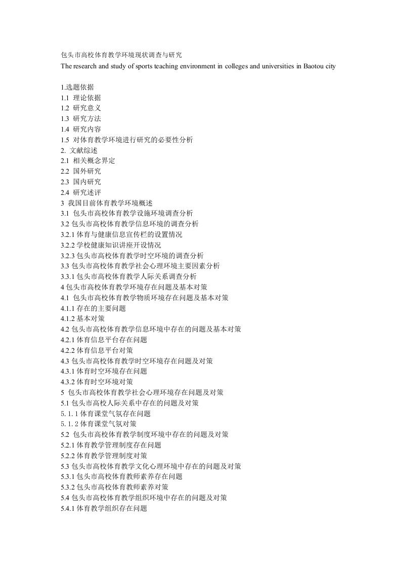 包头市高校体育教学环境现状调查与研究The research and study of sports teaching environment in colleges and universities in Baotou city1.选题依据1.1理论依据1.2研究意义13研究方法1.4研究内容1.5对体育教学环境进行研究的必要性分析2.文献综述2.1相关概念界定2.2国外研究2.3国内研究2.4研究述评3我国目前体育教学环境概述3.1包头市高校体育教学设施环境调查分析32包头市高校体育教学信息环境的调查分析3.2.1体育与健康信息宣传栏的设置情况3.2.2学校健康知识讲座开设情况3.2.3包头市高校体育教学时空环境的调查分析3.3包头市高校体育教学社会心理环境主要因素分析3.3.1包头市高校体育教学人际关系调查分析4包头市高校体育教学环境存在问题及基本对策4.1包头市高校体育教学物质环境存在问题及基本对策4.1.1存在的主要问题4.1.2基本对策4.2包头市高校体育教学信息环境中存在的问题及基本对策4.2.1体育信息平台存在问题4.2.2体育信息平台对策4.3包头市高校体育教学时空环境存在问题及对策4.3.1体育时空环境存在问题4.3.2体育时空环境对策5包头市高校体育教学社会心理环境存在问题及对策5.1包头市高校人际关系中存在的问题及对策5.1.1体育课堂气氛存在问题5.1.2体育课堂气氛对策5.2包头市高校体育教学制度环境中存在的问题及对策5.2.1体育教学管理制度存在问题5.2.2体育教学管理制度对策5.3包头市高校体育教学文化心理环境中存在的问题及对策5.3.1包头市高校体育教师素养存在问题5.3.2包头市高校体育教师素养对策5.4包头市高校体育教学组织环境中存在的问题及对策5.4.1体育教学组织存在问题5.4.2体育教学组织对策6结论与建议6.1结论6.2建议7.预期达到的目标8.对完成本课题现有条件的分析9.拟采用的研究方法和手段10.经费预算11.主要参考文献1选题依据1.1理论依据在世界科学技术和经济高速发展的当今时代,各国都把教育发展放在了重要的位置。俄国的化学家门捷列夫说过:“教育是人类最崇高、最神圣的事业,上帝也要低下至尊的头,向她致敬。”改革开放30年来,我国的教育事业取得了突破性的发展,教育改革亦不断有序推进,胡锦涛提出的教育应面向世界、面向现代化、面向未来的教育精神推动了学校素质教育的发展。2013年在北京召开的全国教育工作会议上,习近平在讲话中指出:“各级各类教育都要把全面推进素质教育,作为教育工作的战略重点。”在近期召开的人大代表大会上,对教育提出了更高的要求:“全民族的思想道德素质、科学文化素质和健康素质明显提高,形成比较完善的国民教育体系。”学校体育是教育的重要组成部分,它在学生素质教育的培养中起着独特作用。学校体育在经过体质教育、快乐体育、技能教育、全面教育等多元化指导思想的过程开始转型为“健康第一”和“终身体育”的两元指导思想。随着科学技术的日益发展,许多部门先后采用了现代化的装备,这就使得人们对体育活动的需要就更为迫切,因为科学技术越发达,人们的体力劳动就越少,户外活动也就越少,也就越需要体育活动来促进健康水平的提高。这样也就给学校体育提出了新的迫切要求:如何教给学生科学锻炼身体的方法并使之形成习惯,如何促使学生更有效地参加各种体育锻炼,如何开展各具特点的高水平实用的学校体育活动,这是学校体育对未来社会的重要贡献,因为今天的学生就是明天的劳动者。1.2现实依据高校体育教学是促进大学生身心健康发展的重要平台之一:是校园文化建设的重要组成部分:是和谐校园建立的必要条件。高校体育教学环境是提高高校体育教学效果的有力保障。高校体育教学环境复杂多样,每一个因素都会对体育教学产生影响,不新发现和研究体育教学环境存在的不足,完善体育教学环境,更好的促进高校体育教学发展,不仅关系到大学生发展成长,更关系到高校教育的发展。随着我国经济的快速发展,高校物质和文化环境己发生了翻天覆地的变化。高校体育教学也要适应高校体育环境的变化,唯有如此,才能使体育教学达到最优化。教学环境的变化,直接或间接地影响到教学的诸要素,因此在高校体育教学改革中,必须认清高校体育所处的环境,才能深入地进行改革。体育素质教育、终身体育思想的培养以及大学生体育发展的特点,构成了高校体育的大环境,对在学校教育中处于重要地位的体育教学,无论是目标与方法,还是内容与形式,都有着深刻的影响。因此,高校体育教学与改革,必须遵循新形势下高校体育环境的变化当前,我国的学校体育教学系统中,普遍存在教学环境较差、没有很好的利用现有教学资源达到其整合功效、没有达到教学环境子系统要素的最优化组合从而发挥系统最大能量、教学系统不完善,教学环境布局不合理等问题,影响和制约了教学效果。为了适应我国体育教学新课程改革、塑造身心和谐发展和健康的人,如何去创造和优化体育教学环境,如何对体育环境进行合理评价并建立评价体系,将成为现代体育教学理论研究的重要课题,也是开展体育教学活动中必须研究的课题。1.3研究意义13.1理论意义通过本研究,从体育教学环境的角度去探讨包头市高校体育教学状况,可以从另一个视角去发现包头市高校体育教学存在的实际问题,以及影响体育教学质量的环境因素状况,从而从教学环境的角度寻找出包头市高校体育教学上