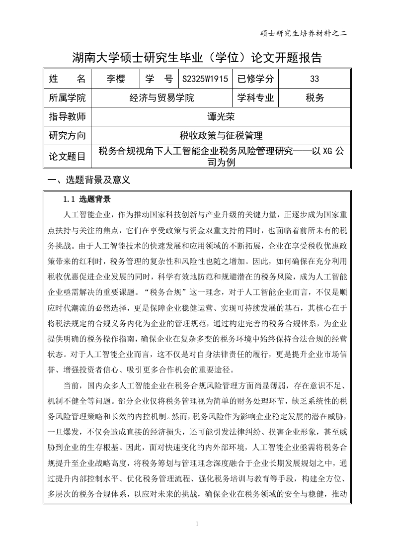 硕士研究生培养材料之二湖南大学硕士研究生毕业(学位)论文开题报告姓名李樱学号S2325W1915已修学分33所属学院经济与贸易学院学科专业税务指导教师谭光荣研究方向税收政策与征税管理论文题目税务合规视角下人工智能企业税务风险管理研究一以G公司为例选题背景及意义1.1选题背景人工智能企业,作为推动国家科技创新与产业升级的关键力量,正逐步成为国家重点扶持与关注的焦点,它们在享受政策与资金双重支持的同时,也面临着前所未有的税务挑战。由于人工智能技术的快速发展和应用领域的不断拓展,企业在享受税收优惠政策带来的红利时,税务管理的复杂性和风险性也随之增加。因此,如何确保在充分利用税收优惠促进企业发展的同时,科学有效地防范和规避潜在的税务风险,成为人工智能企业亟需解决的重要课题。“税务合规”这一理念,对于人工智能企业而言,不仅是顺应时代潮流的必然选择,更是保障企业稳健运营、实现可持续发展的基石,其核心在于将税法规定的合规义务内化为企业的管理规范,通过构建完善的税务合规体系,为企业提供明确的税务操作指南,确保企业在复杂多变的税务环境中始终保持合法合规的经营状态。对于人工智能企业而言,这不仅是对自身法律责任的履行,更是提升企业市场信誉、增强投资者信心、吸引更多合作机会的重要途径。当前,国内众多人工智能企业在税务合规风险管理方面尚显薄弱,存在意识不足、机制不健全等问题。部分企业仅将税务管理视为简单的财务处理环节,缺乏系统性的税务风险管理策略和长效的内控机制。然而,税务风险作为影响企业稳定发展的潜在威胁,一旦爆发,不仅会造成直接的经济损失,还可能引发法律纠纷、损害企业形象,甚至威胁到企业的生存根基。因此,面对快速变化的内外部环境,人工智能企业亟需将税务合规提升至企业战略高度,将税务筹划与管理理念深度融合于企业长期发展规划之中,通过提升内部控制水平、优化税务管理流程、强化税务培训与教育等手段,构建全方位、多层次的税务合规体系,以应对未来的挑战,确保企业在税务领域的安全与稳健,推动人工智能产业的持续健康发展。XG企业作为我国领先的高性能计算和智能计算方案领域的领军企业,为中国及全球用户提供创新、高效、可靠的IT产品、解决方案及服务。XG企业在踏上高速发展的列车轨道的同时,由于国内税收政策不断更新的环境以及其依赖国际供应链和市场的特点,XG企业在税务风险管理方面投入的力度无法跟得上企业发展和环境变化的脚步,暴露了其对税务风险管理的薄弱点。而当相关问题暴露时,XG企业事前未做出良好的防范措施,事后也无法及时给出正确的应对方法,造成了很多本可以避免的严重损失,给XG企业的高速发展带来了一丝阴霾,税务风险管理的相关问题已经暴露在XG企业管理者的面前,成为了该公司目前亟待解决的主要问题。因此,本文选取的XG人工智能企业作为研究对象。1.2选题意义(1)理论意义本研究结合实际案例,对XG人工智能企业的实际情况进行详细分析,研究XG人工智能企业在资格认定条件保持上的疏漏、研发费用加计扣除过程中出现的问题、领取政府补助时的收入确认和跨境税务合规问题等方面所面临的税务风险问题。研究不仅关注具体的风险指标,同时结合企业税务风险管理理论,提出了防范税务风险的建设性方案。相较于国内学者多关注税收筹划、政策及企业税务风险管理的单一角度,本研究侧重于纳税申报表分析和税务风险管理体系相结合,此类研究较为少见。因此,研究人工智能企业税务风险管理有助于发现新的管理思路和策略,为企业和政府提供指导和借鉴。总之,本研究在理论层面具有一定的创新性,为人工智能企业税务风险管理提供了新的视角和方法。(2)现实意义在管理实践方面,本文以XG人工智能企业为案例,重点关注在企业生产经营转型过程中所面临的特定税务风险。同时,针对人工智能企业在税务风险管理中所遇到的问题,分析已经及可能遇到的问题种类,进行归纳总结,并针对各个问题提出相应的解决措施,针对XG人工智能企业的情况提出合理的意见,如完善企业内部税务风险管理体系加强税务风险管理、建立税务信息沟通平台来强化企业内部的沟通等。这可以为其他人工智能企业提供宝贵的经验借鉴,使它们能够警惕并避免这类问题,进而更加关注向税务机关提交的纳税申报表间的逻辑关系。通过加强税务风险管理体系建设和信息沟通,可以有效提升XG人工智能企业的申报数据质量和整体税务风险管理水平,使得税务风险无法对企业造成严重的损害,改善了企业纳税管理的整体局面。同时,更好地帮助企业释放研发创新活力,为国家创新创造作出贡献。文献综述2.1关于企业税务合规研究关于企业税务合规,目前的学术研究相对较少,研究视角主要归纳为两类:第一种途径专注于具体行业,探讨公司在经营活动中面临的税务风险,进而提出针对性的税务规范化管理策略:第二种途径则着眼于跨国公司,探究税收政策变动对跨国交易税务遵从性的影响。(1)合规管理的必要性在全球化经济浪潮中,企业面临的税务环境日益复杂多变,税务合规管理作为确保企业稳健运营的基石,其重要性愈发凸显。面对不断完善的税收制度与日益严格的监管要求,构建健全的税务合