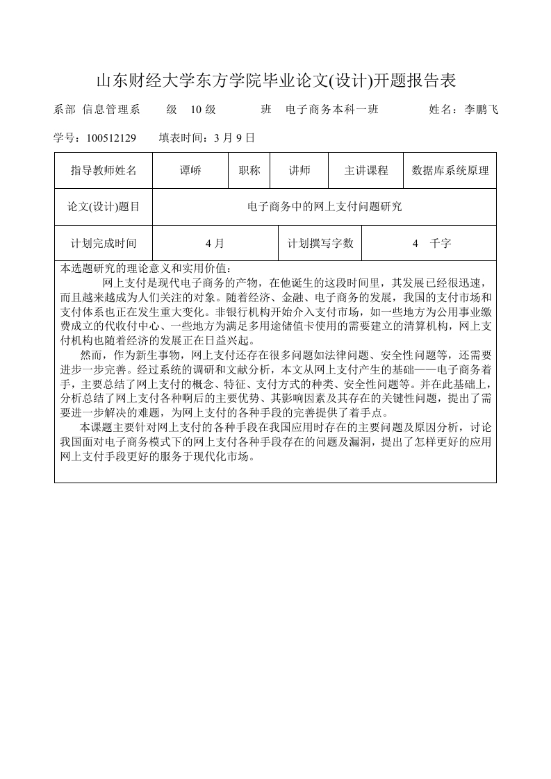 山东财经大学东方学院毕业论文(设计)开题报告表系部信息管理系级10级班电子商务本科一班姓名:李鹏飞学号:100512129填表时间:3月9日指导教师姓名谭峤职称讲师主讲课程数据库系统原理论文(设计)题目电子商务中的网上支付问题研究计划完成时间4月计划撰写字数4千字本选题研究的理论意义和实用价值:网上支付是现代电子商务的产物,在他诞生的这段时间里,其发展已经很迅速,而且越来越成为人们关注的对象。随着经济、金融、电子商务的发展,我国的支付市场和支付体系也正在发生重大变化。非银行机构开始介入支付市场,如一些地方为公用事业缴费成立的代收付中心、一些地方为满足多用途储值卡使用的需要建立的清算机构,网上支付机构也随着经济的发展正在日益兴起。然而,作为新生事物,网上支付还存在很多问题如法律问题、安全性问题等,还需要进步一步完善。经过系统的调研和文献分析,本文从网上支付产生的基础一一电子商务着手,主要总结了网上支付的概念、特征、支付方式的种类、安全性问题等。并在此基础上,分析总结了网上支付各种啊后的主要优势、其影响因素及其存在的关键性问题,提出了需要进一步解决的难题,为网上支付的各种手段的完善提供了着手点。本课题主要针对网上支付的各种手段在我国应用时存在的主要问题及原因分析,讨论我国面对电子商务模式下的网上支付各种手段存在的问题及漏洞,提出了怎样更好的应用网上支付手段更好的服务于现代化市场。本选题国内外研究现状:国外的状况:随着Internet的迅速发展,国外早在八十年代就开始了电子商务的研究与开发.现代密码技术的不断更新,使得电子商务,尤其是网上支付在安全算法和协议等方面己经十分成熟:网络通信技术的不断进步,更给电子商务和电子支付提供了坚实的物质基础。目前,国外网上支付系统己进入实用化阶段。然而国外的网上支付无序的发展存在一定金融安全隐患以及市场规范的问题等严重阻碍着网上支付的进一步发展及扩大。所以国外使用平安清算程序,对nternet的网上支付提供信息中介服务,针对银行卡主攻加密算法,使传统的银行卡支付信息通过Internet向商家传递,利用金融专用网络提供独立的支付授信,更先进的是采用智能卡技术,提供联机的银行卡支付国内状况:据CNNIC最新发布的《第25次中国互联网络发展状况统计报告》调查显示,商务交易类应用的用户规模增长最快,平均年增幅达到了68%。其中,网上支付用户年增幅80.9%.在所有应用中排名第一,2009年中国网络购物市场交易规模达到2500亿,2010年网络购物市场将迎来更大规模的发展。然而安全问题及个人隐私是我国网上支付面临的主要问题。各家商业银行、第三方支付公司、商户、安全认证机构等方面亟待破解的首要难题,是获取用户群体的信任,克服市场上盛行的“支付安全怀疑论”。围绕本选题已做哪些准备工作,计划再做的工作:1.通过借阅校图书,了解掌握与论文相关基本理论知识及研究的现状。2.通过期刊资源和网络数据库资源来收集历年的数据,及借鉴、引用有关学者的观点、研究成果等。3.通过电视、网络等媒介了解当前我国电子商务市场的动态、及国家一些相关的政策、法规的颁布实施。计划在哪些方面有所突破:1.在研究数据和例子上讲究科学性和更有说服力。2.从实现网上支付的基础-现行支付系统作一定的研究。3.从保证网上支付安全的措施上作出详细的介绍,引申到法律上的问题。4.从网上支付对商业银行的影响作出阐述。主要参考文献:[1]张媛.国家体育场固定通信服务建设项目的时间管理[D].北京邮电大学2010[2]牛淑静.3G时代企业无线营销模式研究[D].北京邮电大学2010[3]陈超.北京联通NCDMA工程项目的风险管理研究[D].北京邮电大学2010[4]祝明.水利卫星通信网改造项目范围管理研究[D].北京邮电大学2010[5]赵向阳.三网融合试点广电网络互动类业务规划探讨[D].北京邮电大学2010[6]赵贝尔.移动广告商业模式分析及建议[D].北京邮电大学2010[7]田静.中国移动数据业务社会渠道分销策略研究[D].北京邮电大学2011[8]宫润龙.数字图书馆行业营销策略研究[D].北京邮电大学2011[9]董贺伟.秦皇岛港口数字网络视频监控系统升级可行性研究[D].北京邮电大学2011[10]沈威.针对中小企业的远程T服务运营模式研究[D].北京邮电大学2011[11]张伟,焦萍,《网上支付发展问题研究》一一《商场现代化》2010年第三期指导教师意见:指导教师签名:年月日(填写不下可加附页)