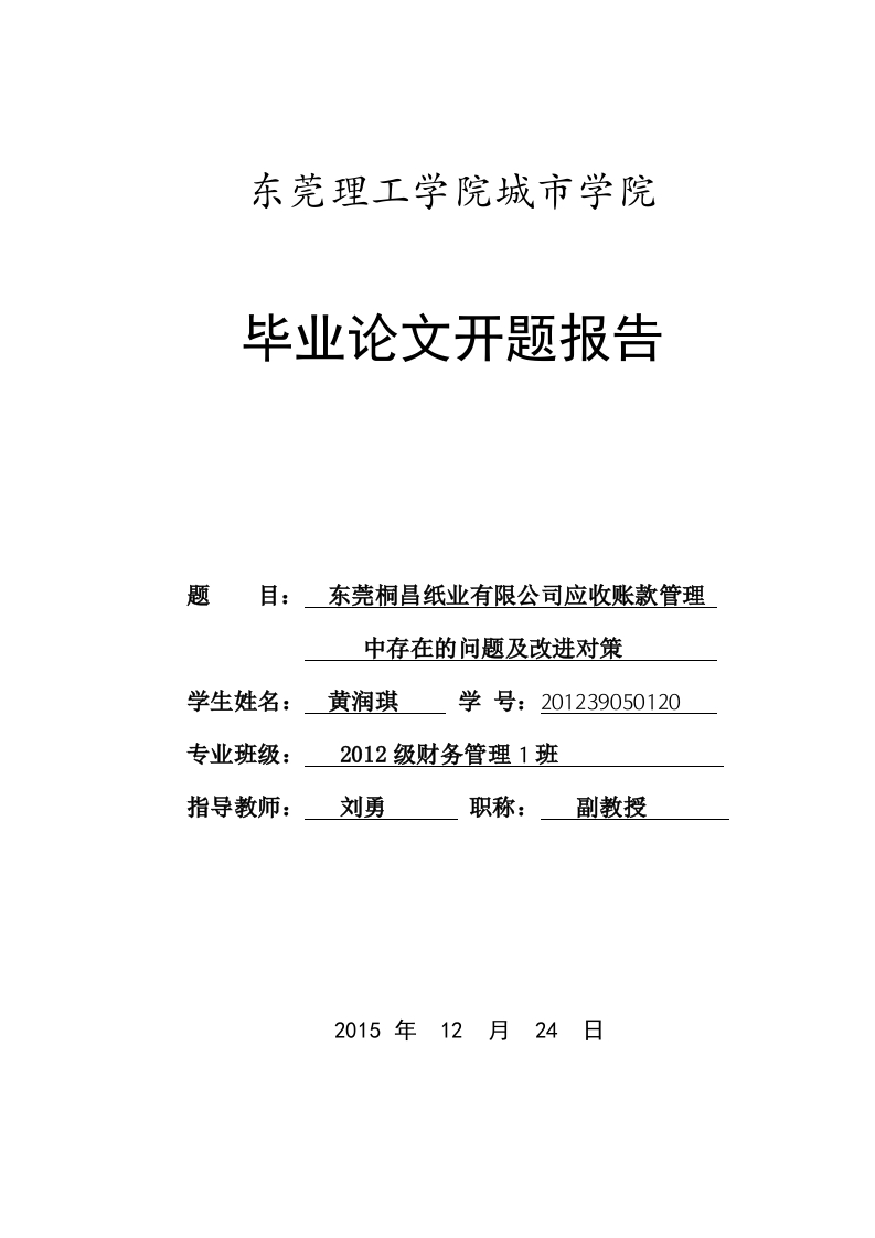 东莞理工学院城市学院毕业论文开题报告题目:东莞桐昌纸业有限公司应收账款管理中存在的问题及改进对策学生姓名:黄润琪学号:201239050120专业班级:2012级财务管理1班指导教师:刘勇职称:副教授2015年12月24日开题报告填写要求1.开题报告作为毕业设计(论文)委员会对学生答辩资格审查的依据材料之一。此报告应在指导教师指导下,由学生在毕业设计(论文)工作前期内完成,经指导教师签署意见审查后生效。2.开题报告内容必须用黑墨水笔工整书写,或按统一设计的电子文档标准格式打印(教务处网页),禁止打印在其它纸上后剪贴,完成后应及时交给指导教师签署意见。3.学生查阅资料的参考文献应在3篇及以上(不包括辞典、手册),开题报告的字数要在1000字以上。4.有关年月日等日期的填写,应当按照国标GB/T7408一94《数据元和交换格式、信息交换、日期和时间表示法》规定的要求,一律用阿拉伯数字书写。如“2006年7月25日”或“2006-07-25”。毕业论文开题报告1.本课题的研究意义随着市场经济的不断发展,市场的竞争越来越激烈,东莞中小企业的生存环境也变得越来越恶劣。企业不得不采用赊销的办法来提高销量,从而产生了应收账款。因此,应收账款在企业的资产中占有非常重要的位置,是决定企业是否可以进行资金循环的一个重要环节,影响到企业的存亡,可是东莞很多中小企业应收账款管理相对薄弱,导致企业在激烈的市场竞争中缺乏竞争力。企业应收账款管理是企业管理的重要组成部分,在提高企业的销量、提高企业经济效益中发挥着重要作用。所谓应收账款,是指企业在正常生产经营活动中,由于销售商品或提供劳务等,而应向购货或接受劳务单位收取的款项,主要包括企业出售商品、材料、提供劳务等应向有关债务人收取的价款及代购货方垫付的运杂费等,而应收账款管理就是企业在日常的经营管理活动中对应收账款进行管理。企业管理的好坏,直接影响到资金的回收以及资金的运作。因此,加强中小企业应收账款管理问题的研究,对促进中小企业稳定发展具有重要意义。本文以应收账款管理为主题,以东莞桐昌纸业有限公司为例,结合该企业发展的现状,探究其存在的问题以及产生的原因,并找出相关改进的对策。希望能够给企业带来参考价值。2.本课题的基本内容本文主要研究分析企业应收账款管理的背景及意义,找出东莞桐昌纸业有限公司应收账款管理中存在的问题进行分析,并结合该企业目前自身发展的实际情况,根据存在的问题找出产生问题的原因,针对问题提出改进对策,从而完善该企业的应收账款的管理,提高企业的经济效益。