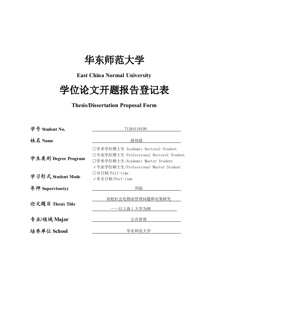 华东师范大学East China Normal University学位论文开题报告登记表Thesis/Dissertation Proposal Form学号Student No..71264110100姓名Name口学术学位博士生Academic Doctoral Student▣专业学位博士生Professional Doctoral Student学生类别Degree Program口学术学位硕士生/Academic Master Student√专业学位硕士生/Professional Master Student口全日制/Full-time学习形式Student Mode√非全日制/Part-time导师Supervisor(s)刘晶高校社会化物业管理问题和对策研究论文题目Thesis Title一一以上海L大学为例专业/领域Major公共管理培养单位School华东师范大学填写说明Instruction1、开题报告为A4大小,于左侧装订成册。各栏空格不够时,请自行加页。This form should be printed on A4 paper and bound up on the left.In case the spaceleft is not enough,please feel free to add extra pages.2、开题报告通过后,分别由研究生、导师、学院各存档一份After the dissertation proposal is accepted,three copies of this form should be filed,one for the student,one for the supervisor,and one for school.1、选题的研究意义及国内外研究现状综述,附参考文献。Significance of the research topic,overview of the current research status,and theworks cited.一、研究背景(一)现实需要批注iuxiao1]:这部分要列举一些高校物业管理存在的具高校作为相对独立且拥有一定自治权的社会组织,其物业管理体系与其他企体的现实问趣,以突出此项研究的必要性。也就是要对你目前提到的物业管理转型和政革的必要性进行说明,不能业或商业场所有着本质的区别。在高校的日常运营中,物业管理面临着一系列复只提及未来要转型成什么样,重要的是要说清楚为什么要杂的现实问题。一些高校虽然进行了后勤社会化改革,但其管理及监管体系不健转型,转型前是什么样子。这个才是真正的现实需要全:部分高校的老校区公共区域维护不善、设施设备老化严重、安全隐患频发:还有一些高校由于物业管理水平不高、物业从业人员专业化程度较低,校内环境经常处于一个比较松散的状态:此外,高校扩招使得服务教职工、学生的人数增多、服务的项目也增多。服务的对象大幅度增加的同时新建校区大量新设备的投入使用给物业管理带来了新的挑战。加上在校师生对物业管理需求不断提高、理解和配合度不足,也增加了物业管理的难度。这些问题不仅影响了校园整体环境与学生的学习生活质量,还可能对校园文化和学术氛围造成负面影响。在这样的背景下,高校物业管理亟需引入更加科学的管理方法,利用政府行业指导、信息技术等优化资源配置,提高学校与物业管理公司的管理效率;同时,加强与学生、教师等利益相关者的沟通协作,形成和谐共赢的管理生态,以专业的视角和高标准的服务满足日益增长的教育需求。以上海L大学为例,其2020年在引入社会专业物业管理公司后,物业管理模式也在不断转型,以便应对校园物业服务品质的不断提升。基于此,深入研究高校社会化物业管理存在的问题,特别是针对物业管理模式的转型过程中所面临的问题和矛盾,是促进高校社会化物业管理的健康发展的现实需要。(二)政策背景国务院在《关于进一步加快高等学校后勤社会化改革的意见》中指出,当前社会化、高校后勤管理、高校物业管理方面更具体的政策。这些具体的政策如何强调高校社会化物业管理的相关内容高等学校后勤服务模式落后、后勤社会化改革滞后、后勤负担沉重的状况,已经成为制约高等教育发展的“瓶颈”因素。原有计划经济体制下以福利为核心的福利型高校物业管理模式已经不再适应时代的要求,无法满足日益增长的高等教育1刘春燕,任广峰.高校多校区物业管理面临问趣及对策.中国市场,2022,09):95-96.D01:10.13939j.cmki.zgsc.2022.09.095.2国务院办公厅转发教育部等部门关于进一步加快高等学校后勒社会化改革意见的通知),中华人民共和国国务院公报,2000,07):5-8.