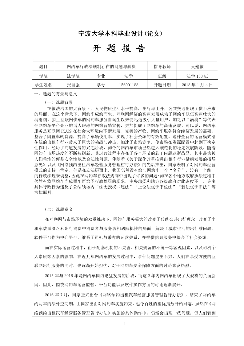 宁波大学本科毕业设计(论文)开题报告题目网约车行政法规制存在的问题与解决指导教师吴建依学院法学院专业法学班级法学153班学生姓名张自强学号156001188开题日期2018年1月4日一、选题的背景与意义(一)选题背景在依法治国的大背景下,人民物质生活水平提高,出行率上升,公共交通出现了供不应求的局面,在这个背景下,网约车应约而生。互联网经济的高速发展成为了网约车队伍高速壮大的润滑剂。搭上互联网快车的网约车服务自诞生以来便迅速吸引大量用户,加之以“滴滴”等代表性网约车平台企业的博人眼球的网络营销宣传,更加促成了网约车的高速发展。可以说,网约车服务是互联网PLUS在社会大环境内不断发展、完善的产物。网约车服务符合经济发展的需要,整合了闲置车辆资源,提高了车辆使用率,实现了社会资源的有效配置。这种全新的运营模式给传统的出租车行业带来了巨大的挑战与冲击,加速了市场竞争,使市场在资源配置中起到了决定性作用。经历了高速发展的兴起阶段,如今的网约车市场己然进入规范化的稳定发展阶段。随着网约车市场热度的不断被刷新,其运营过程中存在于各个环节的若干问题逐渐凸显,其中最为被人们关注的便是安全性以及合法性问题。伴随着《关于深化改革推进出租车行业健康发展的指导意见》以及《网络预约出租汽车经营服务管理暂行办法》的先后推出,国家表明了对网约车经营模式的支持与肯定,但是在立法层面上,我国仍然没有给与网约车一个“名分”,没有一个统一的行政法规来调整,因此在网约车行政法规制中出现了许多的问题:如在各个地方政府执法过程中仍然有将网约车当成黑车而给予行政处罚的现象,中央部委和地方各级政府对此态度不一,许多具体行政行为违反了公法领域内“法无授权即违法”“上位法优于下位法”“新法优于旧法”等法律原则。(二)选题意义在互联网与市场环境的双重推动下,网约车服务极大的改变了传统公共出行理念,改变了出租车数量匮乏和出行消费中消费者与服务者相遇随机性的局面,解决了城市生活的出行难问题。软件平台作为中介平台,维系了司机与乘客的运营关系,在提供信息服务中整合了社会姿源。而在实际运营过程中,由于配套机制的不完善、相关规范的不统一等客观因素,以及司机个人素质等因素的影响,在近几年网约车的发展过程中,事件问题层出不穷,人们在享受方便的互联网出行服务的同时,也逐渐开始担忧,对于网约车安全保障方面的讨论愈发热烈。2015年与2016年是网约车国内迅猛发展的阶段,而这2年内网约车出现了大规模的负面新闻。因此,围绕网约车运营监管、平台功能以及软件操作方面的讨论逐渐展开。2016年7月,国家正式出台《网络预约出租汽车经营服务管理暂行办法》,结束了网约车约两年的法外空间期,由国家出面对网约车实施约束,也令百姓的担忧指数开始回落。虽然在《网络预约出租汽车经营服务管理暂行办法》实施的具体操作中,仍然会出现一些问题,但人们看到了网约车未来规范化的发展趋势。随着网约车市场的不断发展,人们对其的关注度也明显提升,围绕其发展特点、盈利模式、竞争优势、运营规范、政府监管与监督、地方政府扶持、平台方利润获取、乘客出行安全保障等方面的研究不断涌现。查阅相关调查报告中可以看到,网约车的使用量越来越大,用户使用忠诚度也越来越高,新兴生活方式所衍生出的可被研究的范围很广,而目前相关学术资料的关注重点具有分散性,因此,对于网约车的发展现状以及现状实际问题的行政法规制的研究十分必要。这一议题的深入研究不仅利于理论资料填充,更能从实际操作角度为相关部门的完善策略提供建议与参考。二、研究的基本内容与拟解决的主要问题研究的基本内容(论文大纲):一、网约车及其相关概念界定与行政法规制的必要性分析(一)网约车经营服务的界定(二)网约车行政法规制的必要性1.市场缺陷需要行政法规制2.网约车自身风险需要行政法规制3.政府监管的优势体现二、我国网约车的行政法律规范现状及存在问题(一)我国网约车行政法律规范现状1.中央部委针对网约车的行政法律规范2.地方政府部门关于网约车的行政法规范性文件规制现状(二)我国网约车行政法律规范存在的问题1.中央与地方行政法规制不统一2.政府过度干预市场的自我调节3.行政法主体越权制定行政法规范4.法律适用过程中出现不当三、完善网约车行政法规制的建议(一)构建完善的的网约车行政法律规范体系1.制定新法2.修改现行法(二)规范资格审查并提高网约车准入条件(三)落实安全平台监管责任制(四)完善网约车保险制度2(五)规范行政处罚与行政强制行为四、结论与展望拟解决的主要问题:解决网约车的行政法规制中存在的错误认识,法律缺失,法律超位现象,改变现行行政法中关于网约车的监管方面的法律杂乱无章法无实据的局面,指出当下一些地方政府对网约车存在的错误认识,并为网约车的行政法规制提供合理的建议和对策。三、研究的方法与技术路线(一)研究方法1.文献研究法。通过对大量相关文献资料的收集、整理和分析,以系统和深入揭示网约车行政法规制存在较大问题的原因、主要的内容,并在此基础上总结出其对于理论和实践带来的各种影响。2.比较分析法。通过我国现行
