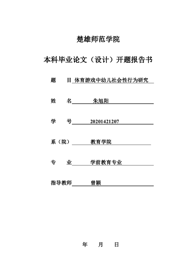 楚雄师范学院本科毕业论文(设计)开题报告书题目体育游戏中幼儿社会性行为研究姓名朱旭阳学号20201421207系(院)教育学院专业学前教育专业指导教师年月日体育游戏中幼儿社会性行为研究论文(设计)题目选题的动因与根据一、本课题的研究意义(一)理论价值理论上丰富了幼儿体育心理学和幼儿社会发展心理学研究的内容,研究可阐明幼儿体育游戏对幼儿社会性行为发展的价值,为幼儿亲社会行为的培养提供理论基础:可揭示幼儿亲社会行为出现频率与体育游戏内容之间的相关性,为亲社会行为的培养提供新视野:可改变幼儿教师对幼儿体育游戏的片面理解,为幼儿体育游戏的设计提供新思路,对建立幼儿体育教育理论具有重要的理论指导意义(二)实践意义实践作用上,可以为体育游戏促进幼儿亲社会行为发展的教学活动,提供操作性策略和实践指导。研究可发现幼儿体育游戏对幼儿社会性行为发展的价值,有利于幼儿教育工作者发现社会性行为的培养新方案:可以提高教师专业能力,帮助增强体育游戏的设计和组织能力:可为幼儿园培养幼儿亲社会行为提供可靠有效的路径、方法和经验支持。可引导幼儿建立起正确的亲社会交往观念,帮助其社会性行为的发展。二、综述国内外有关本课题的研究动态及见解(一)国外相关研究国内外学者对体育游戏中幼儿社会性行为研究较少,主要集中在幼儿亲社会行为的研究,主要从精神分析理论、认知发展理论、社会学理论和社会生物学理论入手,对于影响因素和控制手段的研究大都集中在以下几个方面:角色选择与幼儿亲社会行为的关系。幼儿的角色选择能力是影响亲社会行为的,一个很重要因素。Koh1berg和他的研究团队对美国孤儿院中幼儿的研究结果表明,幼儿角色采择能力发展迟缓的话,将会导致其亲社会行为的缺乏。Eisenberg(2004)、Underwood(1982)研究组的研究却得出了不同的结论,他们发现幼儿的角色采择和亲社会行为之间的关系是不一致的,有的时候是呈正相关,有的时候是呈负相关的:移情作用对幼儿亲社会行为的影响。多数心里学家认为幼儿的亲社会行为与移情有着非常紧密的关系,哲学家认为,亲社会行为,特别是利他行为,通常是被移情或同情所引发的。Batson(2003)假设同情与他人取向的动机密切相关,从而与他人取向的利他的帮助行为紧密相关。相反,他把个人忧伤看作减轻个体自身忧伤的自我中心的动机。因此,只有当减轻自身痛苦的最便捷方式是减轻他人痛苦时,才有可能激发亲社会行为。与其理论相一致,(Batson)和他的同事在实验室对成人的研究中发现,当人们易于逃离,与需要帮助的人接触时,同情比个人忧伤更可能与助人行为呈正相关。Eisenberg(1984)等人指出,当人们处于生理过分唤醒状态时,他们会体验到个人忧伤,而当他们处于适中的共鸣唤醒状态时,他们能体验到同情。同时,也有国外学者对幼儿社会性行进行了分类,Martin等人(1982)认为同伴互助能力的发展对于幼儿来说十分重要,同伴互助在婴幼儿时期就已经出现,婴幼儿听见同龄人的哭声,随后也会跟着他起哭泣。Vandal等人(1980)认为一岁的幼儿会自主地对同龄幼儿微笑或者去触摸同伴的脸、身体等部位,无论与同伴的关系成熟与否,都开始进行同伴交往。根据行为是否符合社会发展的要求,大多数学者将社会性行为分为亲社会行为与反社会行为两种,并为其划分出不同维度。(二)国内相关研究国内研究主要集中在幼儿社会性行为的内涵、幼儿社会性行为的分类、不同类型的体育游戏对幼儿发展的影响几个方面。幼儿社会性行为是指幼儿在各种社会环境下的个体行为,是社会认知的外部表现。较为广泛使用的是庞丽娟等人(2001)对社会性行为做出的概念界定,社会行为是指个体在人际交往中所表现出来的对人、事、物的一系列态度和行为反应。社会行为据其性质可分为两大类:积极行为和消极行为。李幼穗(2004)在其著作中将言语表现也纳入社会性行为的研究范畴,认为社会性行为是人们在交往活动中对他人或某一事件表现出来的态度、言语和行为反应。它在交往中产生并指向交往中的另一方,因此从某种意义上讲,社会性行为也就是具体的交往行为,人们通过社会性行为来实现与他人相互交往。王晓丽(2014)在其著作中从学前儿童社会性发展的角度提出概念界定,认为幼儿在人际交往的过程中表现出的态度、语言和行为反应都是社会性行为。随着个体社会性的发展,幼儿在人际交往间逐渐表现出不同的社会行为,根据幼儿表现出的多种社交行为,诸学者对幼儿社会性行为做出了不同的划分。顾海根等人(1997)在研究中提到幼儿早期社会性行为涉及的范围很广,并将对幼儿社会性行为的研究集中于依恋行为、行为抑制性一非抑制性、抗挫折行为、抗诱惑行为和问题行为五种行为。根据行为是否符合社会发展的要求,大多数学者将社会性行为分为亲社会行为与反社会行为两种,并为其划分出不同维度。体育游戏为幼儿提供体验社会角色的机会,李莉(2016)提出体育游戏是幼儿了解社会文化、体验社会角色的良好途径,通过在游戏中扮演角色,参与不同的社会情境,幼儿可以逐步了解社会的行为规范和处事规则,并在这个过程中与同伴建立起良好和谐的人际关系,对幼儿园和班级产生一定的归属感,促使其社会性得到发展。同时,体育游戏有利于幼儿合作行为