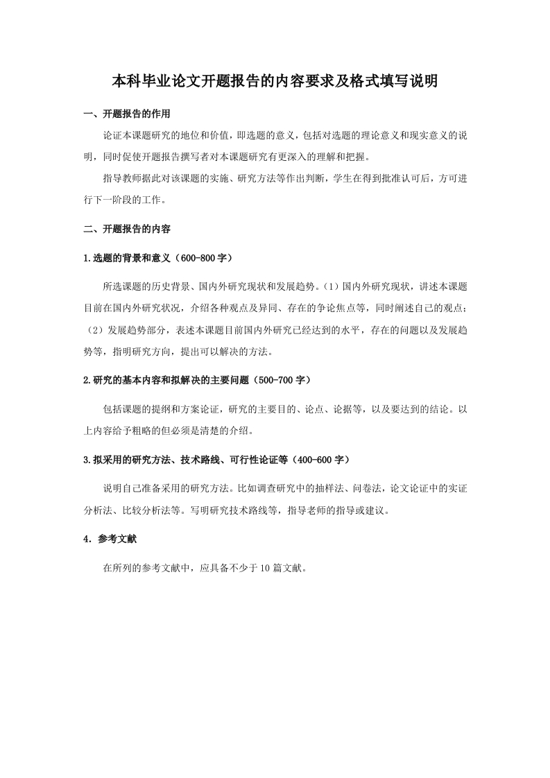 本科毕业论文开题报告的内容要求及格式填写说明一、开题报告的作用论证本课题研究的地位和价值,即选题的意义,包括对选题的理论意义和现实意义的说明,同时促使开题报告撰写者对本课题研究有更深入的理解和把握。指导教师据此对该课题的实施、研究方法等作出判断,学生在得到批准认可后,方可进行下一阶段的工作。二、开题报告的内容1.选题的背景和意义(600-800字)所选课题的历史背景、国内外研究现状和发展趋势。(1)国内外研究现状,讲述本课题目前在国内外研究状况,介绍各种观点及异同、存在的争论焦点等,同时阐述自己的观点:(2)发展趋势部分,表述本课题目前国内外研究己经达到的水平,存在的问题以及发展趋势等,指明研究方向,提出可以解决的方法。2.研究的基本内容和拟解决的主要问题(500-700字)包括课题的提纲和方案论证,研究的主要目的、论点、论据等,以及要达到的结论。以上内容给予粗略的但必须是清楚的介绍。3.拟采用的研究方法、技术路线、可行性论证等(400600字)说明自己准备采用的研究方法。比如调查研究中的抽样法、问卷法,论文论证中的实证分析法、比较分析法等。写明研究技术路线等,指导老师的指导或建议。4.参考文献在所列的参考文献中,应具备不少于10篇文献。