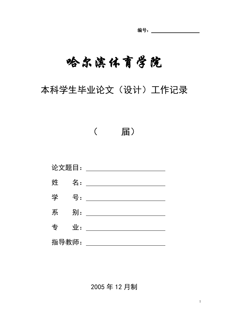 编号:哈尔滨休育学院本科学生毕业论文(设计)工作记录届)论文题目:姓名:学号:系别:专业:指导教师:2005年12月制1目录一、本科生毕业论文(设计)题目审批表二、毕业论文(设计)开题报告三、本科生毕业论文(设计)中期检查表四、本科生毕业论文(设计)指导过程记录表五、本科生毕业论文(设计)指导教师评语六、本科生毕业论文(设计)答辩记录表七、本科生毕业论文(设计)封面附件一:开题报告和接受指导态度评分标准附件二:毕业论文质量平分标准附件三:毕业论文报告和答辩能力评分标准2本科生毕业论文(设计)题目审批表学校:系别:专业:学生姓名学号指导教师职称所选题目名称:题目来源:1.科学技术☐2.生产实践☐3.社会经济☐4.自拟☐5.其他☐选题理由:指导教师意见:年月日系领导小组意见:签字:年月日备注:3