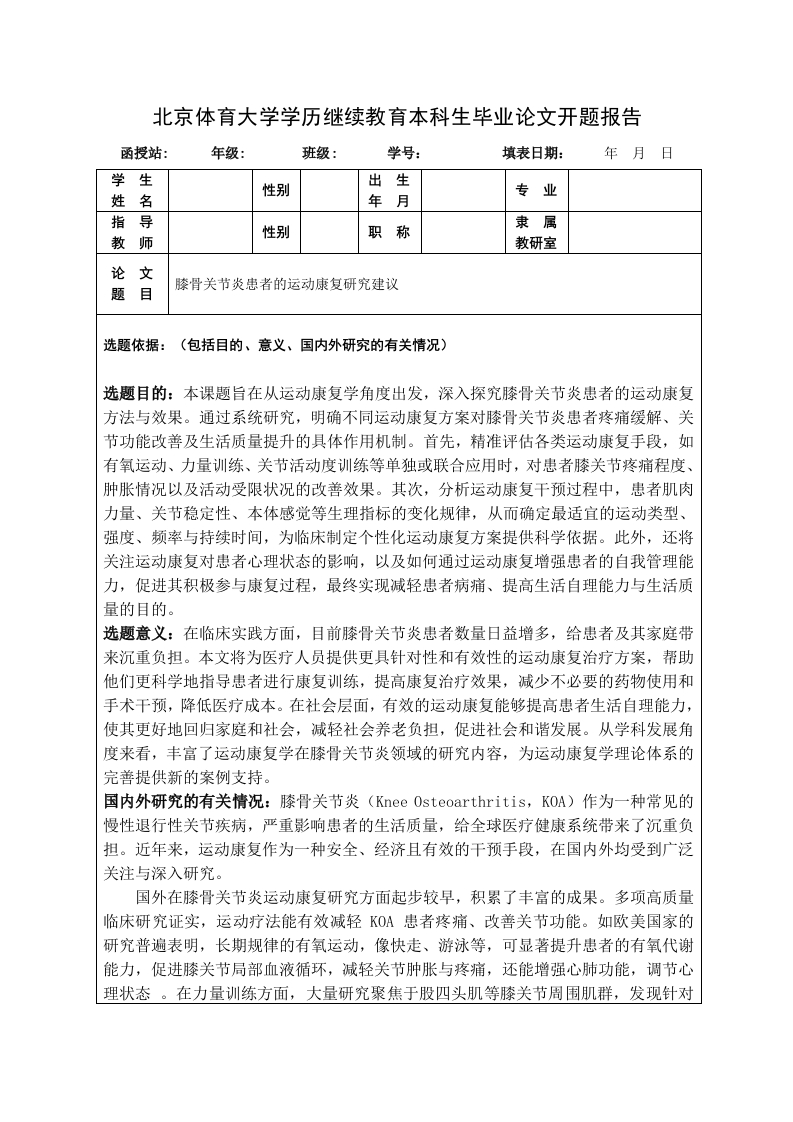 北京体育大学学历继续教育本科生毕业论文开题报告函授站:年级:班级:学号:填表日期:年月日学生性别出生专业名年月指导性别职称隶属教师教研室论文题目膝骨关节炎患者的运动康复研究建议选题依据:(包括目的、意义、国内外研究的有关情况)选题目的:本课题旨在从运动康复学角度出发,深入探究膝骨关节炎患者的运动康复方法与效果。通过系统研究,明确不同运动康复方案对膝骨关节炎患者疼痛缓解、关节功能改善及生活质量提升的具体作用机制。首先,精准评估各类运动康复手段,如有氧运动、力量训练、关节活动度训练等单独或联合应用时,对患者膝关节疼痛程度、肿胀情况以及活动受限状况的改善效果。其次,分析运动康复干预过程中,患者肌肉力量、关节稳定性、本体感觉等生理指标的变化规律,从而确定最适宜的运动类型、强度、频率与持续时间,为临床制定个性化运动康复方案提供科学依据。此外,还将关注运动康复对患者心理状态的影响,以及如何通过运动康复增强患者的自我管理能力,促进其积极参与康复过程,最终实现减轻患者病痛、提高生活自理能力与生活质量的目的。选题意义:在临床实践方面,目前膝骨关节炎患者数量日益增多,给患者及其家庭带来沉重负担。本文将为医疗人员提供更具针对性和有效性的运动康复治疗方案,帮助他们更科学地指导患者进行康复训练,提高康复治疗效果,减少不必要的药物使用和手术干预,降低医疗成本。在社会层面,有效的运动康复能够提高患者生活自理能力,使其更好地回归家庭和社会,减轻社会养老负担,促进社会和谐发展。从学科发展角度来看,丰富了运动康复学在膝骨关节炎领域的研究内容,为运动康复学理论体系的完善提供新的案例支持。国内外研究的有关情况:膝骨关节炎(Knee Osteoarthritis,KOA)作为一种常见的慢性退行性关节疾病,严重影响患者的生活质量,给全球医疗健康系统带来了沉重负担。近年来,运动康复作为一种安全、经济且有效的干预手段,在国内外均受到广泛关注与深入研究。国外在膝骨关节炎运动康复研究方面起步较早,积累了丰富的成果。多项高质量临床研究证实,运动疗法能有效减轻KO患者疼痛、改善关节功能。如欧美国家的研究普遍表明,长期规律的有氧运动,像快走、游泳等,可显著提升患者的有氧代谢能力,促进膝关节局部血液循环,减轻关节肿胀与疼痛,还能增强心肺功能,调节心理状态。在力量训练方面,大量研究聚焦于股四头肌等膝关节周围肌群,发现针对性的抗阻训练能增强肌肉力量,稳定膝关节,纠正关节应力分布异常,进而缓解疼痛、改善功能。例如,通过特定器械或弹力带进行的股四头肌锻炼,可有效提高患者膝关节的稳定性,减少日常活动中的疼痛发作频率。水中运动也是国外研究的热点方向。由于水的浮力能减轻关节负荷,阻力又可用于肌力训练,许多研究显示,水中有氧运动、水中关节活动度训练等对KOA患者效果显著。相关meta分析表明,相较于陆上运动,水中运动在短期内缓解疼痛、改善关节活动度上效果相当,且对关节冲击更小,尤其适用于病情较重、无法耐受陆上高强度运动的患者。此外,国外还深入探究运动康复的剂量效应关系,明确了适宜的运动强度、频率与持续时间对治疗效果的影响,为个性化运动处方制定提供精准依据。国内在膝骨关节炎运动康复领域的研究也在不断发展。一方面积极借鉴国外先进理念与方法,另一方面结合传统医学优势,形成了独特的研究方向。中医传统功法如太极拳、八段锦、易筋经等在KOA防治中的作用被深入挖掘。研究发现,太极拳动作缓慢、柔和,能增加膝关节活动范围,调节下肢关节力矩,强化膝关节周围肌群力量,且对关节冲击小,非常适合KOA患者长期练习。八段锦和易筋经同样可有效缓解患者疼痛,改善关节功能,同时在调节心理、减轻焦虑抑郁情绪方面也有积极作用,这与中医“身心同治”理念相契合。在现代医学研究层面,国内学者通过大量临床观察与实验,验证了运动康复对KOA患者的有效性,并在运动方案优化上取得进展。例如,将有氧运动、力量训练与关节松动术等康复技术相结合,根据患者病情、身体状况制定多维度个性化方案,进一步提高康复效果。同时,随着科技发展,国内开始利用生物力学分析、功能磁共振成像等先进技术,深入探究运动康复对膝关节生物力学、软骨代谢及神经肌肉控制等方面的作用机制,为运动康复方案的精准制定提供更坚实的理论支撑。总体而言,国内外在膝骨关节炎患者运动康复研究上已取得丰硕成果,但仍存在些问题与挑战。如不同运动康复方案的长期疗效对比、如何提高患者运动依从性、运动康复与其他治疗手段的最佳联合方式等,都有待进一步深入研究,以更好地服务于广大KOA患者,提升其生活质量。研究的主要内容及预期结果主要研究内容:一、引言(一)研究背景(二)研究意义二、膝骨关节炎患者运动康复现状(一)运动康复的应用情况(二)运动康复的效果三、膝骨关节炎患者运动康复存在的问题(一)康复方案问题(二)患者依从性问题(三)专业人员与资源问题四、改善膝骨关节炎患者运动康复的对策(一)优化康复方案(二)提高患者依从性(三)加强专业人员培养与资源建设五、结论与展望(一)总结(二)展望预期结果:明确运动康复方案中缺乏个性化和科学依据的具体