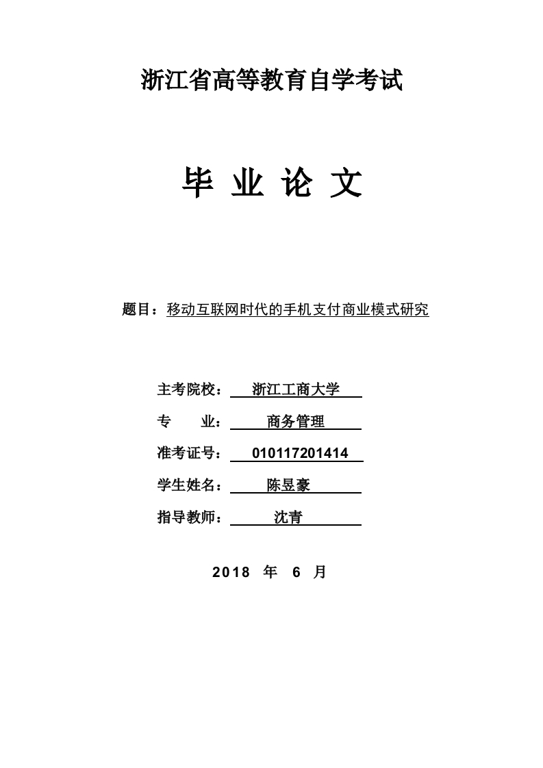 浙江省高等教育自学考试毕业论文题目:移动互联网时代的手机支付商业模式研究主考院校:浙江工商大学专商务管理准考证号:010117201414学生姓名:陈昱豪指导教师:沈青2018年6月目录(一)移动支付商业模式研究背景二、文献综述2(一)移动互联网相关文献综述..2(二)电子支付相关文献综述(三)商业模式相关文献综述3三、移动支付概述及其分类(一)移动支付定义(二)移动支付分类…4(三)支付宝简介四、中国移动支付业务商业模式现状(一)以移动运营商为运营主体的商业模式.5(二)以银联为运营主体的商业模式(三)以银行为运营主体的商业模式…(四)以独立第三方服务提供商为运营主体的商业模式.6(五)支付宝的商业模式五、国内移动支付的SWOT分析(一)移动支付的优势.…(二)移动支付的劣势(三)移动支付机会分析(四)移动支付威胁分析六、移动支付商业模式的建议口(一)完善性商业模式创新(二)改良性商业横式创新…(三)颠覆性商业模式创新(四)支付宝的商业模式创新…七、结束语….10参考文献:移动互联网时代的手机支付商业模式研究作者:陈昱豪指导老师:沈青摘要:信息技术的不断进步和电子商务产业的飞速发展,在客观上导致了手机普及率的不断提升。我们必须认识到,当前手机已经成为我们生产、生活中不可或缺的重要工具,也同样是我们娱乐、工作的重要电子产品之一。无可否认的是,手机支付产品在生活和生产中的大规模应用,已经极大的改变了我们的生活方式乃至思维方式。而这种改变对于经济结构的优化以及更多方面的影响都是客观存在的,理应得到我们的重视和肯定。本研究中,以常见手机支付运营模式为出发点和落脚点,对其进行了较为完整而全面的对比分析,并以此为基础给出了具体的应对措施和解决方案,为我国手机支付业务的完善做出了积极的探索。口在本文研究中,较为系统的分析了当前的常见商业模式,并通过Swot分析法,对我国市场基本情况进行了较为全面的解构,然后将商业模式创新理论引入移动支付产业发展的研究中来,给出了一系列具有较强可操作性的意见和建议。关键词:移动支付:商业模式;相互合作;商业模式一、前言随着我国3G技术的大规模普及和金融支付环境的不断创新、完善,移动支付已经成为当前阶段广受各界关注的热点问题,移动支付市场庞大的市场潜力也同样得到了各方面的广泛重视。而移动支付产业的进一步发展,必然需要跨行业合作为依托。移动支付运营商在市场竞争中,只有全面开展合作商业运营模式,才能够抢占更多的市场份额,提升自身的整体市场竞争力。当前阶段,中国银联、银行和第三方支付平台以及电信运营商为主体的四种模式,在实际的操作过程中仍然客观上存在如问题:本身在技术和资本等方面的局限性,决定了单独一方无法在更大范围内开展移动支付服务。而这种情况的客观存在,直接导致了我国移动支付整体发展水平仍然处于较低水平的一个重要原因。而纵观西方国家的移动支付发展经验则不难看出,双赢甚至供应的合作机制,才是保证移动支付能够在大规模商业运行之后取得稳定发展的基础和