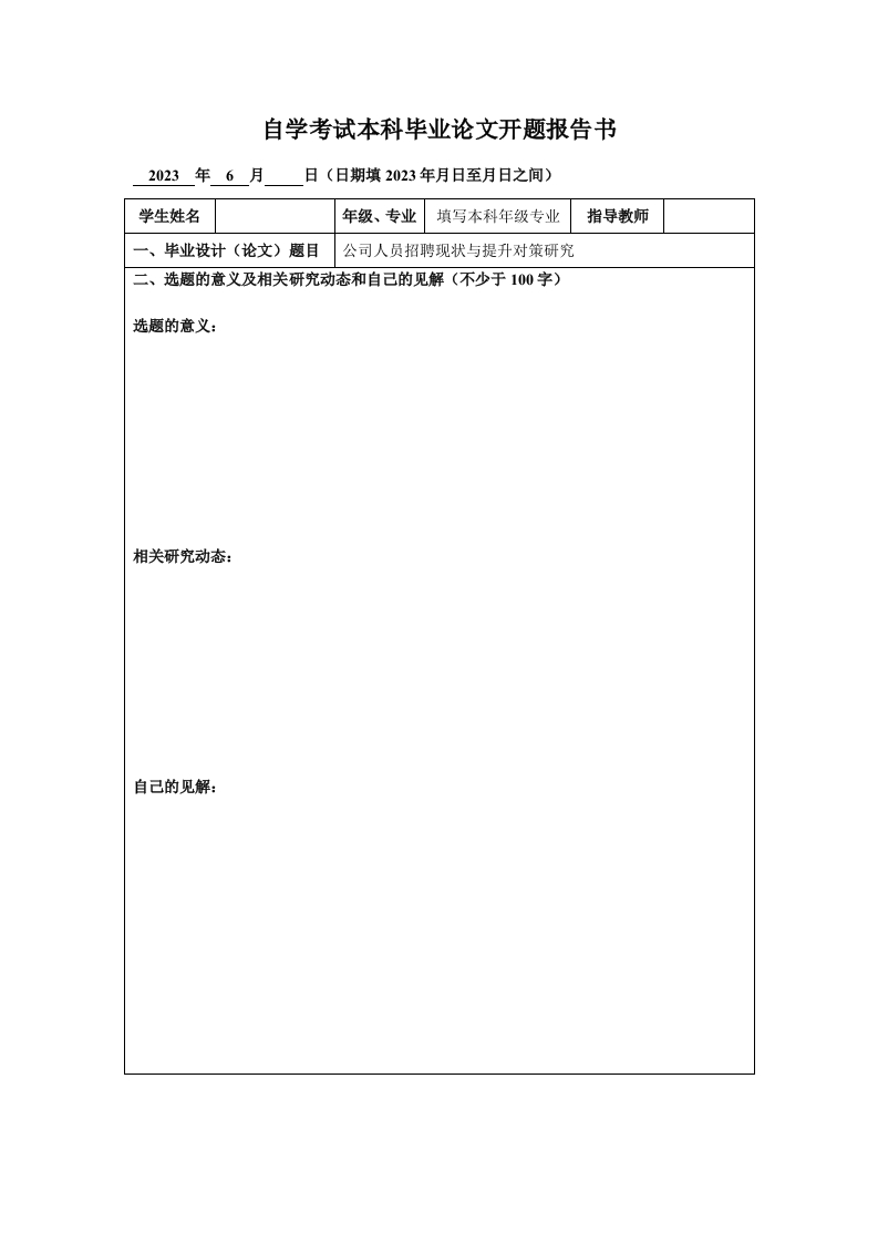 自学考试本科毕业论文开题报告书2023年6月日(日期填2023年月日至月日之间)学生姓名年级、专业填写本科年级专业指导教师一、毕业设计(论文)题目公司人员招聘现状与提升对策研究二、选题的意义及相关研究动态和自己的见解(不少于100字)选题的意义:相关研究动态:自己的见解:三、论文提纲和参考文献论文提纲(本题主要内容,不少于100字):完成的期限和采取的主要措施(不少于100字):主要参考文献书目(不少于100字):指导教师签名:日期:年月日