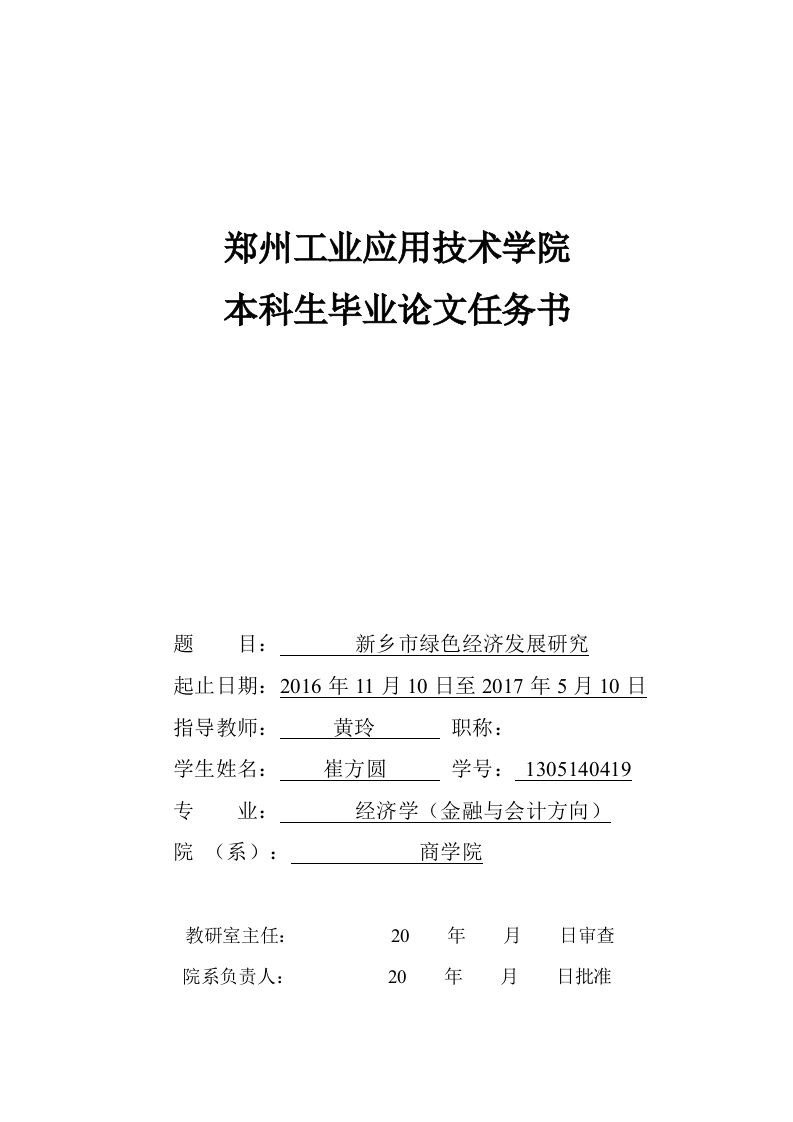 郑州工业应用技术学院本科生毕业论文任务书题新乡市绿色经济发展研究起止日期:2016年11月10日至2017年5月10日指导教师:黄玲职称:学生姓名:崔方圆学号:1305140419专业:经济学(金融与会计方向)院(系):商学院教研室主任:20年月日审查院系负责人:20年月日批准任务书填写要求1.毕业设计(论文)任务书由指导教师根据各课题的具体情况填写,经学生所在专业的负责人审查,院(系部)领导签字后生效。此任务书应在毕业设计(论文)开始前一周填好发给学生。2.任务书内容必须用黑墨水笔工整书写或按教务处统一设定的电子文档标准格式(可从教务处网站下载)打印,不得随便涂改或潦草书写,禁止打印在其它纸上后剪贴。3.任务书填写的内容,必须和学生毕业设计(论文)完成的情况相一致,若有变更,应当经过所在专业及院(系部)的主管领导审批后方可重新填写。4任务书内有关“院(系部)”“专业”等名称的填写,应写中文全称。学生的学号要写全号。5.有关年月日的填写,一律用阿拉伯数字书写。如“2012年8月16日”或“2012-08-16”。毕业论文任务书课题名称南方航空资本运作模式分析1理工类:工程设计();工程技术实验研究型(课题性质课题学类(课题类型课题来源1.毕业论文主要内容主要内容:(1)中国现有国情和实施绿色经济背景介绍的相关理论,以及为什么要实行绿色(2)新乡市进行绿色经济发展取得成就和受到制约方面,采取对应的解决办法;(3)怎样贯彻绿色经济发展以及实行绿色经济发展的意义。2.毕业论文要求(1)结合经济学专业,从现有国情出发,研究新乡市绿色经济发展,对相关理论进行系统梳理;(2)思路清晰,秉着发现问题,解决问题的思路,在参考大量文献的基础上,扩充大纲里面的每一块内容;(3)论文观点明确,论据确凿,论证充分,结构完整,层次分明:(4)论文字数符合要求,不得抄袭。3.毕业论文主要文献,资料和参考书[1]朱启贵.“绿色+”:中国可持续发展的全新战略思维[J].人民论坛·学术前沿,2016,03[2]陈文娟.论绿色经济视域下的低碳经济发展[J].中国集体经济,2016,04[3]林永生.“一带一路”战略背景下的中国省域绿色发展:现状、问题与对策[J]中国环境管理,2016,02.[4]刘涛.浅议节约型视角下的绿色财政税收政策[J].现代商业,2016,17