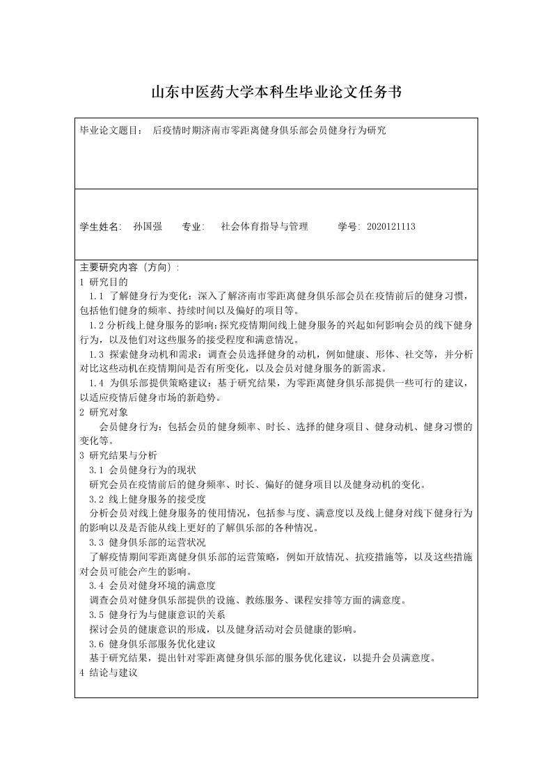 山东中医药大学本科生毕业论文任务书毕业论文题目:后疫情时期济南市零距离健身俱乐部会员健身行为研究学生姓名:孙国强专业:社会体育指导与管理学号:2020121113主要研究内容(方向):1研究目的1.1了解健身行为变化:深入了解济南市零距离健身俱乐部会员在疫情前后的健身习惯,包括他们健身的频率、持续时间以及偏好的项目等。1.2分析线上健身服务的影响:探究疫情期间线上健身服务的兴起如何影响会员的线下健身行为,以及他们对这些服务的接受程度和满意情况。1.3探索健身动机和需求:调查会员选择健身的动机,例如健康、形体、社交等,并分析对比这些动机在疫情期间是否有所变化,以及会员对健身服务的新需求。1.4为俱乐部提供策略建议:基于研究结果,为零距离健身俱乐部提供一些可行的建议,以适应疫情后健身市场的新趋势。2研究对象会员健身行为:包括会员的健身频率、时长、选择的健身项目、健身动机、健身习惯的变化等。3研究结果与分析3.1会员健身行为的现状研究会员在疫情前后的健身频率、时长、偏好的健身项目以及健身动机的变化。3.2线上健身服务的接受度分析会员对线上健身服务的使用情况,包括参与度、满意度以及线上健身对线下健身行为的影响以及是否能从线上更好的了解俱乐部的各种情况。3.3健身俱乐部的运营状况了解疫情期间零距离健身俱乐部的运营策略,例如开放情况、抗疫措施等,以及这些措施对会员可能会产生的影响。3.4会员对健身环境的满意度调查会员对健身俱乐部提供的设施、教练服务、课程安排等方面的满意度。3.5健身行为与健康意识的关系探讨会员的健康意识的形成,以及健身活动对会员健康的影响。3.6健身俱乐部服务优化建议基于研究结果,提出针对零距离健身俱乐部的服务优化建议,以提升会员满意度。4结论与建议主要研究方法、技术指标:1主要研究方法1.1文献综述法查阅相关文献,了解健身行为研究的历史、现状以及理论框架,为研究提供理论支撑。1.2问卷调查法设计一份详细的问卷,包含会员的基本信息、健身频率、偏好、动机、对线上健身服务的使用情况和满意度等。通过线上和线下渠道分发给会员,收集数据。1.3深度访谈法选择一部分会员进行深度访谈,深入了解他们的个人健身经历、对健身俱乐部和健身服务的看法。1.4观察法在健身俱乐部进行实地观察,记录会员的健身活动、互动情况以及使用设施的行为,以获取更多的信息。参考文献(资料):[1]潘一鸣.上海市CrossFit健身俱乐部的经营与管理现状研究[D].上海师范大学,2020.[2]卢佳佳.“互联网+”乌鲁木齐商业体育场馆运营管理现状研究[D].新疆师范大学,2019.[3]吴倩.昆明市健身俱乐部私人教练职业需求现状研究[D].云南师范大学,2018.[4]董嘉嘉.武汉市健身俱乐部私人健身教练职业的现状研究[D].华中师范大学,2014.[5]刘娟.宿州市高校周边健身俱乐部营销现状研究一一以宿州学院周边的摩尔健身俱乐部营销现状为例[J刀.西昌学院学报(自然科学版),2014,28(01):106-109.[6]赵德勋,翟凤鸣,张义飞等.石家庄市健身俱乐部经营管理现状研究[J刀.经济师,2012,(11):232-233.[7]赵少平.武汉市经营性体育健身俱乐部服务质量现状研究[J刀.科技信息,2011,(05):116+55.[8]仝小棠.北京市健身俱乐部会员满意度的现状研究[D].北京体育大学,2008.[9]钱金阳.后疫情时代成都市搏击俱乐部运营现状调查与对策研究[D].成都体育学院,[10]刘一凡.后疫情时期健身俱乐部运营模式转型策略研究[D].鲁东大学,2023.[11]陈琳,朱寒笑.机遇与挑战:后疫情时代商业型健身俱乐部的发展[J刀.辽宁体育科技,2022,44(04):17-23.[12]李虔湘.“互联网+”背景下大众健身新模式探讨[D].江西师范大学,2022.[13]许白洁.疫情防控常态化背景下武汉市健身俱乐部发展研究[D].湖北大学,2021.[14]吴越,左为东.新冠疫情下商业健身俱乐部运营的困境与应对策略[J刀.湖北体育科技,2021,40(04):300-302+363.[15]尹开宁.后疫情时期健身俱乐部的发展策略探究[J刀.现代商贸工业,2020,41(22):54-55.时间安排计划:1.第一阶段(2023年12月-2024年1月):论文选题、任务书、开题报告2.第二阶段(2024年1月-2024年2月):论文资料整理收集3.第三阶段(2024年2月-2024年3月):中期检查表4.第四阶段(2024年3月-2024年4月):论文初稿5.第五阶段(2024年4月-2024年5月):论文定稿6.第六阶段(2024年6月):论文答辩指导教师签字:2024年2月28日学院意见:盖章:年月日注:此表由指导教师填写(学院意见一栏除外)