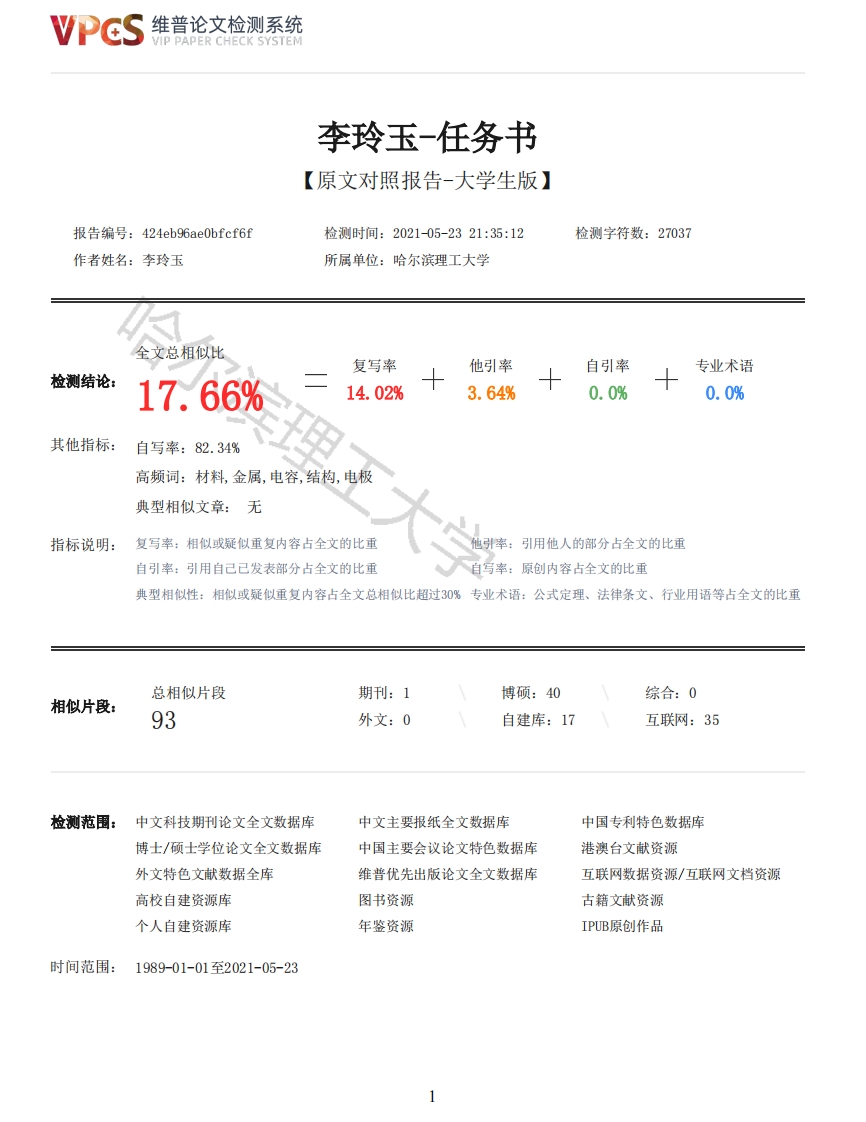 维普论文检测系统VIP PAPER CHECK SYSTEM李玲玉-任务书【原文对照报告-大学生版】报告编号:424eb96ae0bfcf6f检测时间:2021-05-2321:35:12检测字符数:27037作者姓名:李玲玉所属单位:哈尔滨理工大学全文总相似比复写率他引率自引率专业术语检测结论:17.66%14.02%3.64%0.0%0.0%其他指标:自写率:82.34%高频词:材料,金属,电容,结构,电极典型相似文章:无指标说明:复写率:相似或疑似重复内容占全文的比重引用他人的部分占全文的比重自引率:引用自己已发表部分占全文的比重自写率:原创内容占全文的比重典型相似性:相似或疑似重复内容占全文总相似比超过30%专业术语:公式定理、法律条文、行业用语等占全文的比重总相似片段期刊:1博硕:40综合:0相似片段:93外文:0自建库:17互联网:35检测范围:中文科技期刊论文全文数据库中文主要报纸全文数据库中国专利特色数据库博士/硕士学位论文全文数据库中国主要会议论文特色数据库港澳台文献资源外文特色文献数据全库维普优先出版论文全文数据库互联网数据资源/互联网文档资源高校自建资源库图书资源古籍文献资源个人自建资源库年鉴资源IPUB原创作品时间范围:1989-01-01至2021-05-23维普论文检测系统VIP PAPER CHECK SYSTEM原文对照颜色标注说明:■自写片段■复写片段(相似或疑似重复)引用片段(引用)■专业术语(公式定理、法律条文、行业用语等)哈尔滨理工大学毕业设计题目:金属钛菁@碳复合材料的电化学研究院、系:材料科学与化学工程学院姓名:李玲玉指导教师:谭立超系主任:武文菊2021年6月15日金属钛菁@碳复合材料的电化学研究摘要随着世界上人口的数量越来越多,那么对资源的需求必然也是日益增多的。我国是人口数量最多的国家,但是资源非常有限。针对化石资源来讲,其总量是一定的,我们用一点就会少一点。而且燃烧化石能源无疑也会对其所在地周围的环境产生严重污染,例如会产生一些废气、烟尘等等。其中化石能源一个重要的应用就是火力发电。那么提高电能的存储和转换效率对可持续发展来说是一个重要方面,所以人们选择研究一种新型能源装置。超级电容器是近几年新兴起的一种电化学器件。相对于传统电容器,超级电容器拥有更广的温度使用范围、更大的功率密度、更长的使用寿命等优点,在各式各样的储能器件中占据一席之地。目前,尽管超级电容器有很多优势,但是大批量生产却仍然存在一些问题。这就需要对电容器进行改进,首先就是着眼于电极。作为电容器的至关重要构成元件,对电极材料的改进处理将会对电容器性能有非常大的提升。酞菁及其衍生物具有典型的中心金属原子和四个氮配体配位的结构,这有利于电子的快速运输。其中,铁和酞菁相互作用能够生成金属酞菁,赋予酞菁改进的性能,如在储能和电化学传感等方面。但是酞菁铁的稳定性较差,为了使电极材料显示更好的稳定性,引入C0一MOF(ZIF-67),其中的钴原子在化学反应过程中不受过氧化物的影响,然后采用高温煅烧法将金属酞菁、ZIF-67以及碳材料复合在一起,从而达到提高超级电容器比容量和循环性能的目的。关键词金属酞菁:超级电容器:ZIF-67:碳复合材料Electrochemical research on titanium cyanine@carbon compositesAbstructWith the increasing number of people in the world,then the demand for resources is bound to beincreasing.China is the country with the largest population,but its resources are very limited.Forfossil resources,the total amount is limited if we use it a little,we'll use it a little less.And burning fossil energy will undoubtedly be on the side of its location,The environment producesserious pollution,such as some exhaust gas,soot and so on.Among them,one of the most importantfossil energy sources is fossil energy.Applications are thermal power generation.Then it isimportant to improve the storage and conversion efficiency of electric energy for sustainable2维普论文检测系统VIP PAPER CHECK SYSTEMdevelopment.On the other hand,people choose to study a new type of energy device.Supercapacitorsare a new rise in recent years.As a kind of electrochemical device,Compared with traditionalcapacitors,supercapacitors have a wider range of temperature applications and a larger range ofapplications.The advantages of power density and longer service life occupy a place in a variety ofenergy storage devices.At present,although supercapacitors have many advantages,there are still some problems in massproduction.This requires the improvement of capacitors,the first is to focus on the electrode.As avital composition of capacitors.The improvement of electrode material will greatly improve theperformance of capacitors.Phthalocyanine and its Derivatives.It has a typical structure ofcoordination between the central metal atom and four nitrogen ligands,which is beneficial to therapid transport of electrons.Lose.Among them,the interaction between iron and phthalocyanine can form metal phthalocyanine,and the improved performance of phthalocyanine is improved,such as in storage.Energy andelectrochemical sensing.However,the stability of iron phthalocyanine is poor,in order to make theelectrode material show better Stability,Co-MOF (ZIF-67)is introduced,in which Co atoms are notperoxide in the process of chemical reaction.The influence of the substance,and then the metalphthalocyanine,ZIF-67 and carbon materials are combined by high temperature calcination method,andthen the metal phthalocyanine,the metal phthalocyanine and the carbon material are combined fromthe purpose of improving the specific capacity and cycle performance of supercapacitors is toachieve the purpose of improving