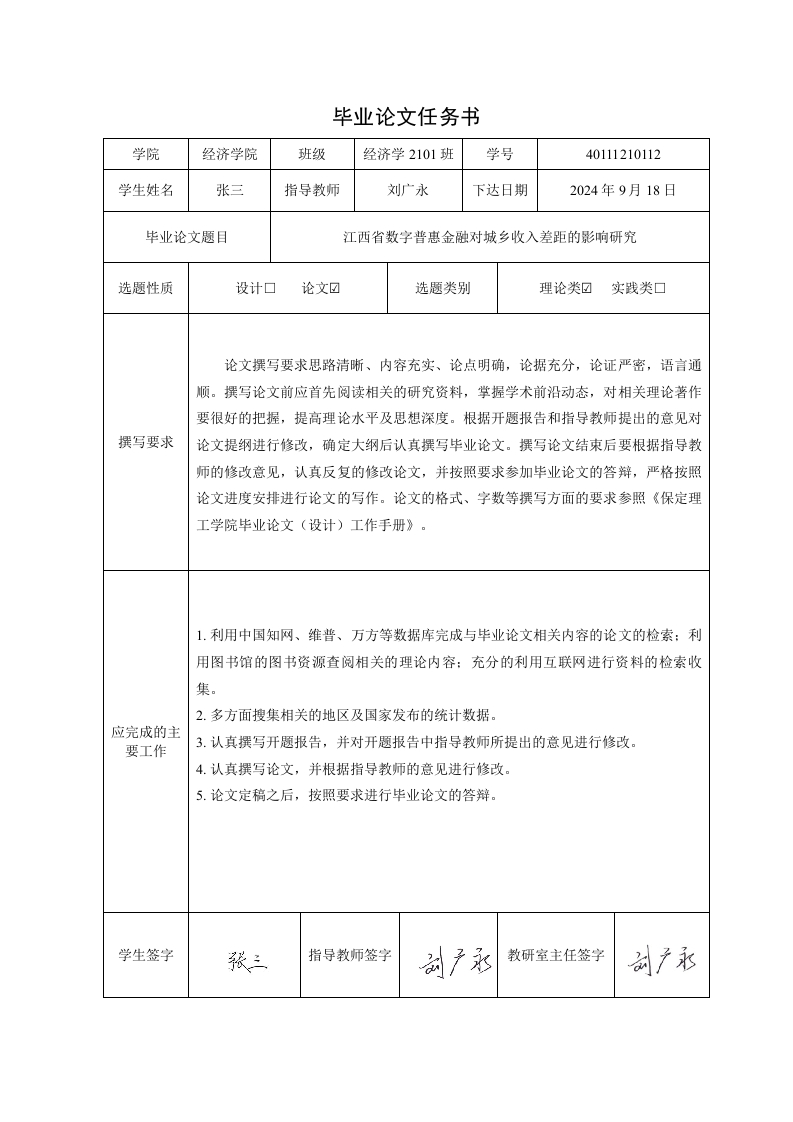 毕业论文任务书学院经济学院班级经济学2101班学号40111210112学生姓名张三指导教师刘广永下达日期2024年9月18日毕业论文题目江西省数字普惠金融对城乡收入差距的影响研究选题性质设计口论文回选题类别理论类☑实践类口论文撰写要求思路清晰、内容充实、论点明确,论据充分,论证严密,语言通顺。撰写论文前应首先阅读相关的研究资料,掌握学术前沿动态,对相关理论著作要很好的把握,提高理论水平及思想深度。根据开题报告和指导教师提出的意见对撰写要求论文提纲进行修改,确定大纲后认真撰写毕业论文。撰写论文结束后要根据指导教师的修改意见,认真反复的修改论文,并按照要求参加毕业论文的答辩,严格按照论文进度安排进行论文的写作。论文的格式、字数等撰写方面的要求参照《保定理工学院毕业论文(设计)工作手册》。1.利用中国知网、维普、万方等数据库完成与毕业论文相关内容的论文的检索:利用图书馆的图书资源查阅相关的理论内容:充分的利用互联网进行资料的检索收集。2.多方面搜集相关的地区及国家发布的统计数据。应完成的主要工作3.认真撰写开题报告,并对开题报告中指导教师所提出的意见进行修改。4.认真撰写论文,并根据指导教师的意见进行修改。5.论文定稿之后,按照要求进行毕业论文的答辩。学生签字指导教师签字教研室主任签字