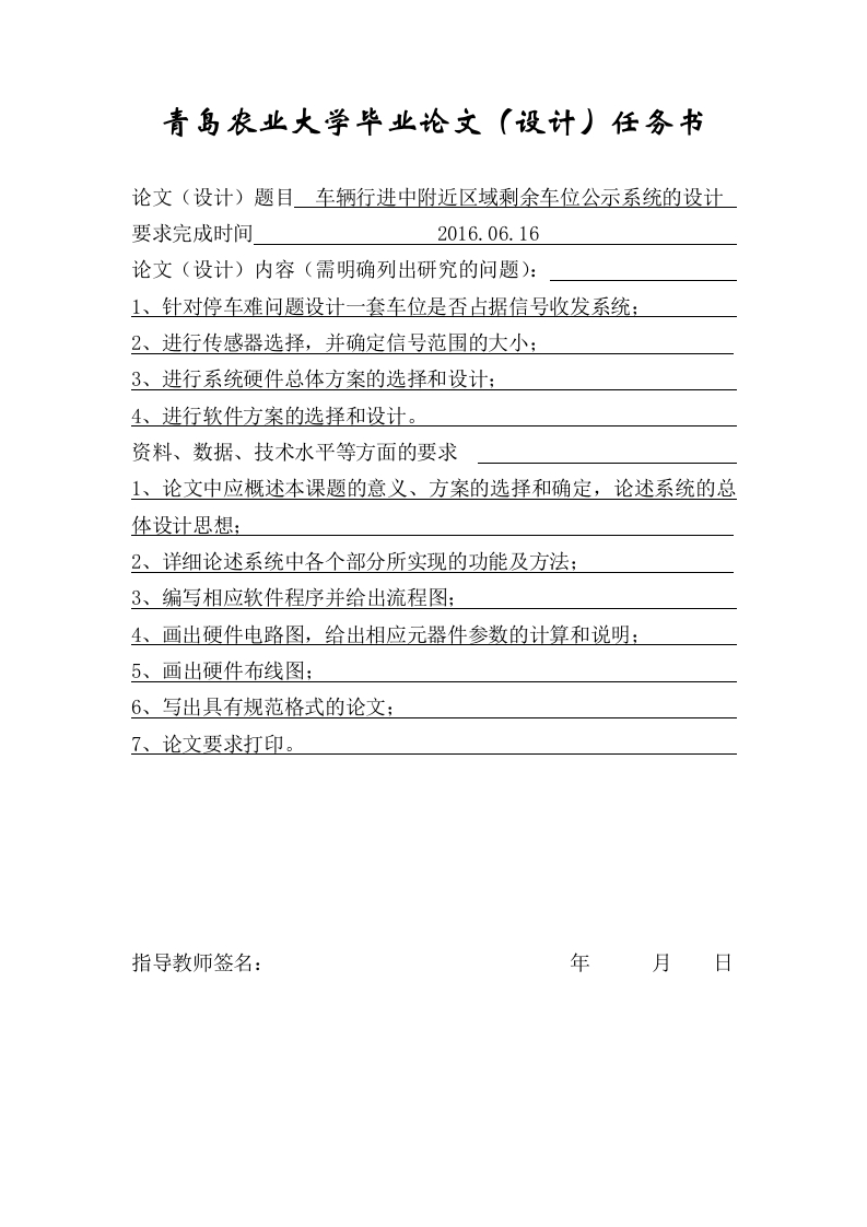 青岛农业大学毕业论文(设计)任务书论文(设计)题目车辆行进中附近区域剩余车位公示系统的设计要求完成时间2016.06.16论文(设计)内容(需明确列出研究的问题):1、针对停车难问题设计一套车位是否占据信号收发系统:2、进行传感器选择,并确定信号范围的大小:3、进行系统硬件总体方案的选择和设计:4、进行软件方案的选择和设计。资料、数据、技术水平等方面的要求1、论文中应概述本课题的意义、方案的选择和确定,论述系统的总体设计思想:2、详细论述系统中各个部分所实现的功能及方法:3、编写相应软件程序并给出流程图:4、画出硬件电路图,给出相应元器件参数的计算和说明:5、画出硬件布线图:6、写出具有规范格式的论文:7、论文要求打印指导教师签名:年月日