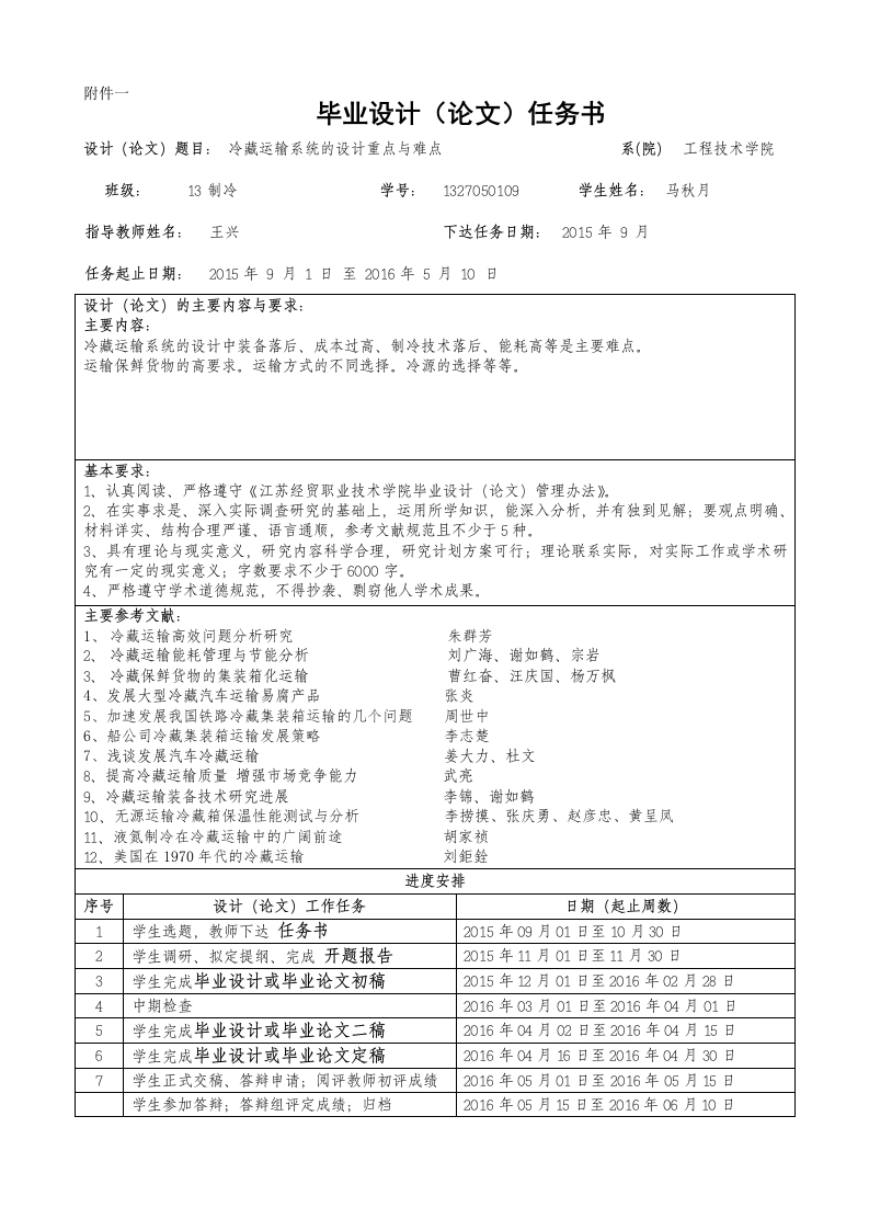 附件一毕业设计(论文)任务书设计(论文)题目:冷藏运输系统的设计重点与难点系(院)工程技术学院班级:13制冷学号:1327050109学生姓名:马秋月指导教师姓名:王兴下达任务日期:2015年9月任务起止日期:2015年9月1日至2016年5月10日设计(论文)的主要内容与要求:主要内容:冷藏运输系统的设计中装备落后、成本过高、制冷技术落后、能耗高等是主要难点。运输保鲜货物的高要求。运输方式的不同选择。冷源的选择等等。基本要求:1、认真阅读、严格遵守《江苏经贸职业技术学院毕业设计(论文)管理办法》。2、在实事求是、深入实际调查研究的基础上,运用所学知识,能深入分析,并有独到见解;要观点明确、材料详实、结构合理严谨、语言通顺,参考文献规范且不少于5种。3、具有理论与现实意义,研究内容科学合理,研究计划方案可行;理论联系实际,对实际工作或学术研究有一定的现实意义;字数要求不少于6000字,4、严格遵守学术道德规范,不得抄袭、别窃他人学术成果。主要参考文献:1、冷藏运输高效问题分析研究朱群芳2、冷藏运输能耗管理与节能分析刘广海、谢如鹤、宗岩3、冷藏保鲜货物的集装箱化运輸曹红奋、汪庆国、杨万枫4、发展大型冷藏汽车运输易腐产品张炎5、加速发展我国铁路冷藏集装箱运输的几个问题周世中6、船公司冷藏集装箱运输发展策略李志楚7、浅谈发展汽车冷藏运输姜大力、杜文8、提高冷藏运输质量增强市场竞争能力武亮9、冷藏运输装备技术研究进展李锦、谢如鹤10、无源运输冷藏箱保温性能测试与分析李横摸、张庆勇、赵彦忠、黄呈风11、液氮制冷在冷藏运输中的广阔前途胡家祯12、美国在1970年代的冷藏运输刘鉅銓进度安排序号设计(论文)工作任务日期(起止周数)1学生选题,教师下达任务书2015年09月01日至10月30日2学生调研、拟定提纲、完成开题报告2015年11月01日至11月30日3学生完成毕业设计或毕业论文初稿2015年12月01日至2016年02月28日中期检查2016年03月01日至2016年04月01日学生完成毕业设计或毕业论文二稿2016年04月02日至2016年04月15日学生完成毕业设计或毕业论文定稿2016年04月16日至2016年04月30日7学生正式交稿、答辩申请;阅评教师初评成绩2016年05月01日至2016年05月15日学生参加答辩:答辩组评定成绩;归档2016年05月15日至2016年06月10日任务下达人(签字)同意开题同意开题任务接受人教研室主任(签字):系部签章(签字)2010年9月28日2010年9月30日注:此任务书由指导教师填写,选题完成后下达给学生,